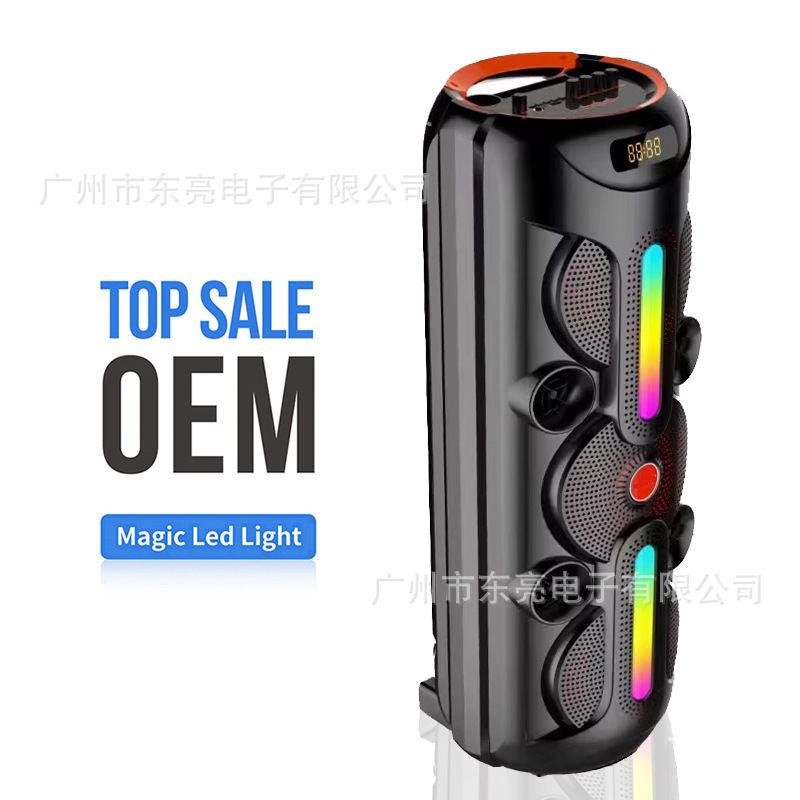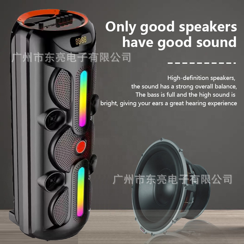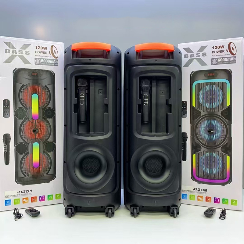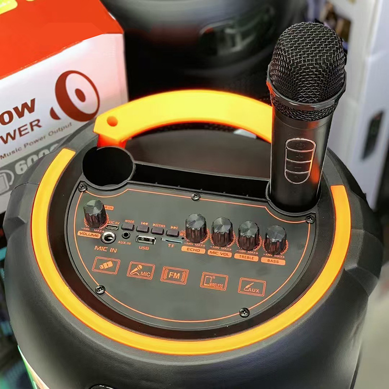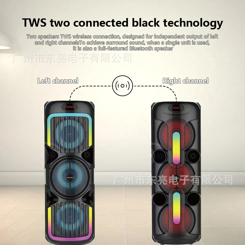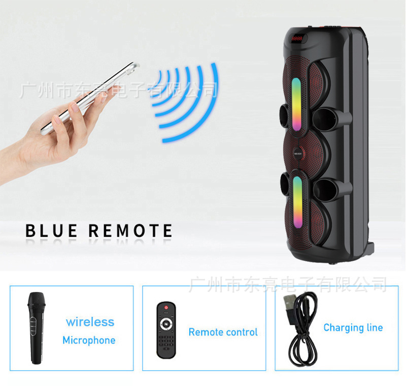 Supports USB/TF/FM/AUX/Bluetooth/TWS, true stereo sound, private rechargeable wireless microphone with microphone function. Equipped with remote control function. Knob master volume control, with large display screen, flame light, and wheels
