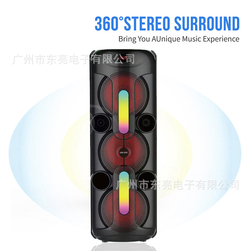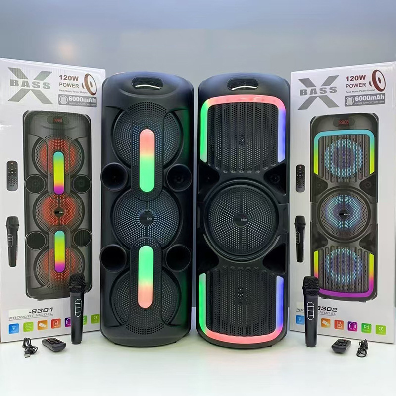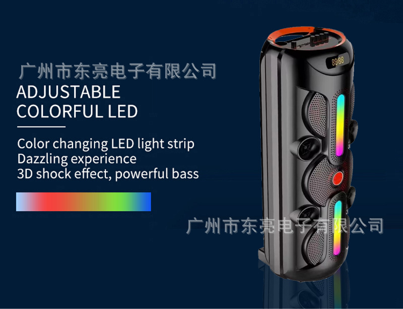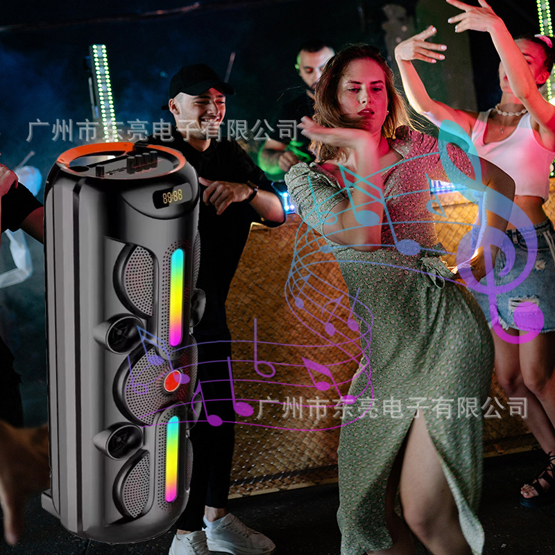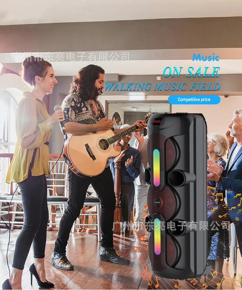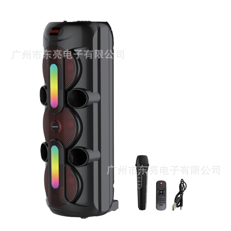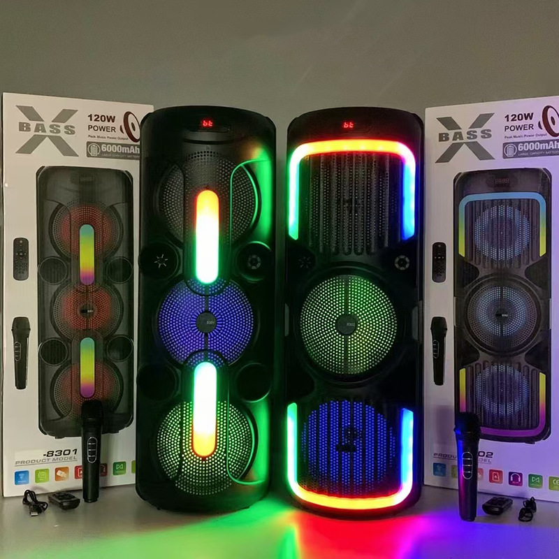 Supports USB/TF/FM/AUX/Bluetooth/TWS, true stereo sound, private rechargeable wireless microphone with microphone function. Equipped with remote control function. Knob master volume control, with large display screen, flame light, and wheels