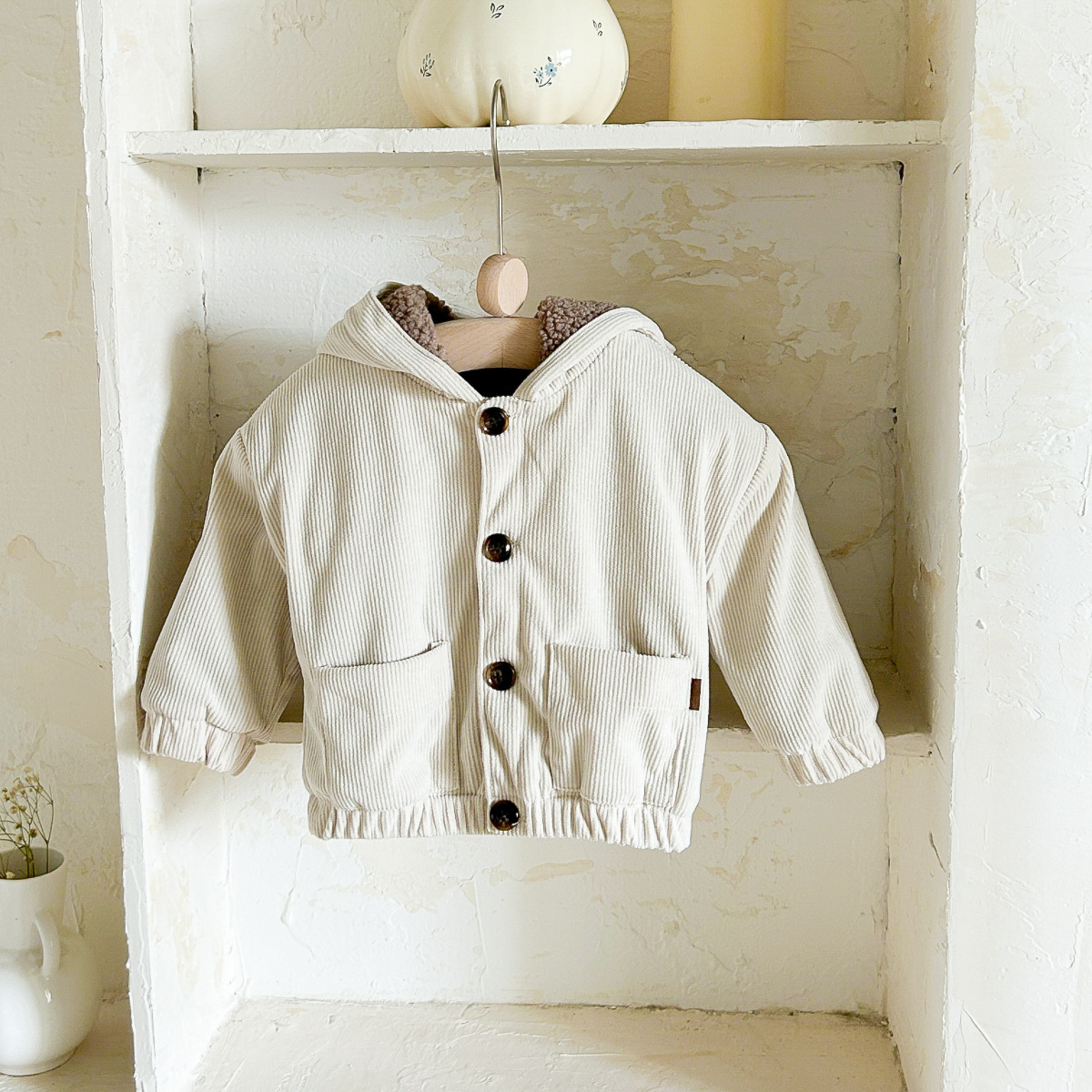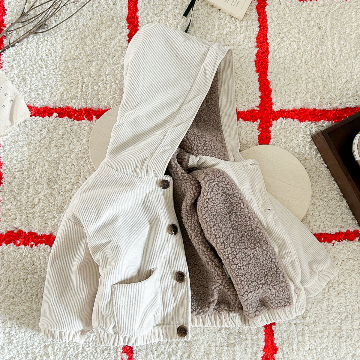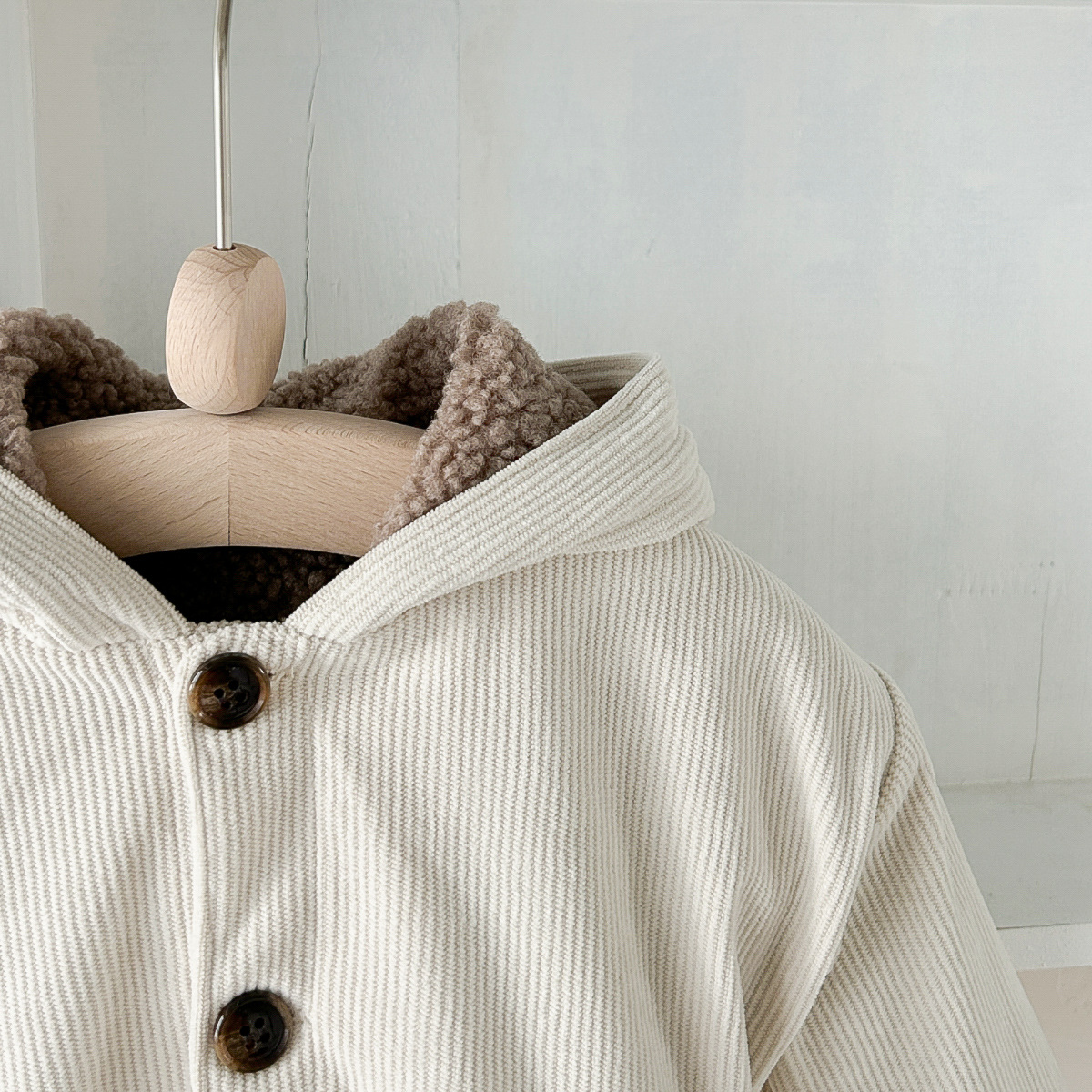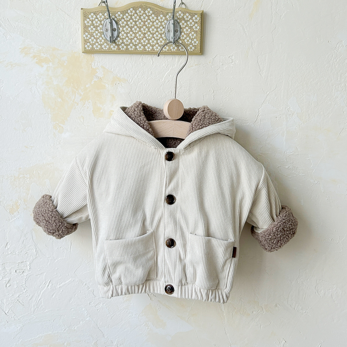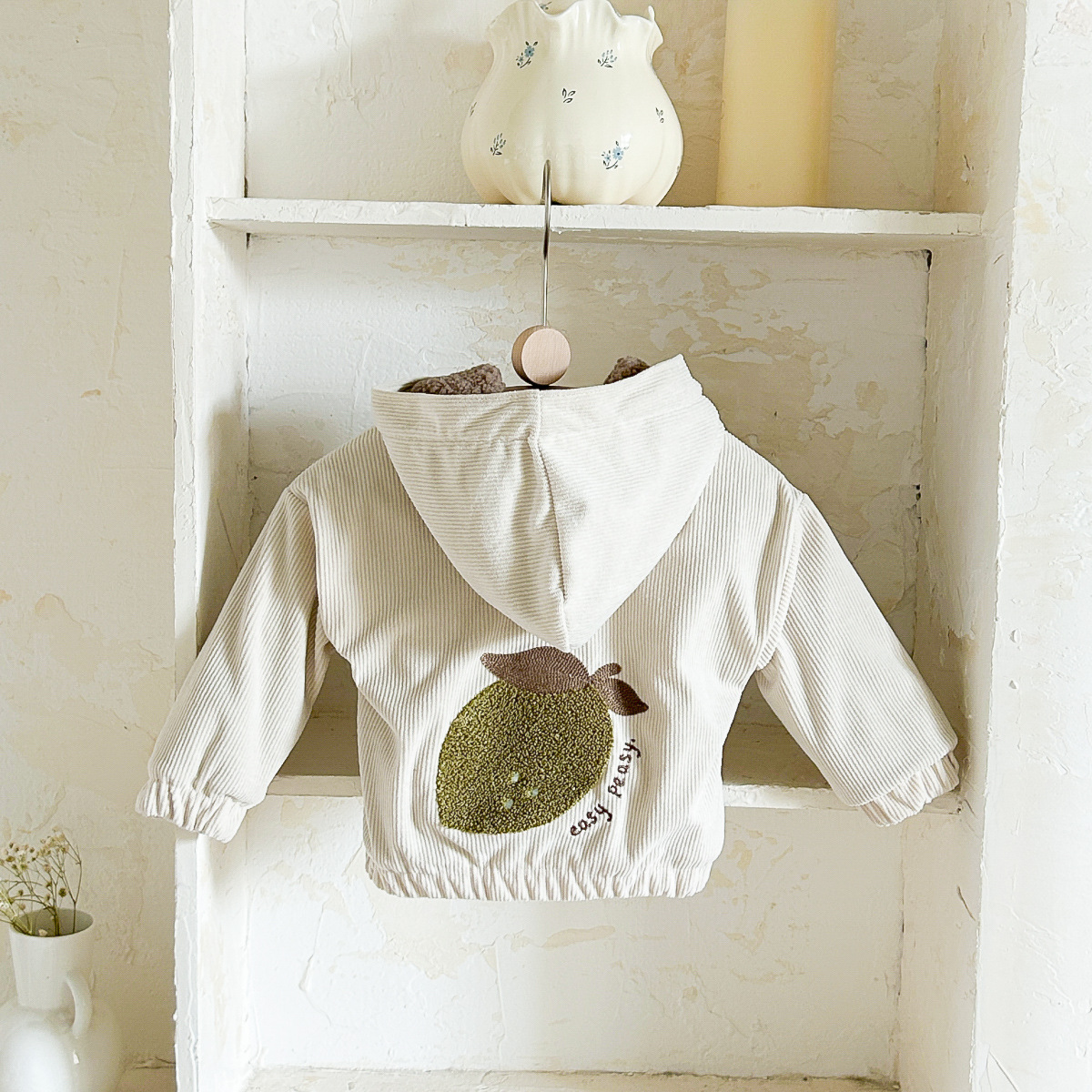 가을과 겨울 아기 귀여운 과일 패치 버튼 후드 긴 소매 기모 두꺼운 따뜻한 편안한 포켓 아기 외부