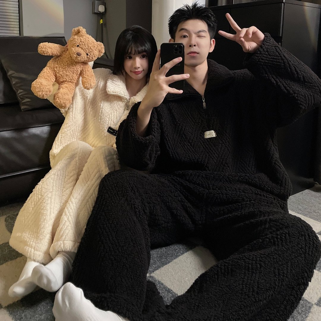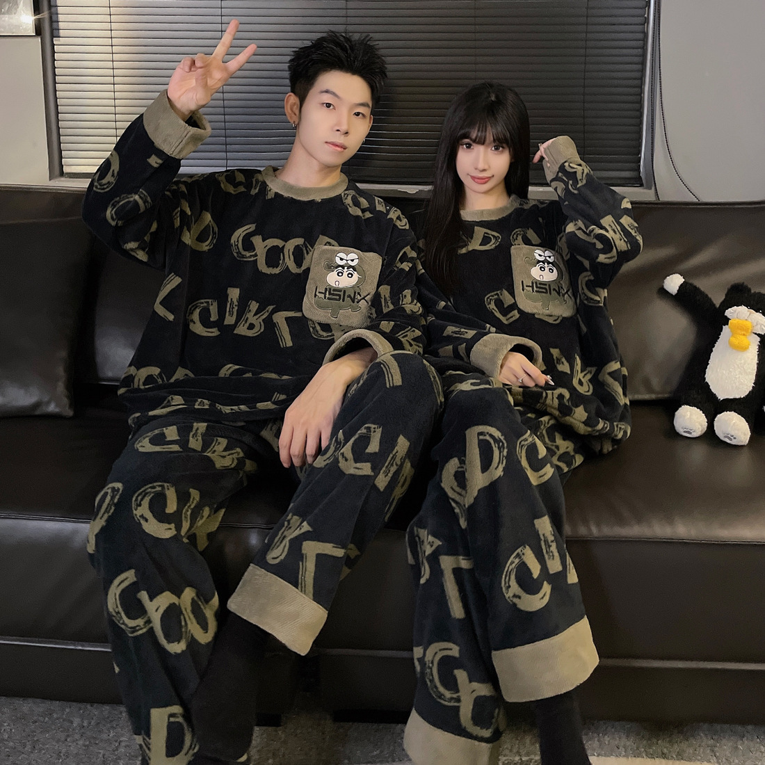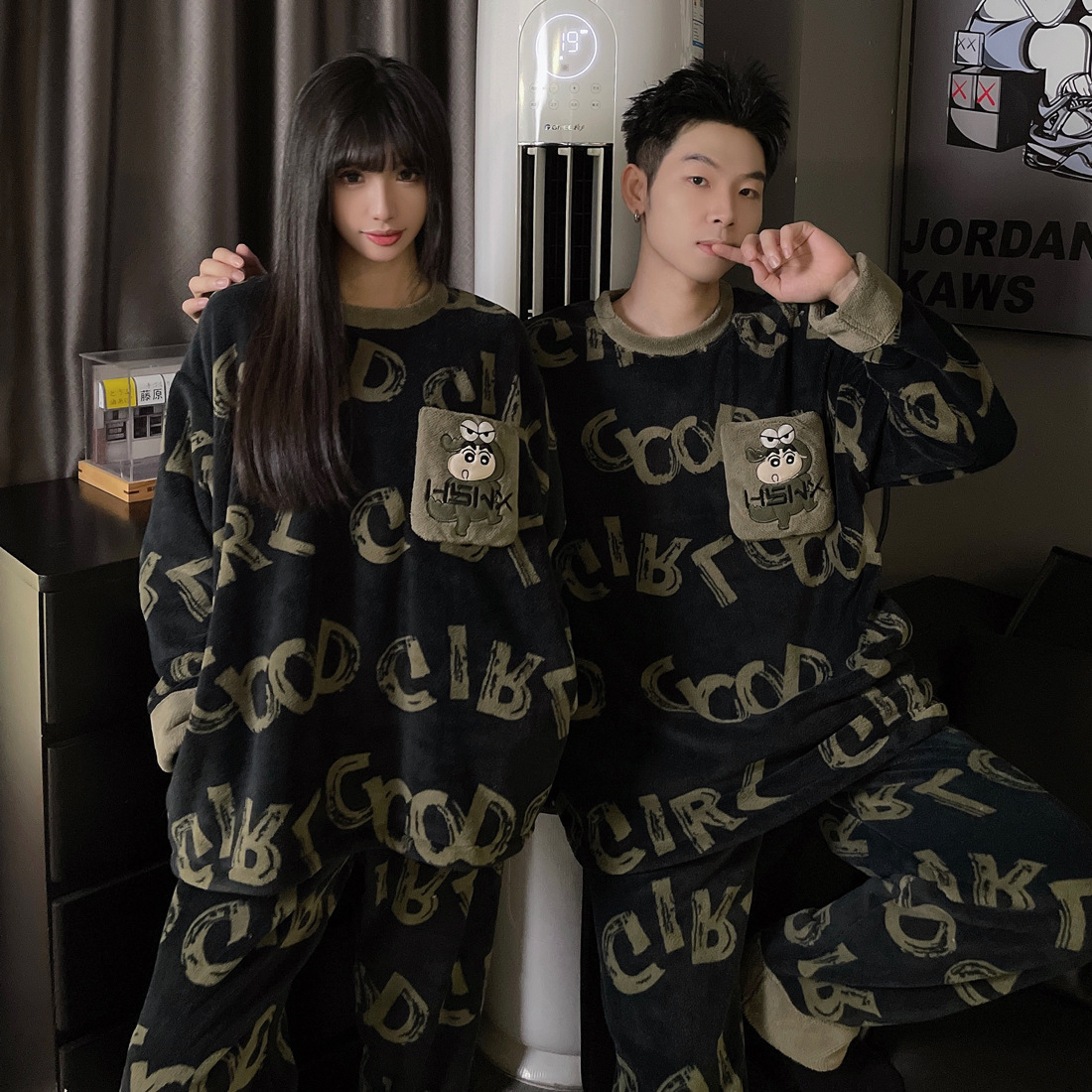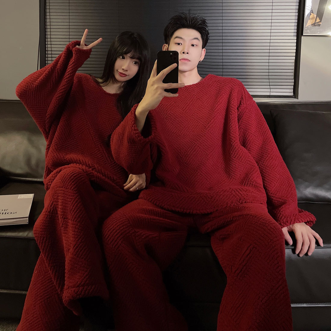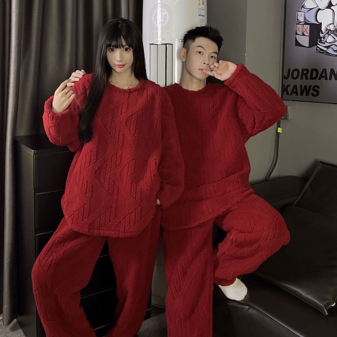 결혼식 축제 붉은 플란넬 커플 잠옷 겨울 둥근 목 긴 소매 바지 따뜻한 만화 홈 의류 세트