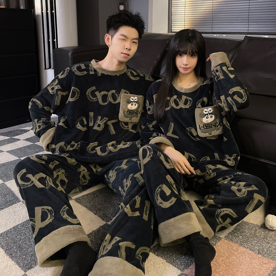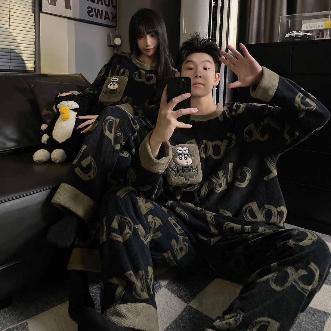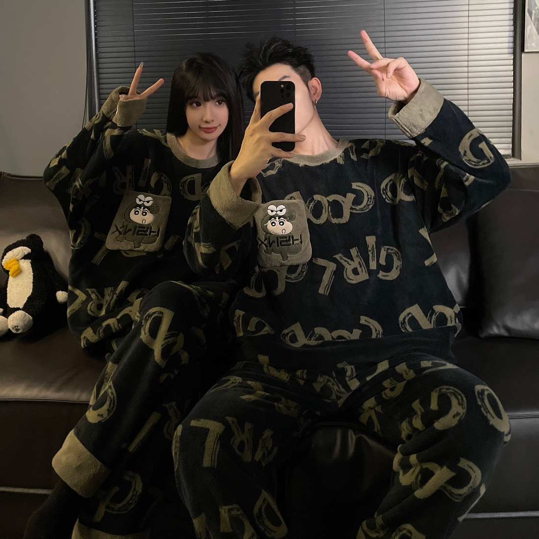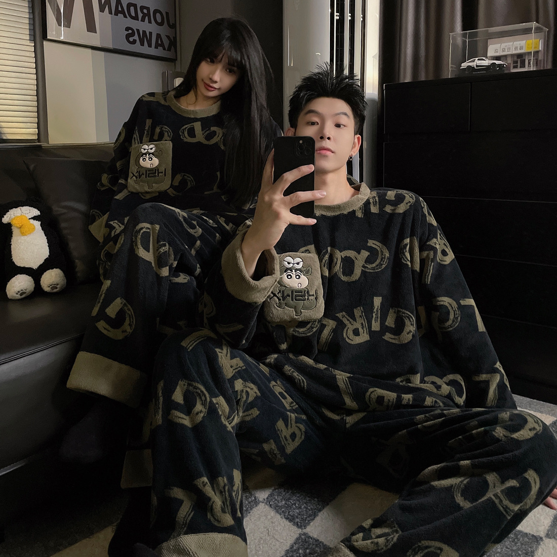 결혼식 축제 붉은 플란넬 커플 잠옷 겨울 둥근 목 긴 소매 바지 따뜻한 만화 홈 의류 세트