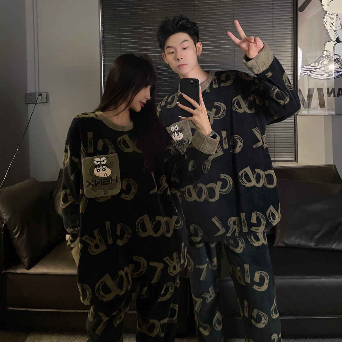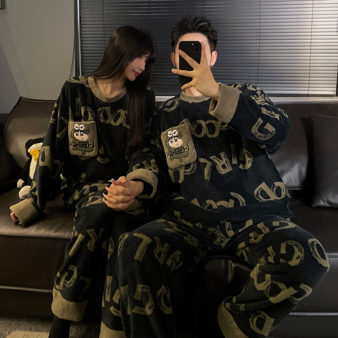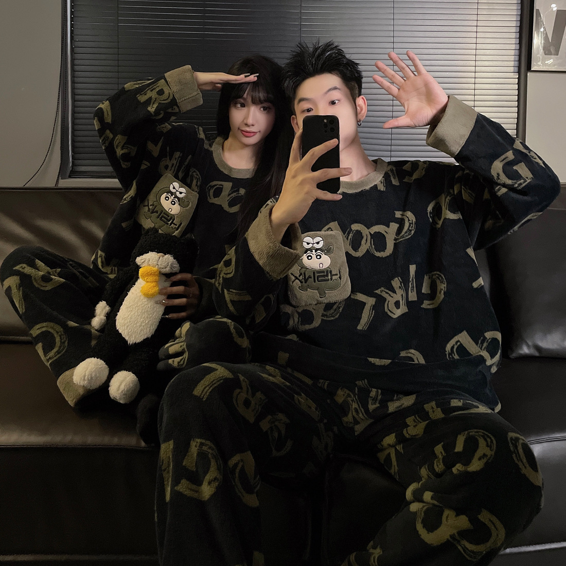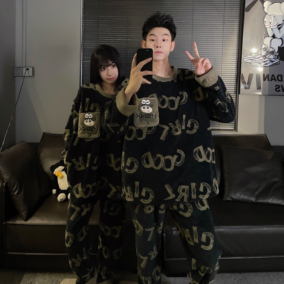결혼식 축제 붉은 플란넬 커플 잠옷 겨울 둥근 목 긴 소매 바지 따뜻한 만화 홈 의류 세트
