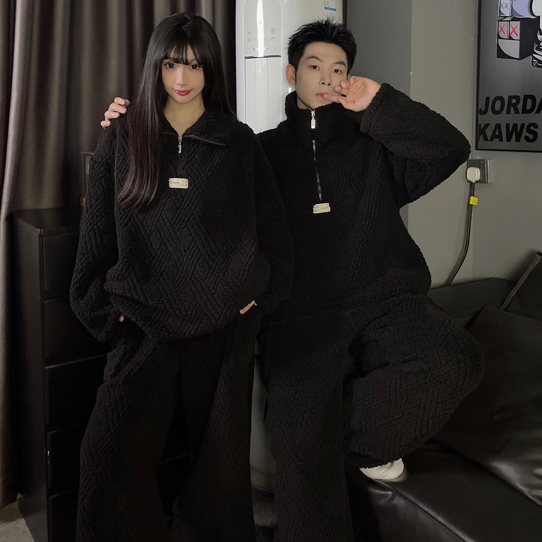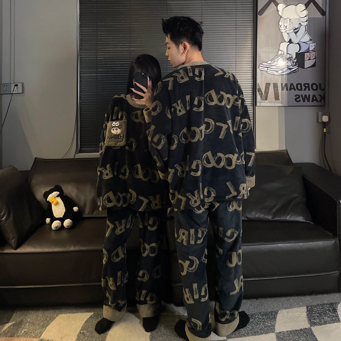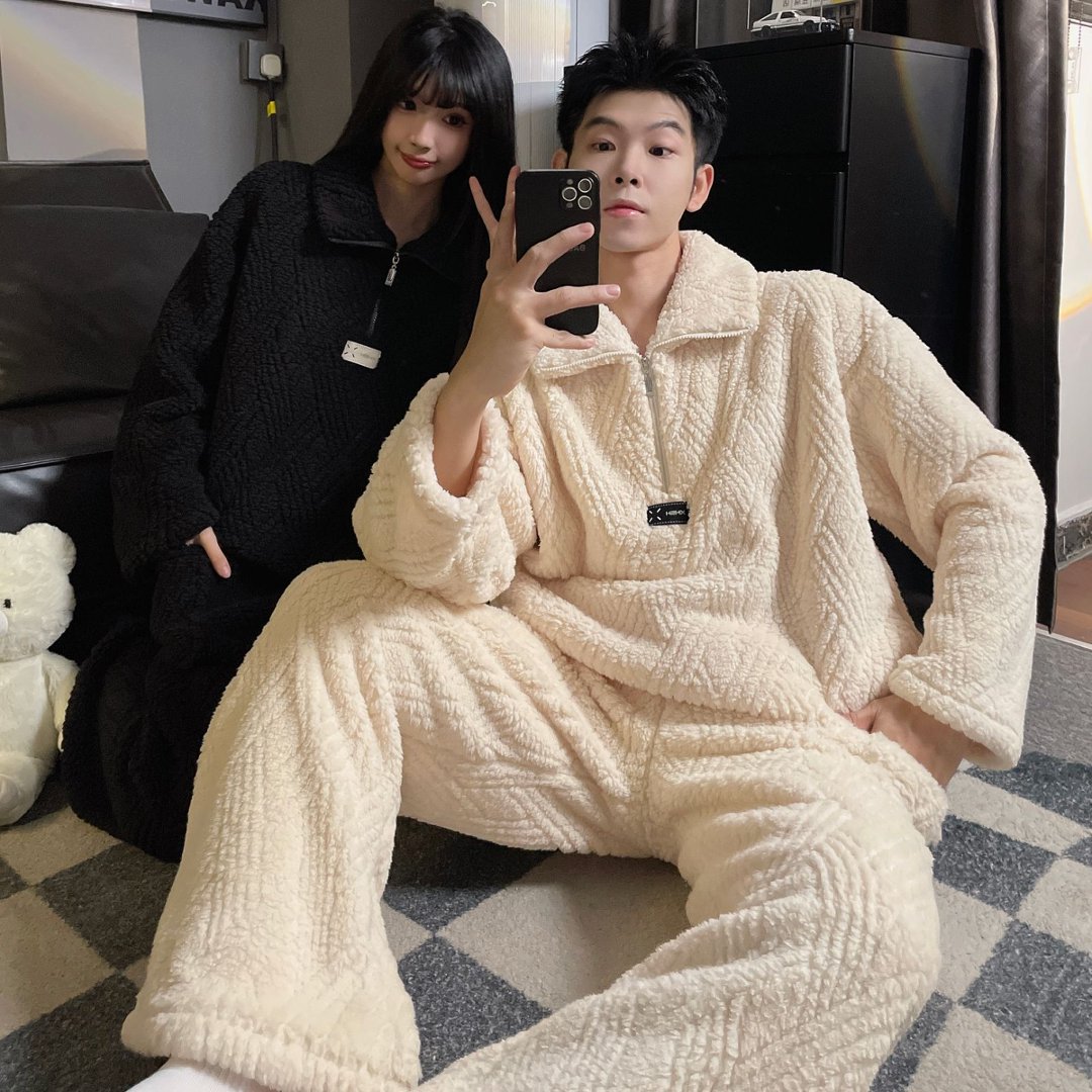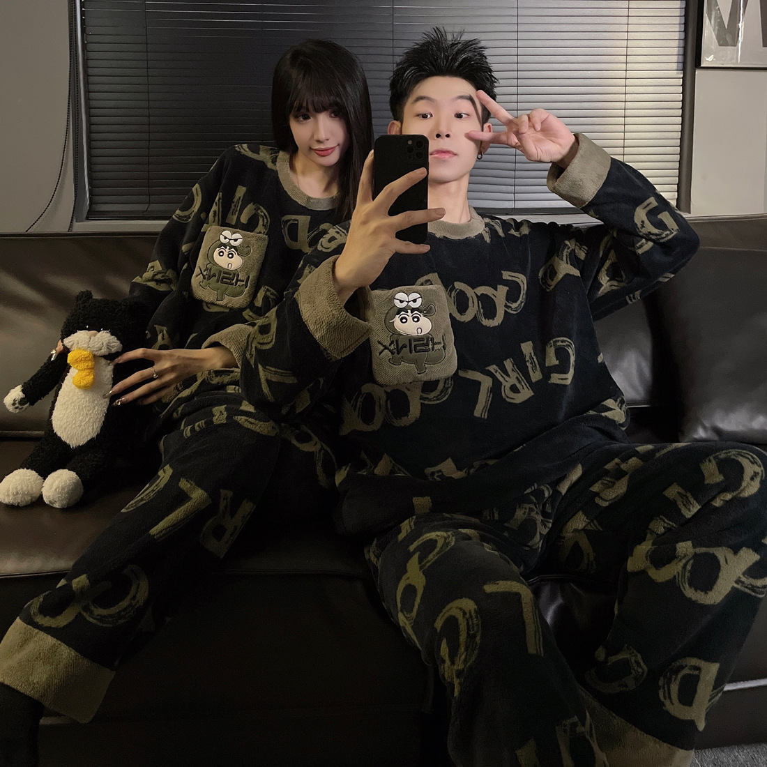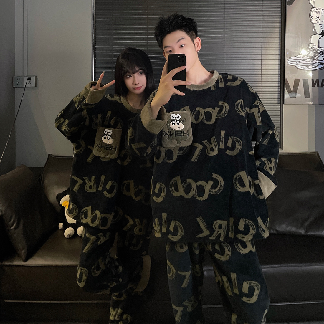 결혼식 축제 붉은 플란넬 커플 잠옷 겨울 둥근 목 긴 소매 바지 따뜻한 만화 홈 의류 세트