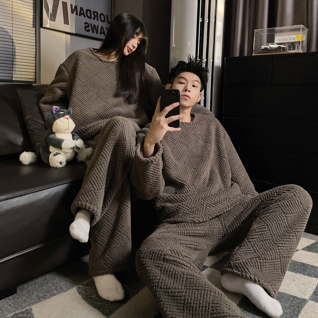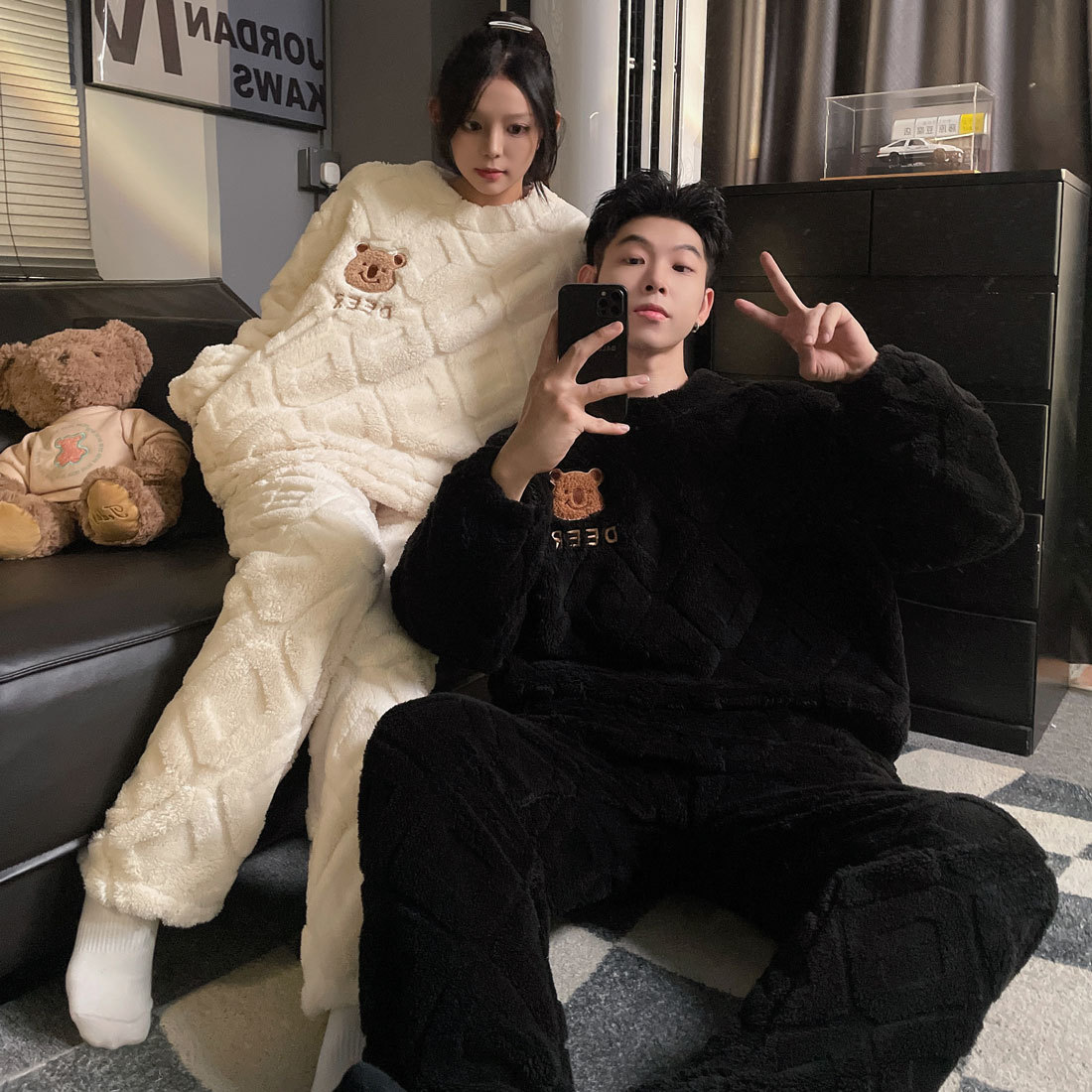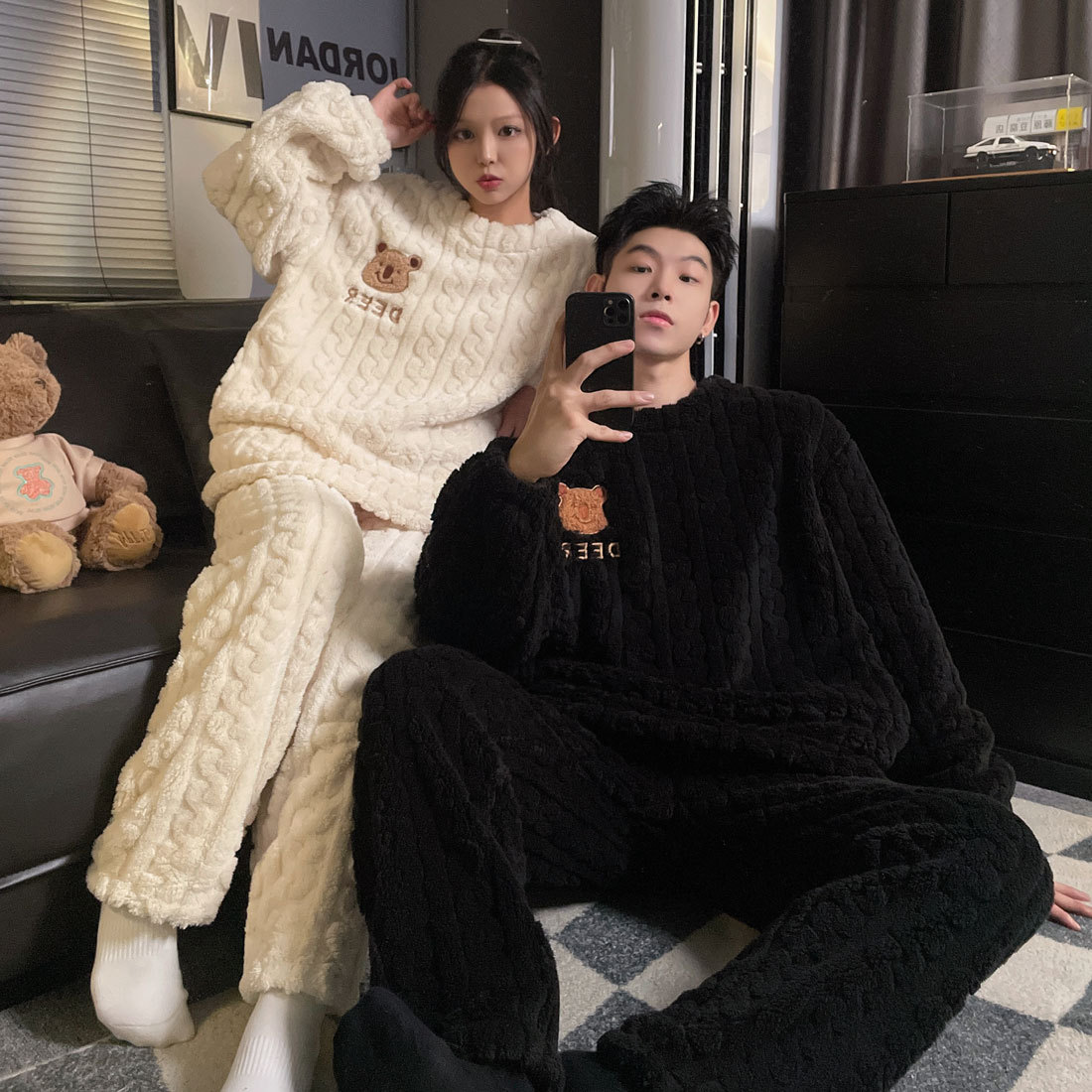 결혼식 축제 붉은 플란넬 커플 잠옷 겨울 둥근 목 긴 소매 바지 따뜻한 만화 홈 의류 세트스토어 가기