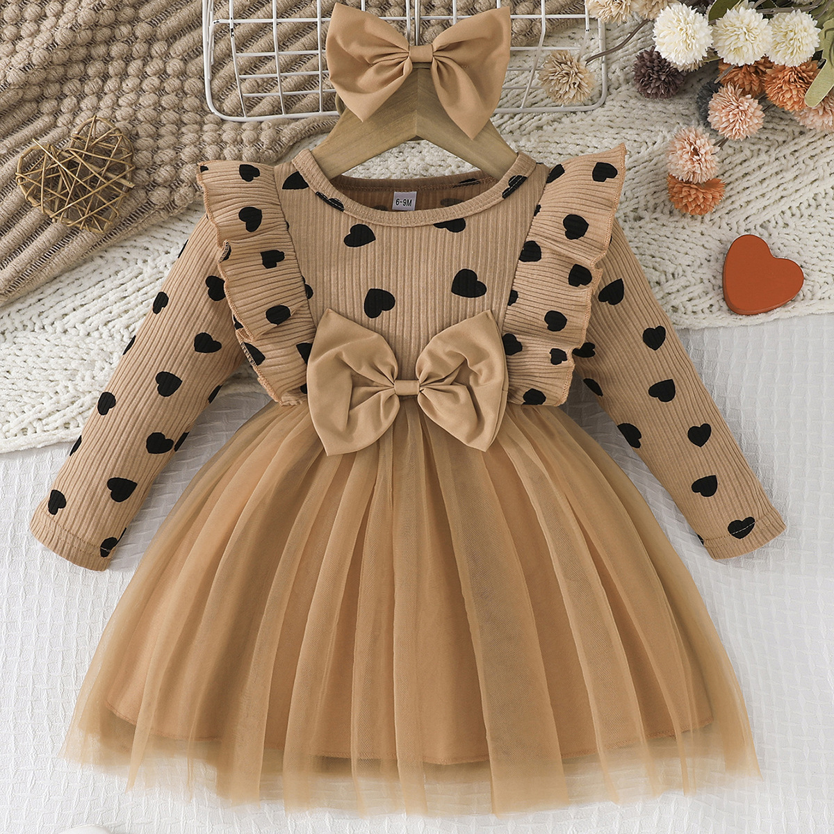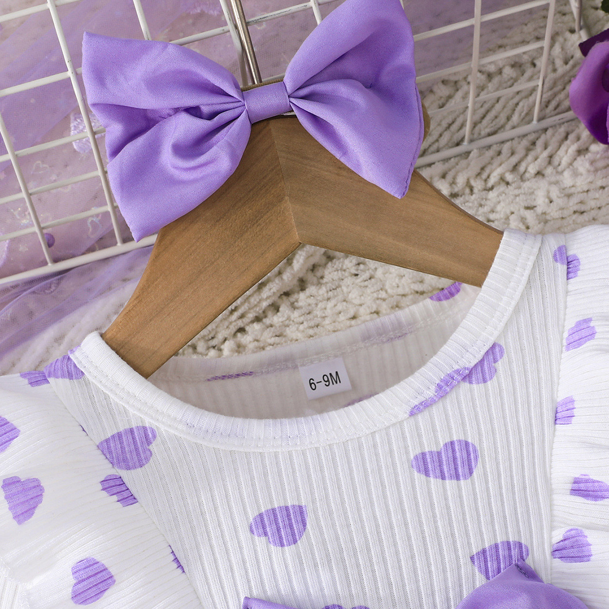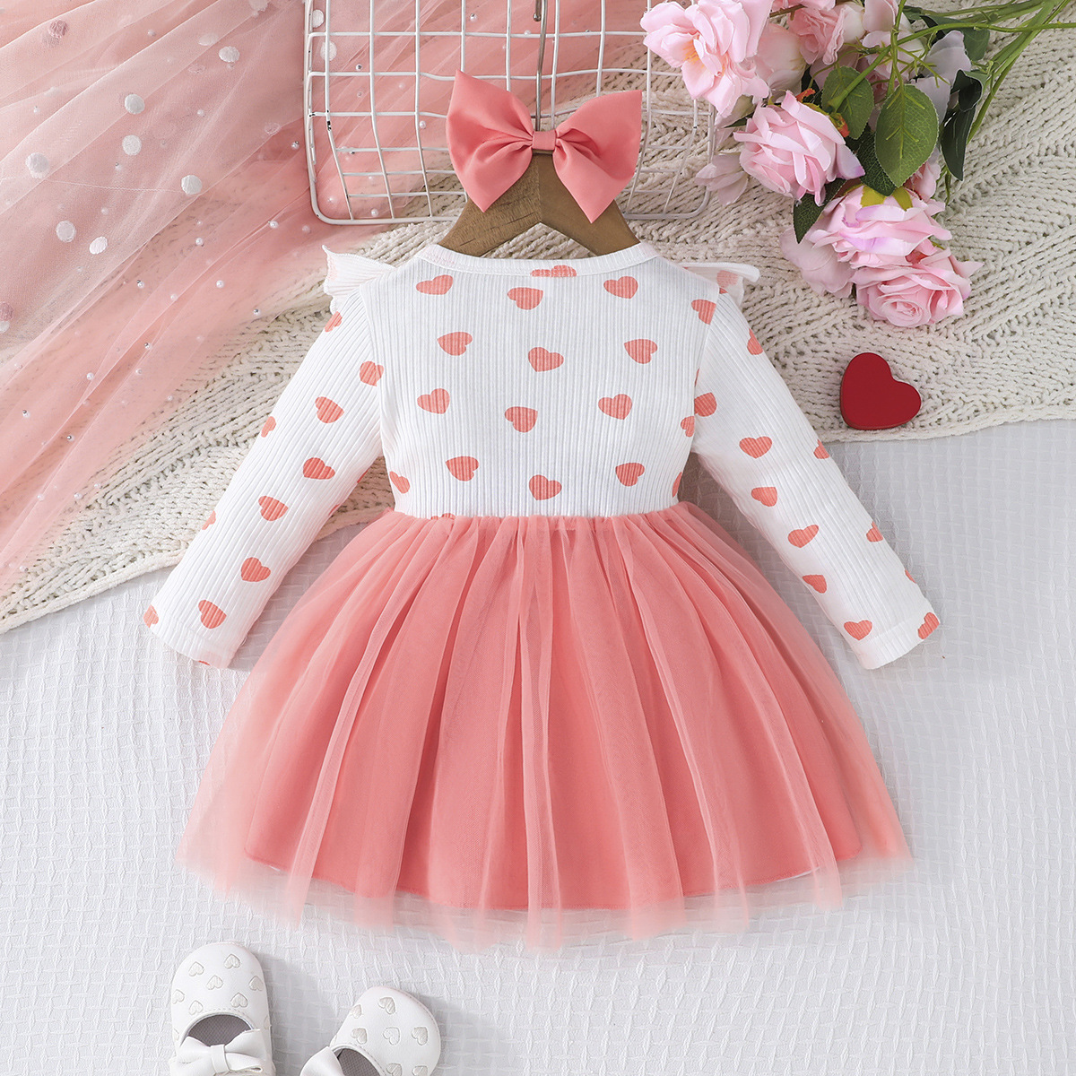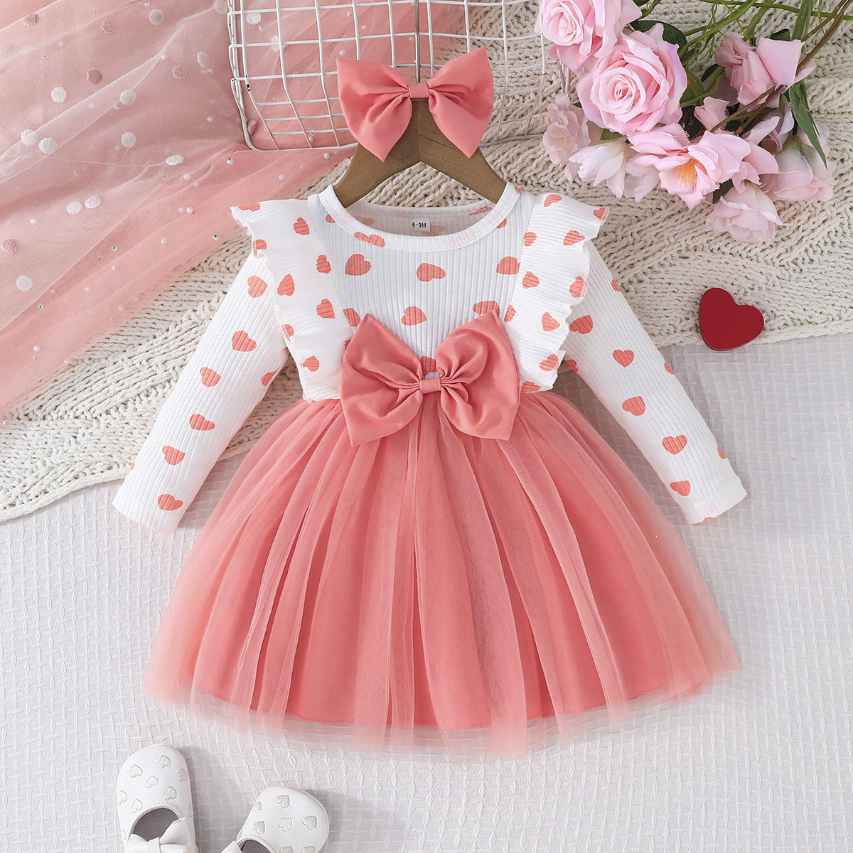 0-3세 여아용 봄, 가을 달콤하고 귀여운 공주 드레스, 면 골지 하트 프린트 망사 드레스 + 헤어밴드