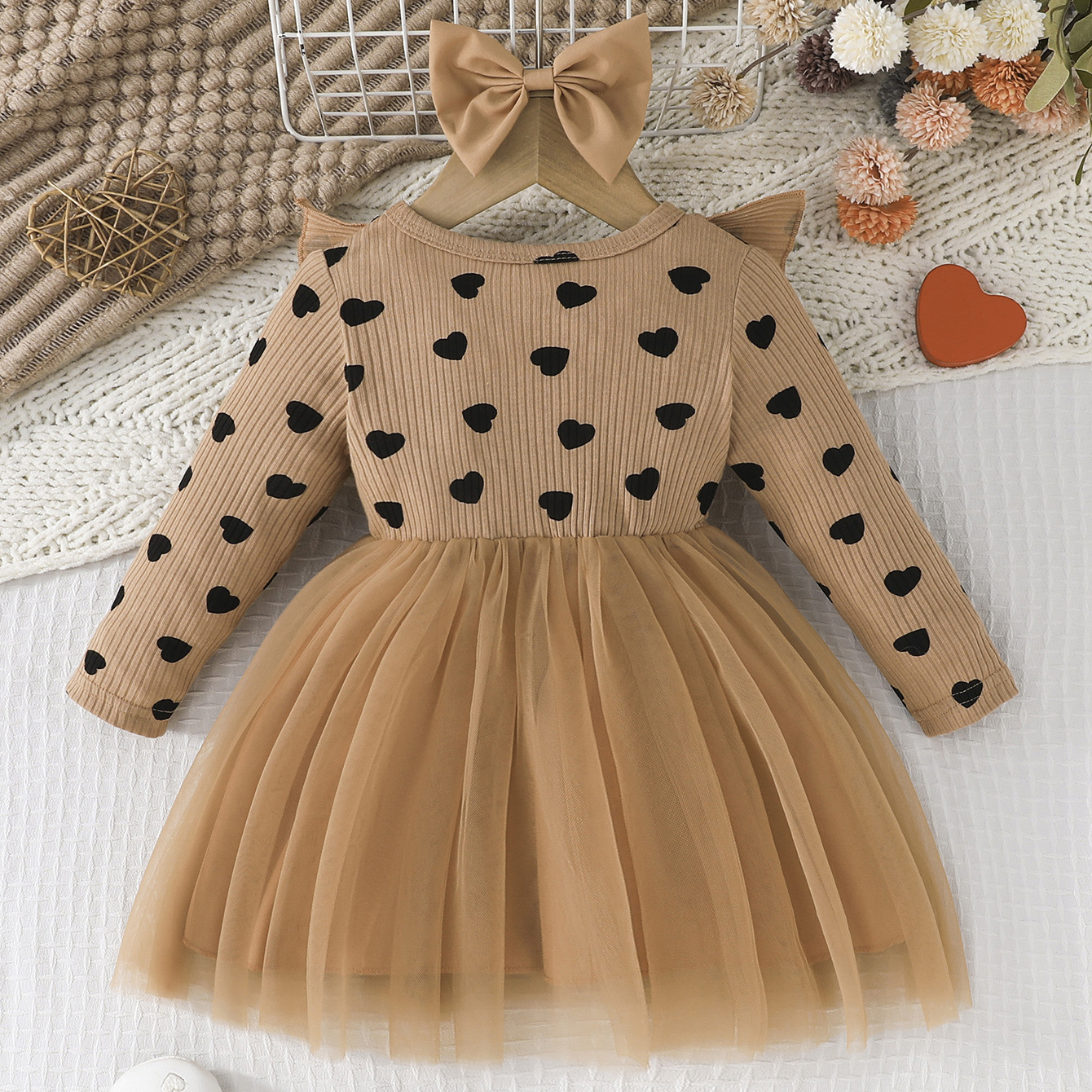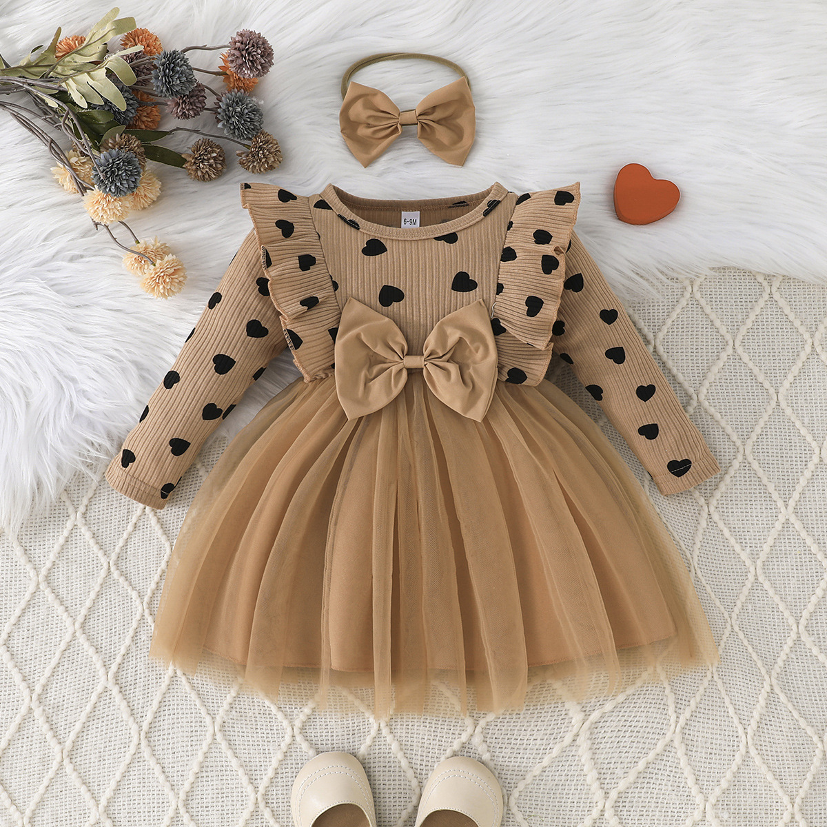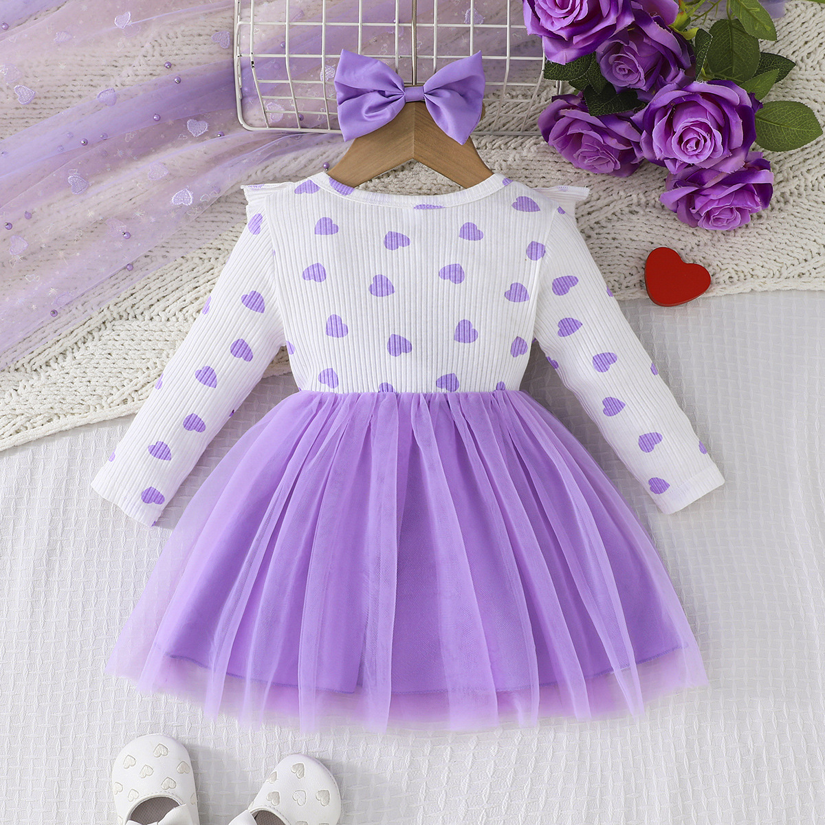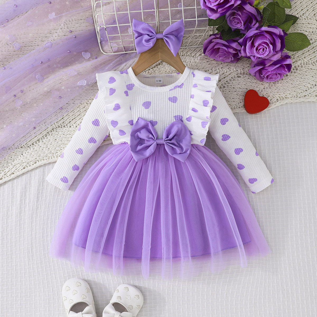 0-3세 여아용 봄, 가을 달콤하고 귀여운 공주 드레스, 면 골지 하트 프린트 망사 드레스 + 헤어밴드