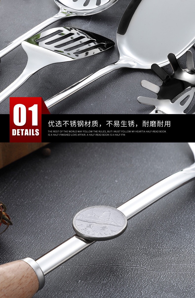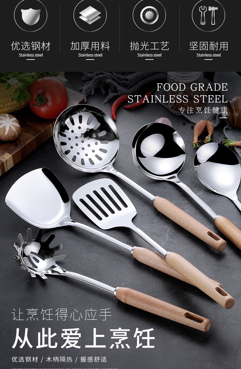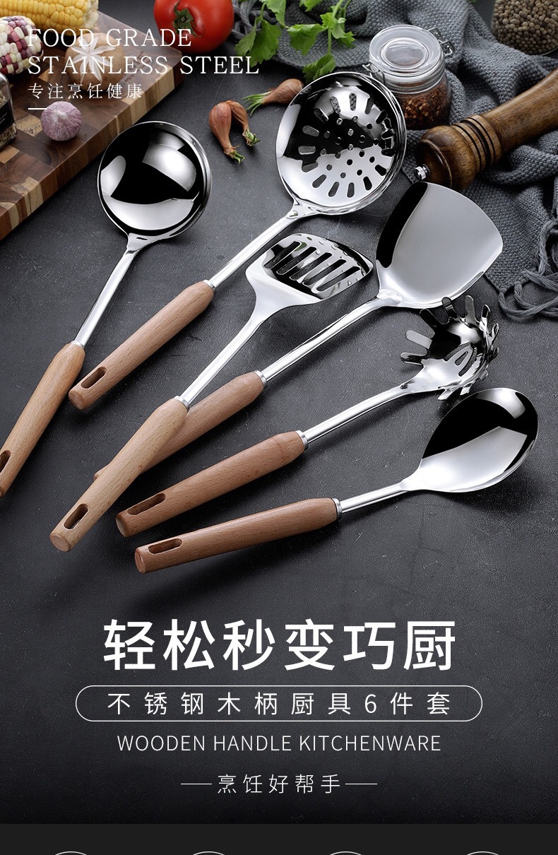 스테인레스 스틸 주방용품 6 피스 삽 스푼 소쿠더 안티 스케일 나무 손잡이 스푼 요리 도구 가정용 주방용품 세트스토어 가기
