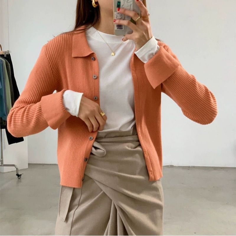 프랑스 옷깃 슬림 니트 솔리드 컬러 긴팔 카디건 여성을위한 새로운 내부 스웨터 슬림핏 베이스 스웨터 탑스토어 가기