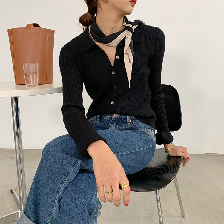 프랑스 옷깃 슬림 니트 솔리드 컬러 긴팔 카디건 여성을위한 새로운 내부 스웨터 슬림핏 베이스 스웨터 탑