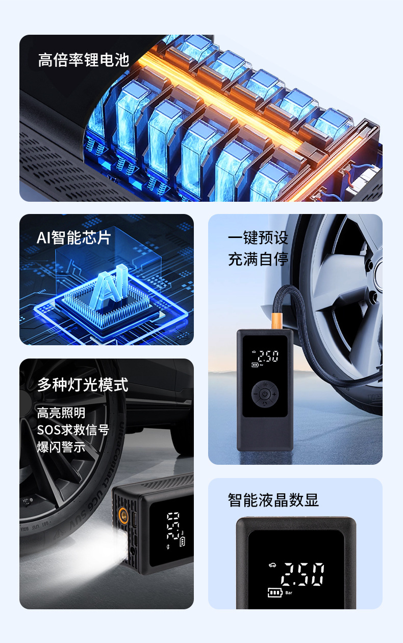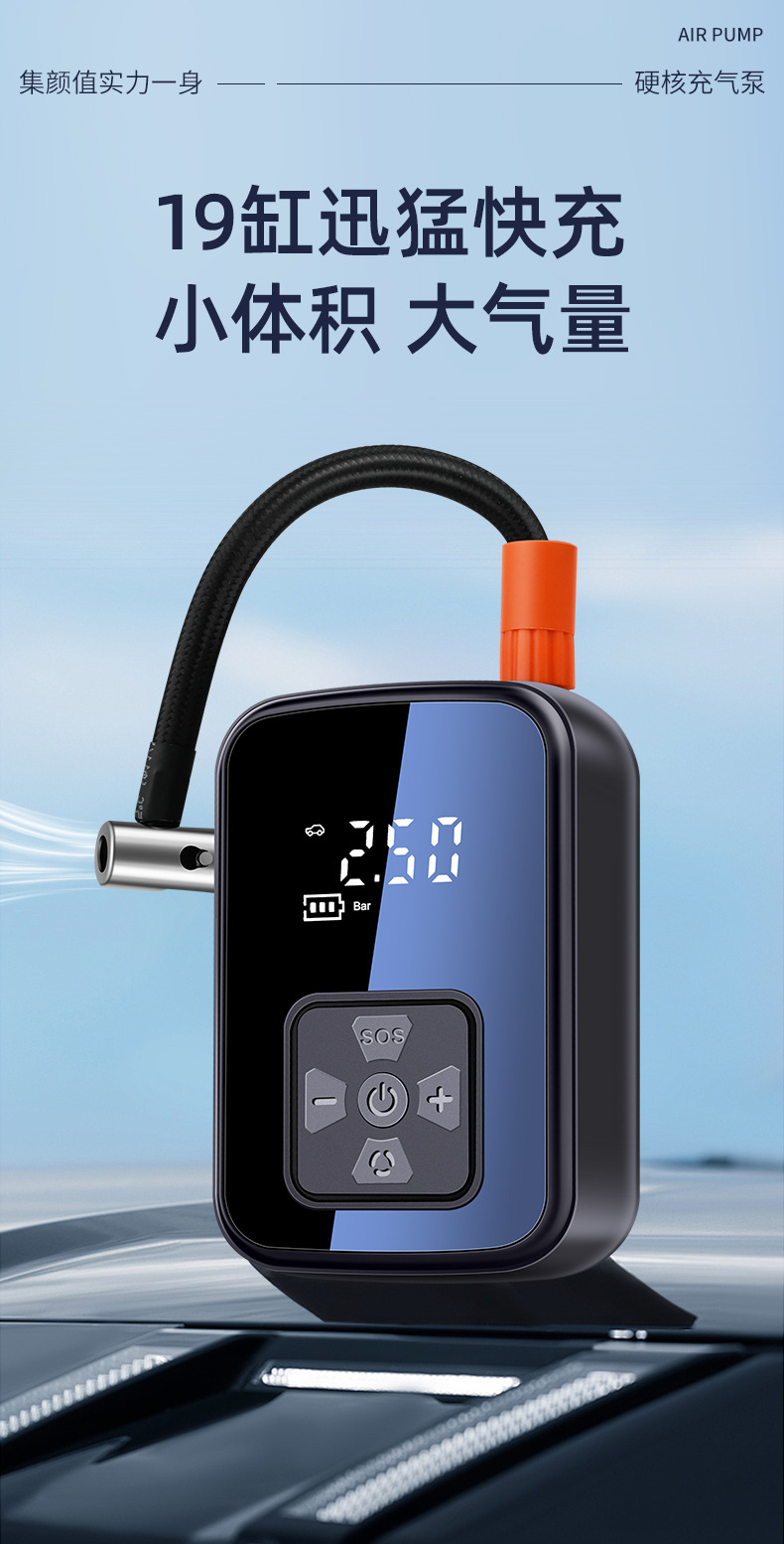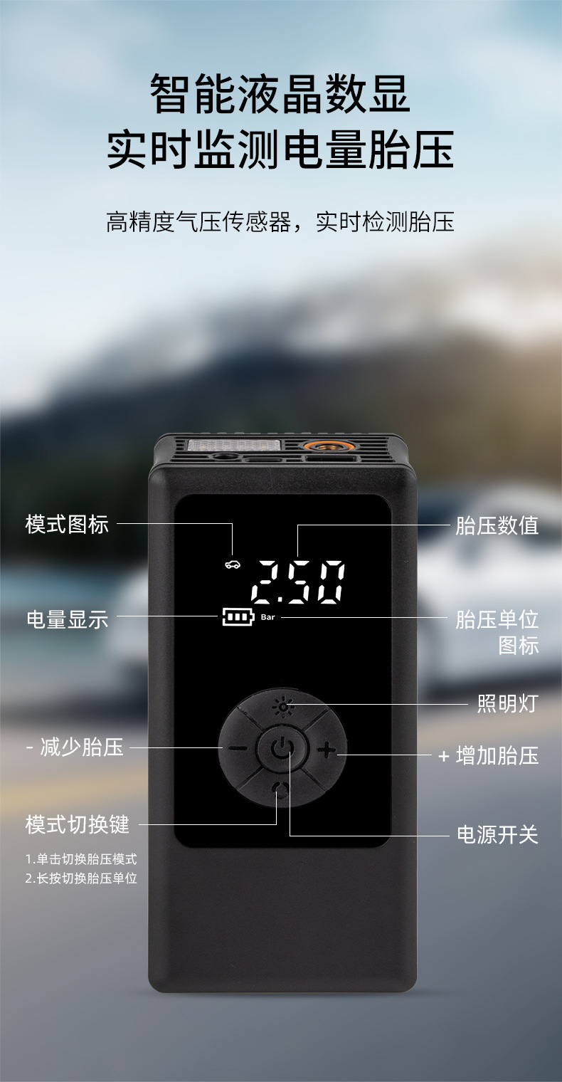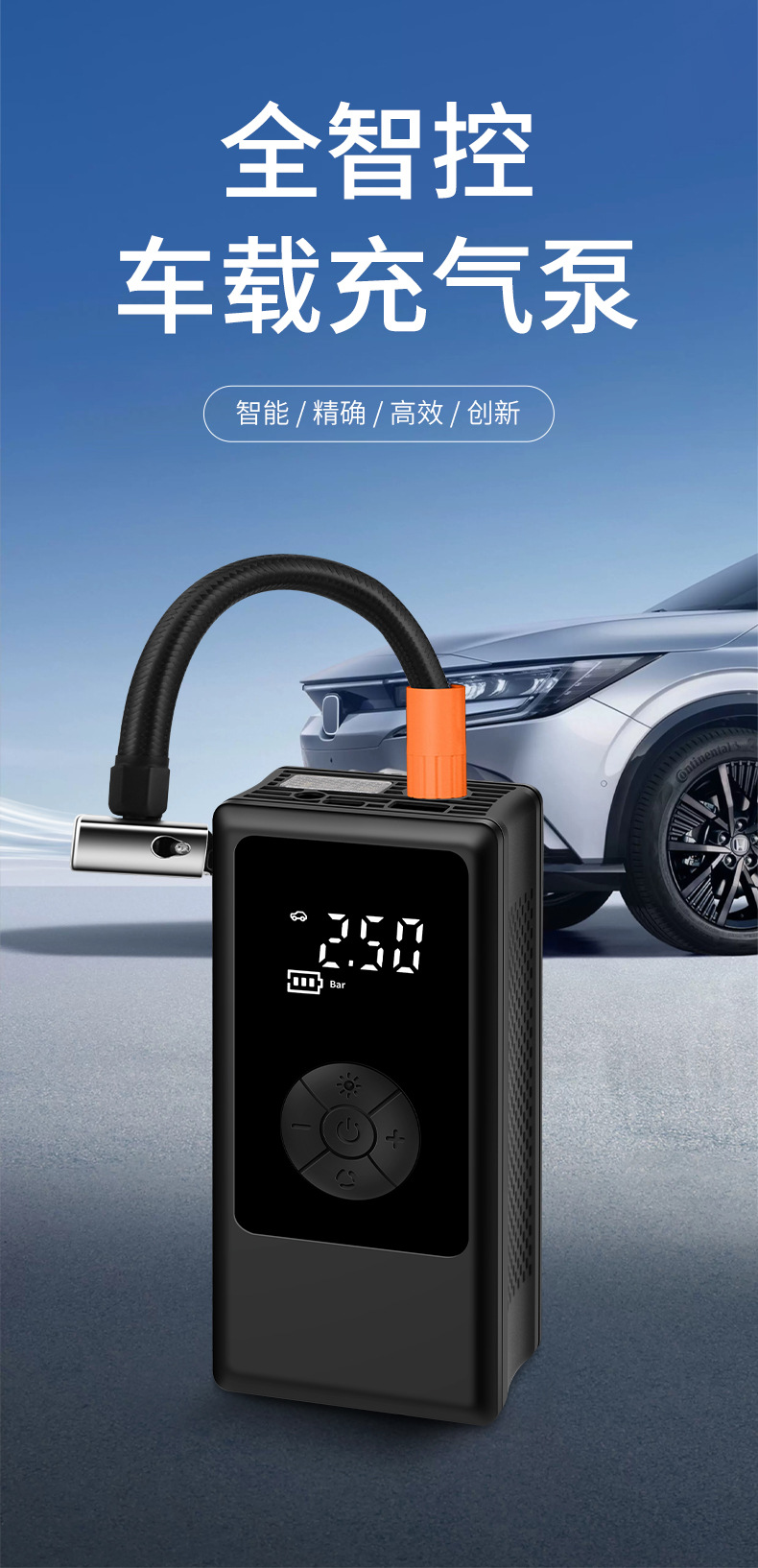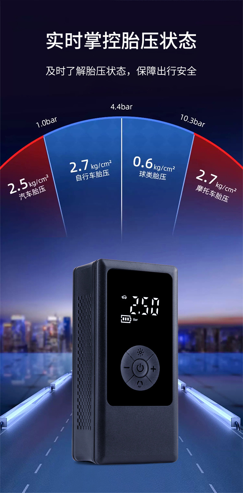 产品介绍:采用19缸直泵机芯,4000毫安18650铝电池。胎压检测,智能数显,一键起动,充满自停。