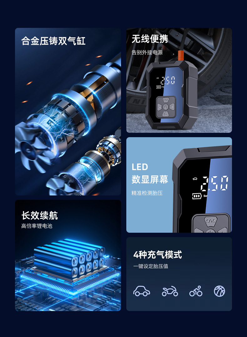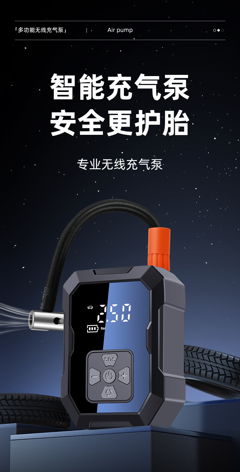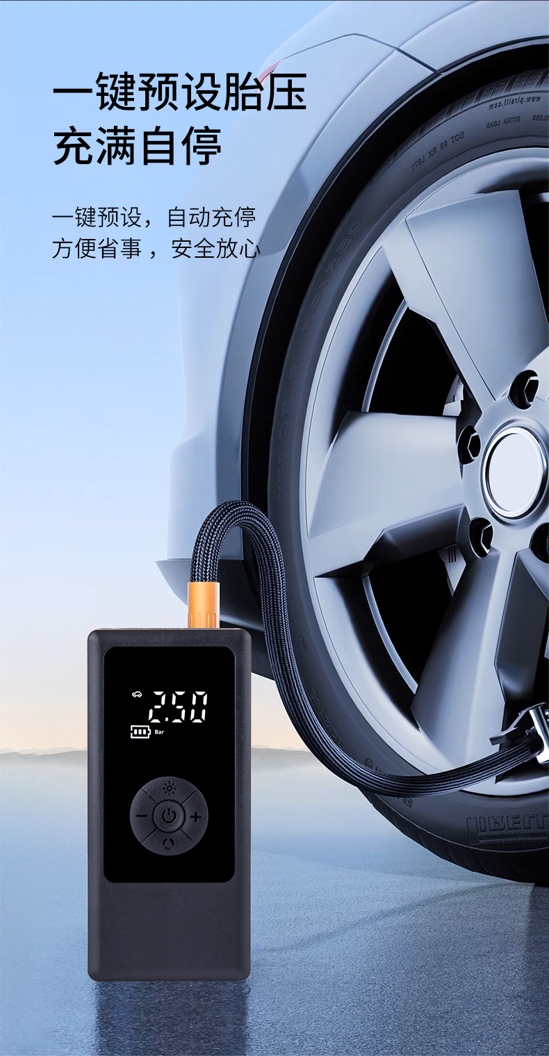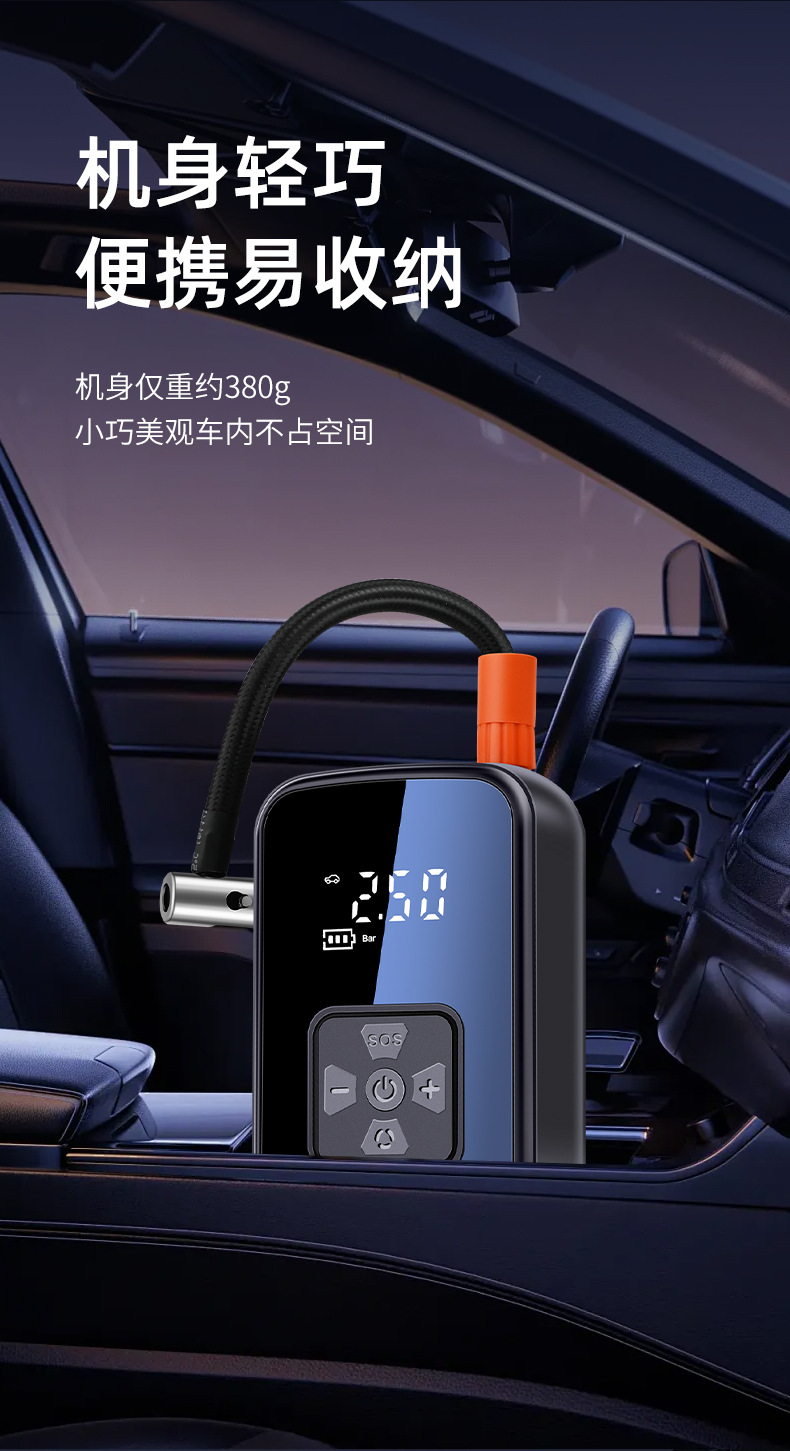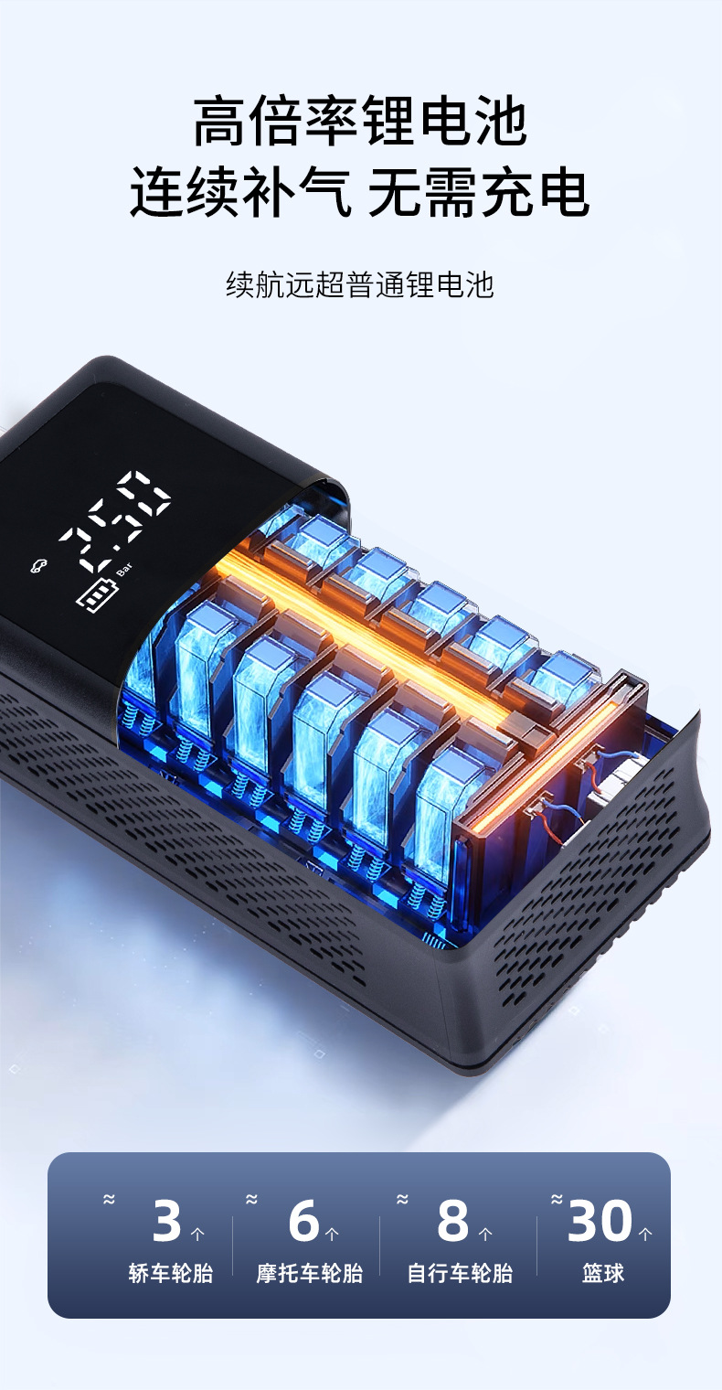 产品介绍:采用19缸直泵机芯,4000毫安18650铝电池。胎压检测,智能数显,一键起动,充满自停。