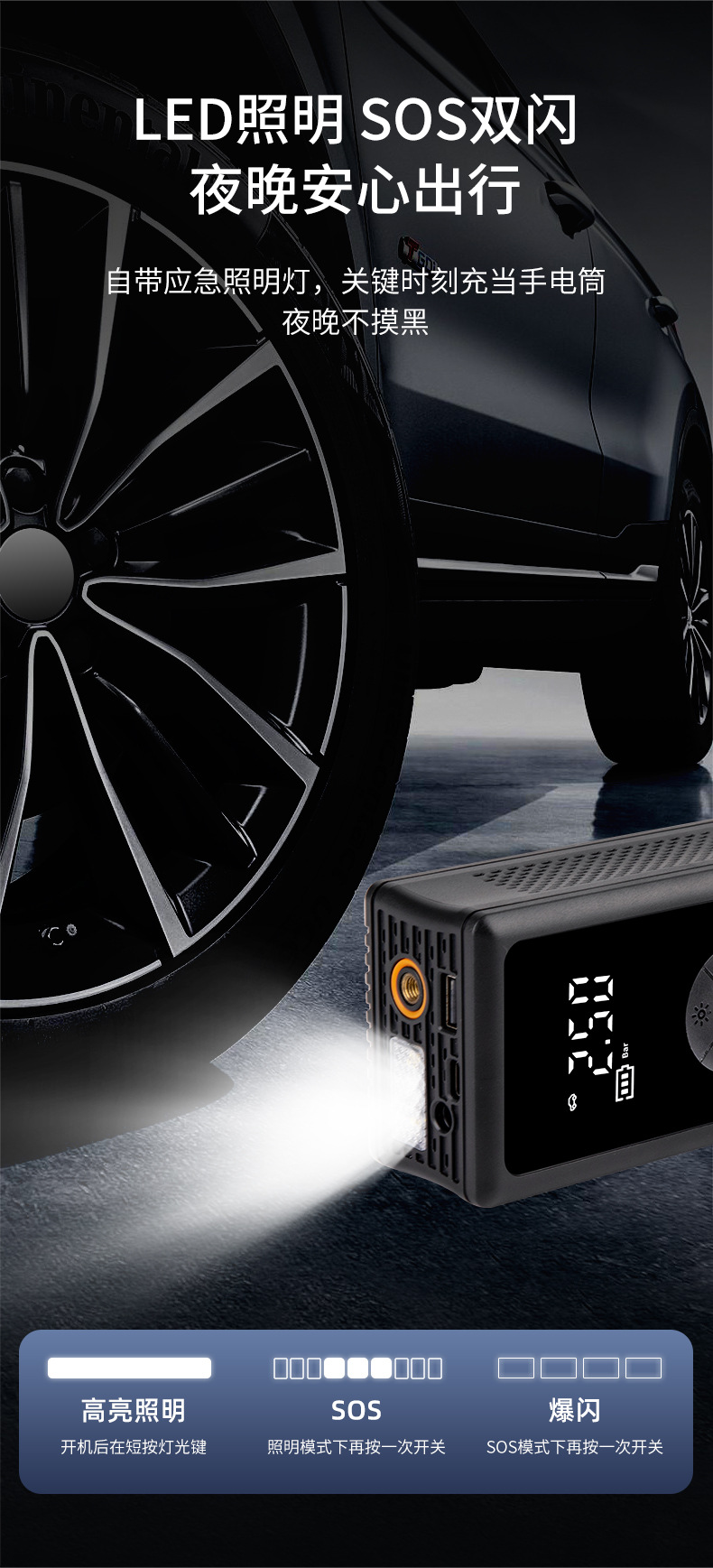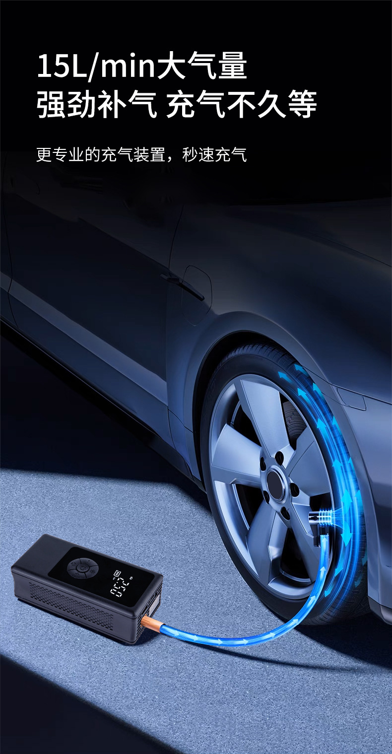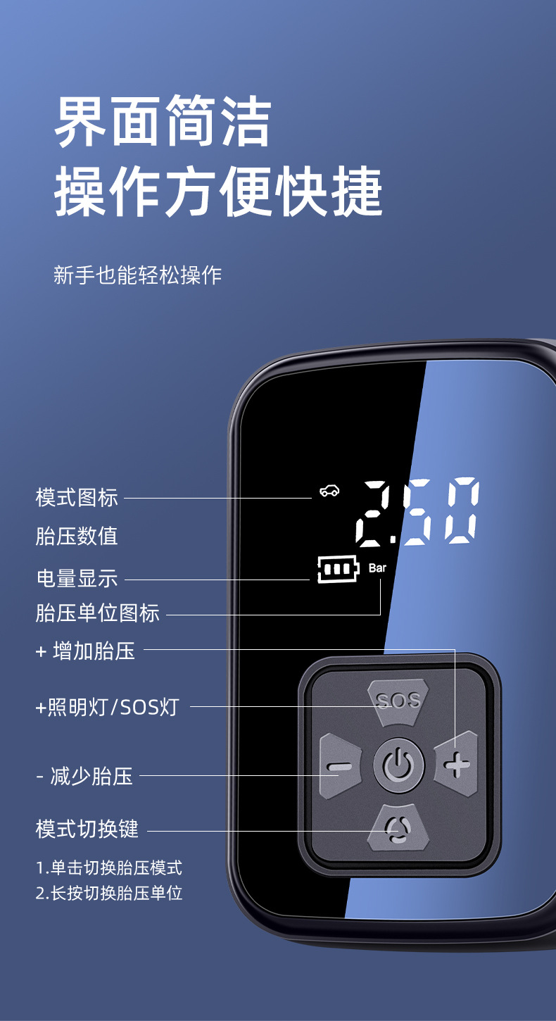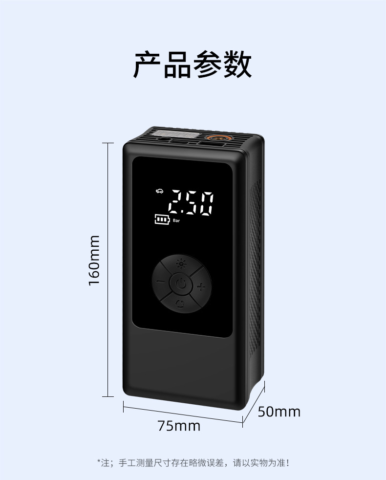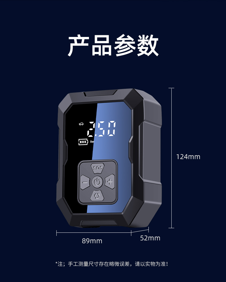产品介绍:采用19缸直泵机芯,4000毫安18650铝电池。胎压检测,智能数显,一键起动,充满自停。