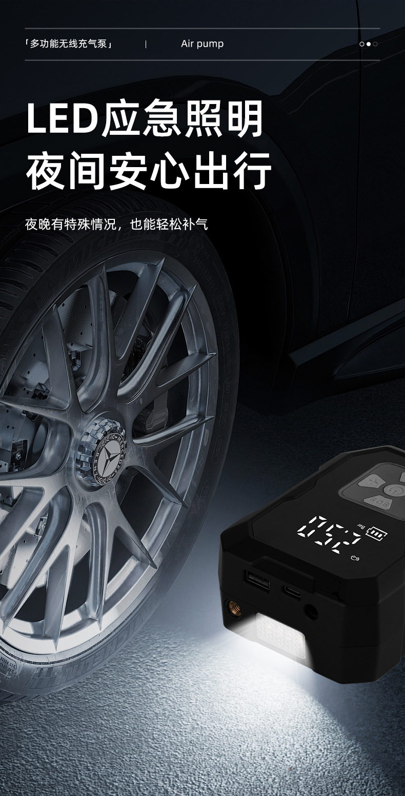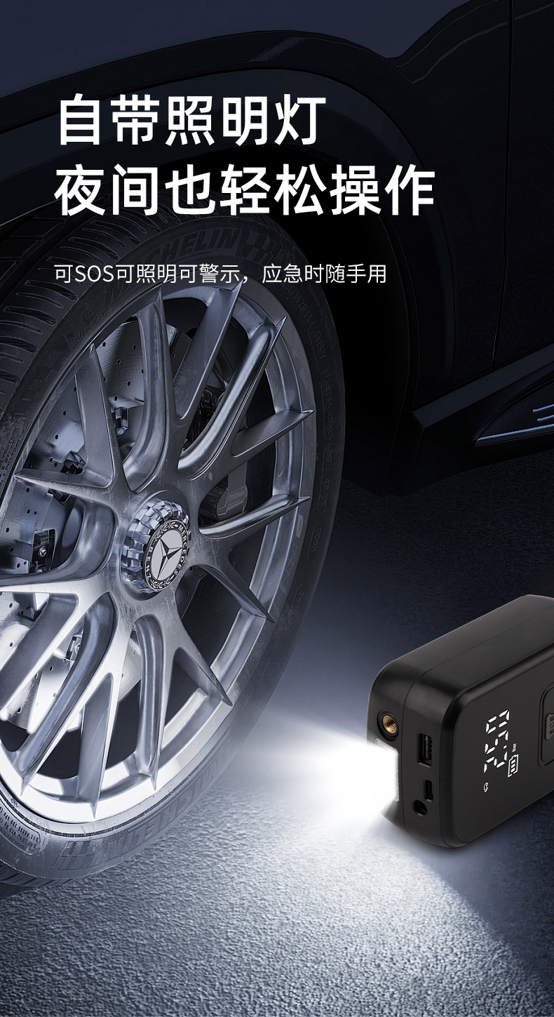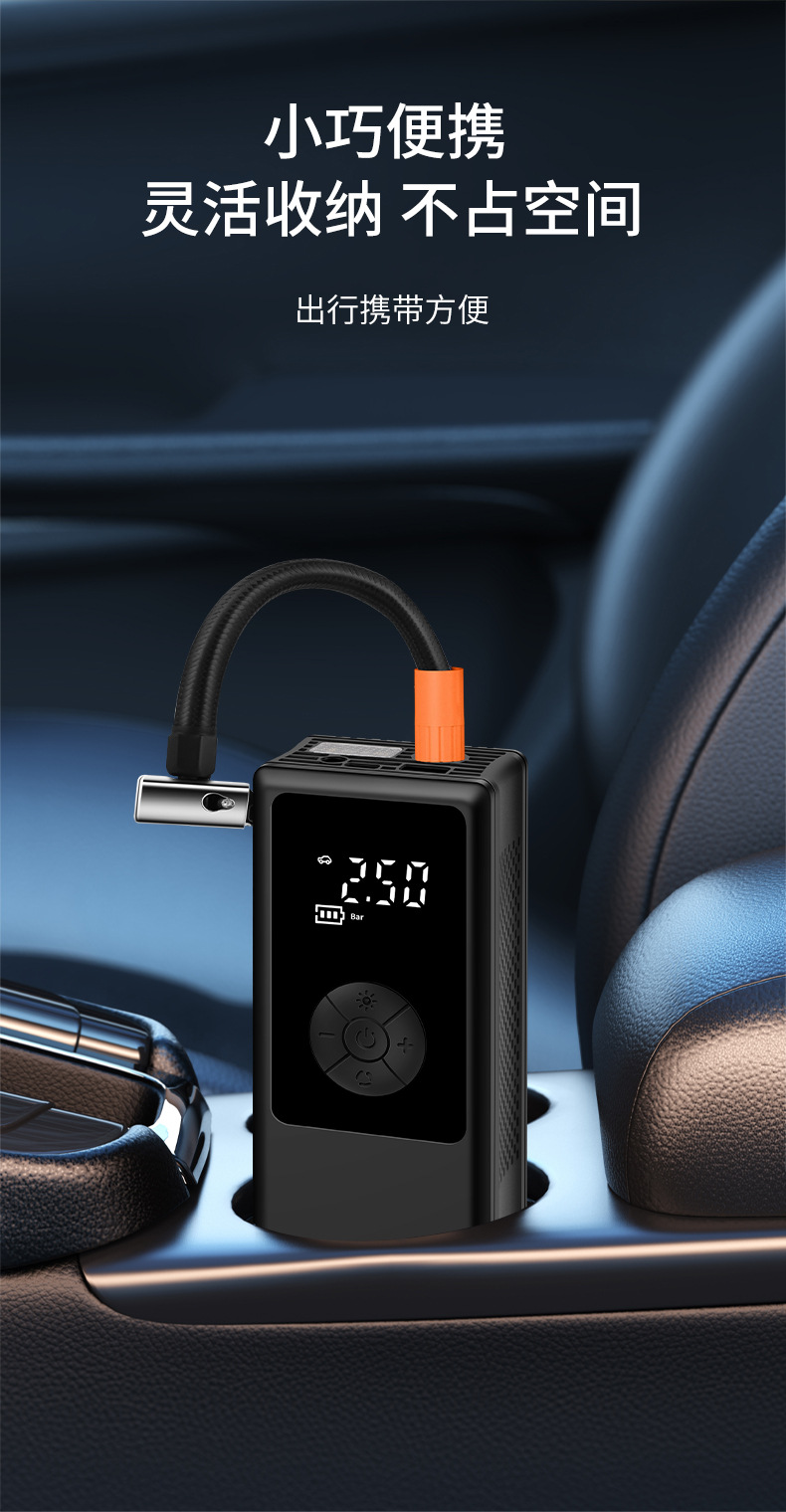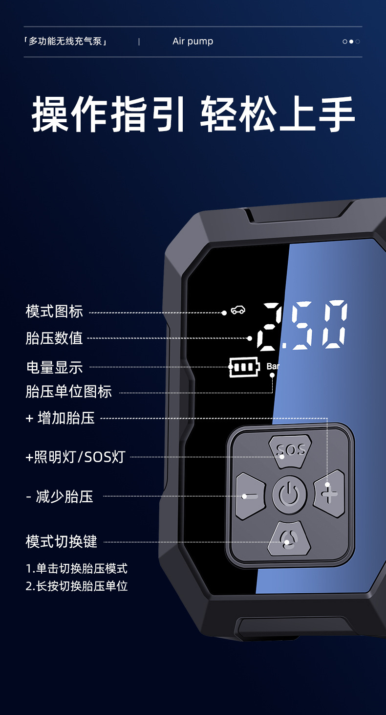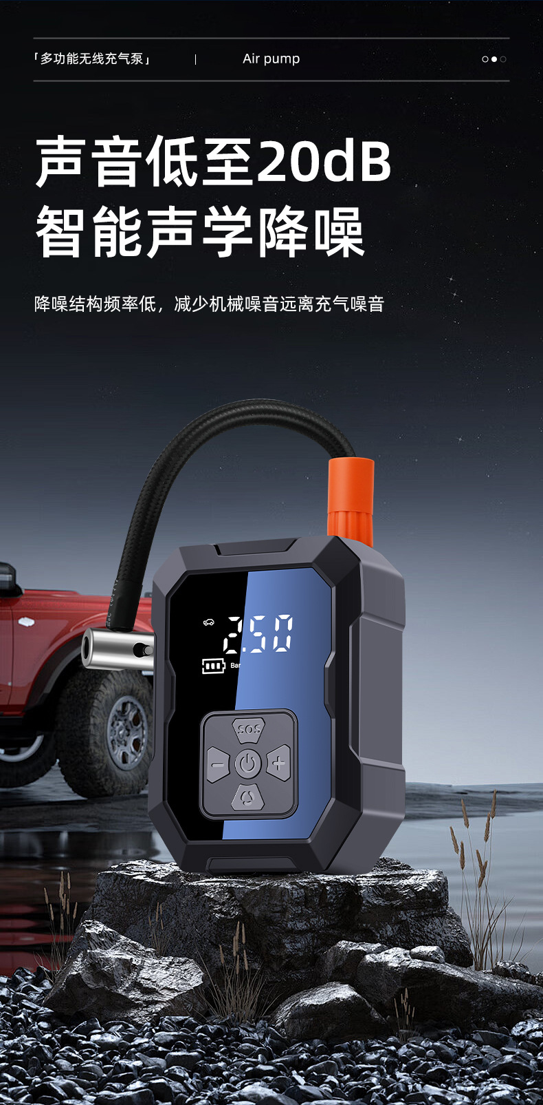 产品介绍:采用19缸直泵机芯,4000毫安18650铝电池。胎压检测,智能数显,一键起动,充满自停。
