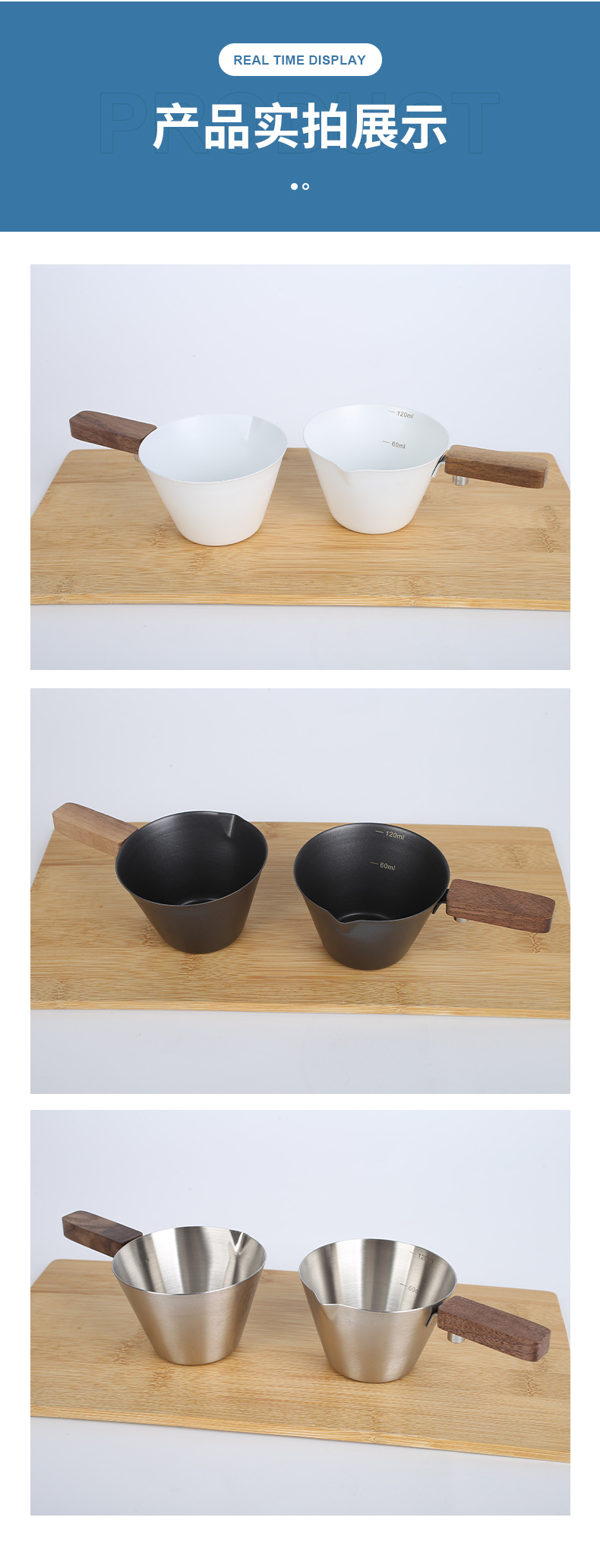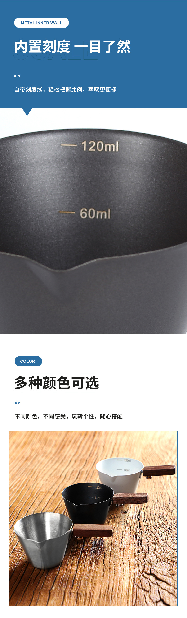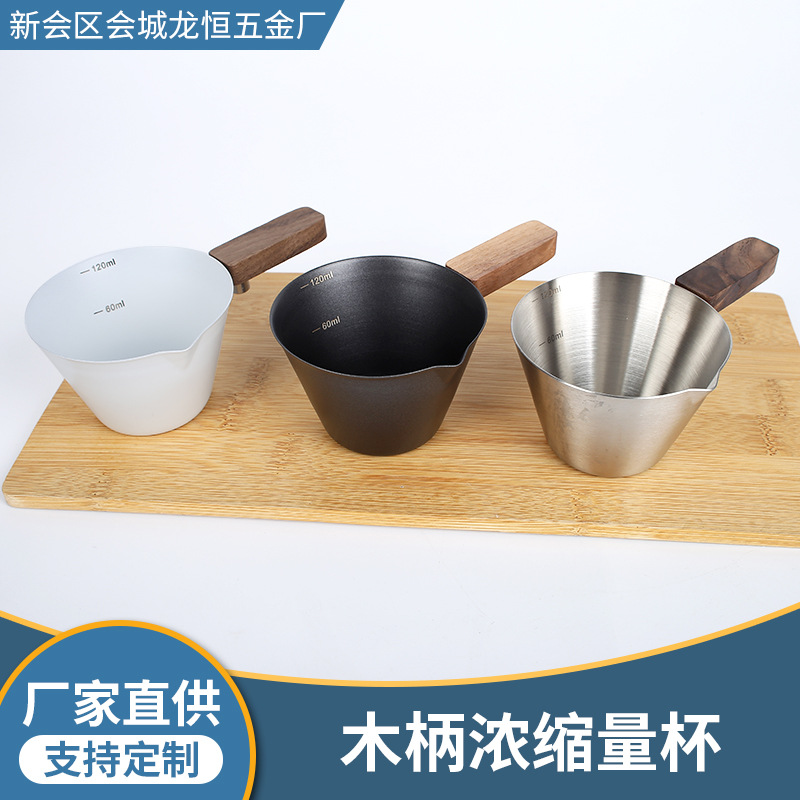스케일 호두 손잡이 120ml 상업용 커피 추출 컵이있는 304 스테인레스 스틸 나무 손잡이 에스프레소 측정 컵스토어 가기