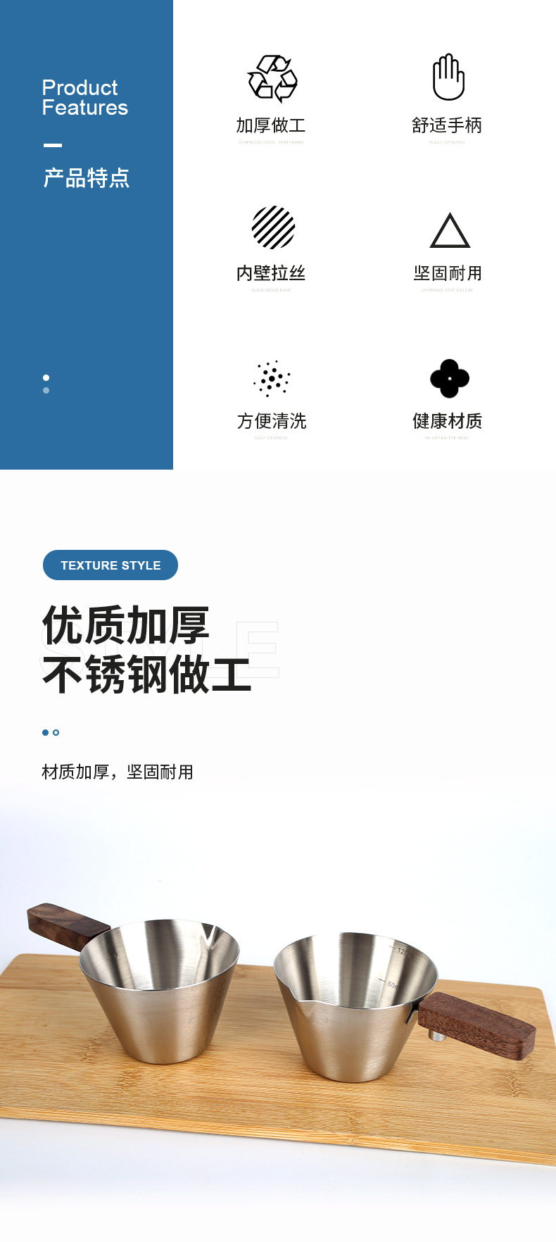 스케일 호두 손잡이 120ml 상업용 커피 추출 컵이있는 304 스테인레스 스틸 나무 손잡이 에스프레소 측정 컵