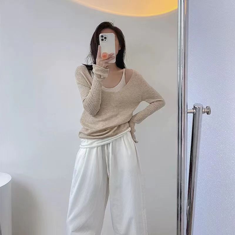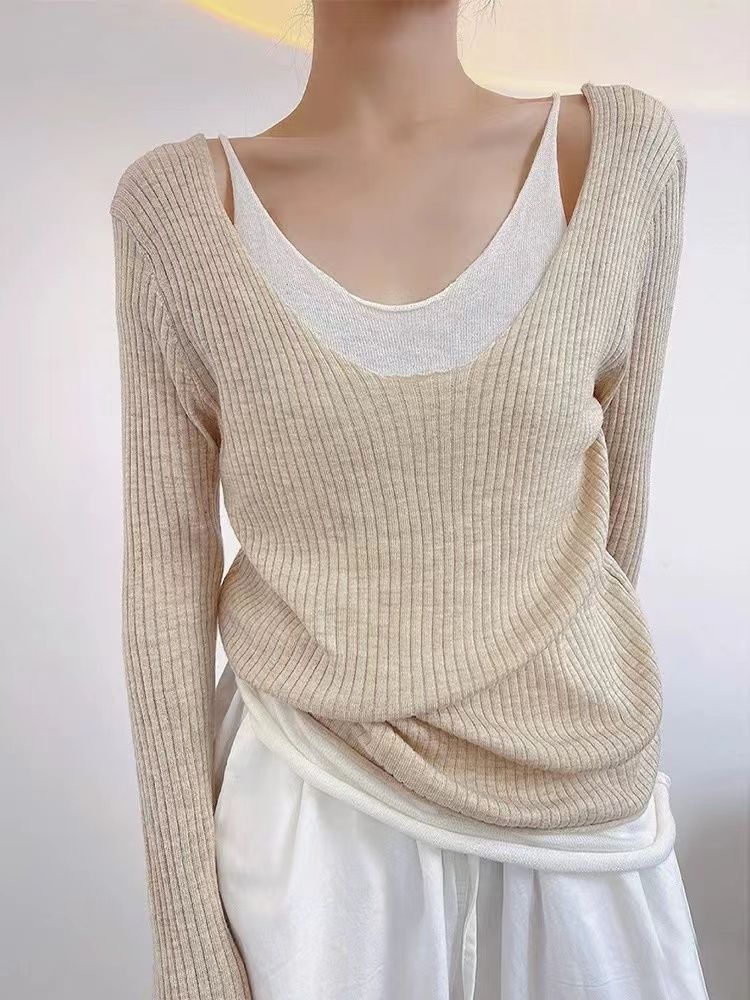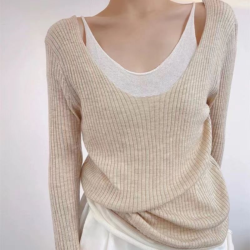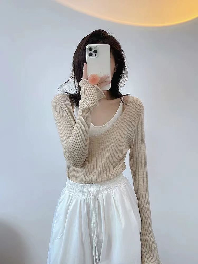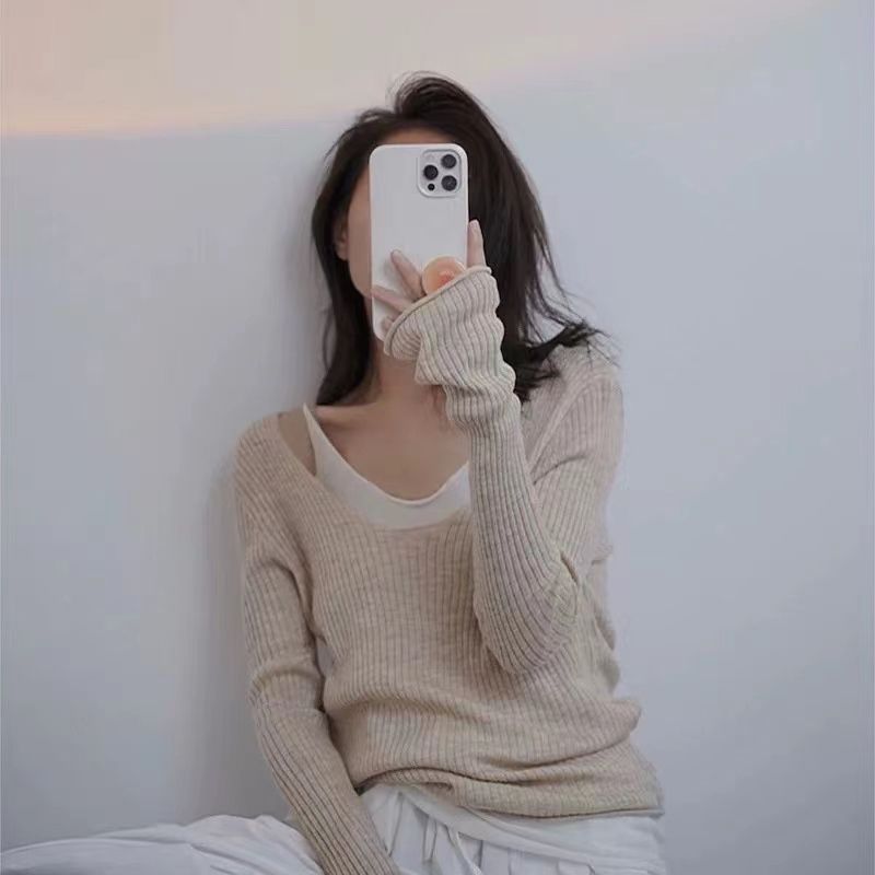 디자인 센스 틈새 쇄골-Baring 가짜 2 피스 니트웨어 여성 대학 스타일 얇은 긴 소매베이스 레이어 셔츠 트럼펫 슬리브 탑
