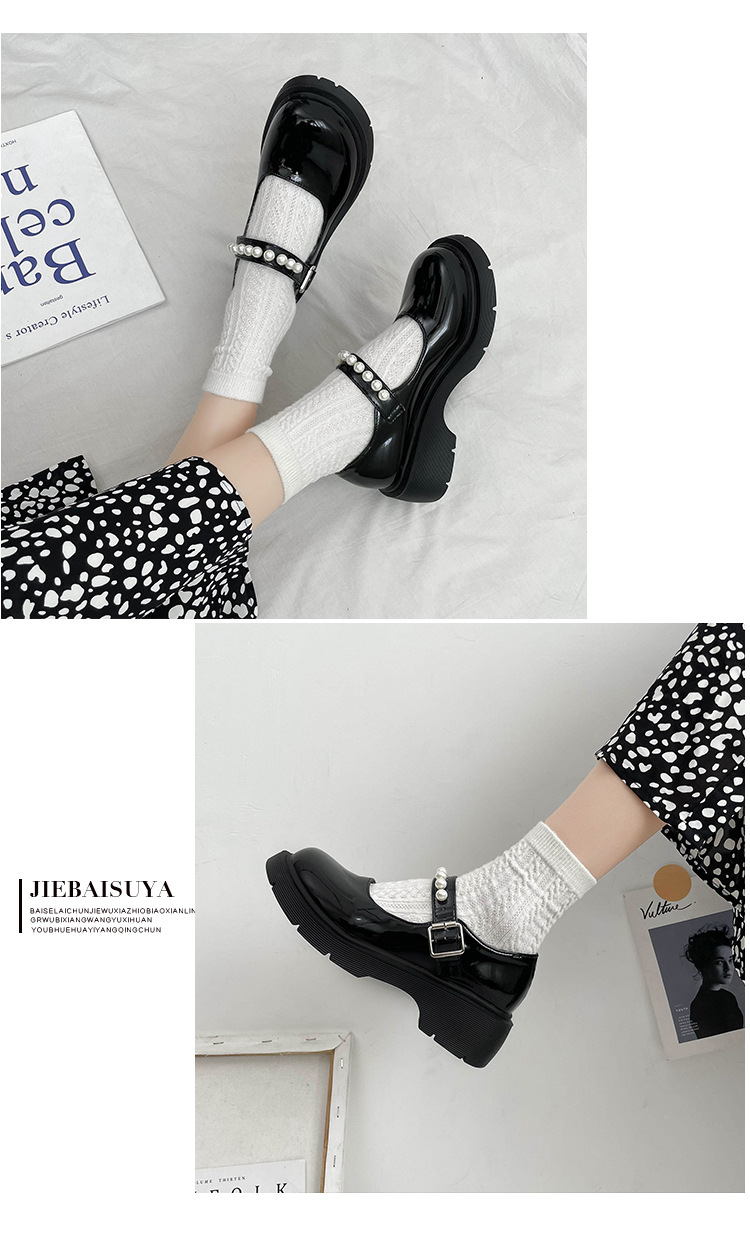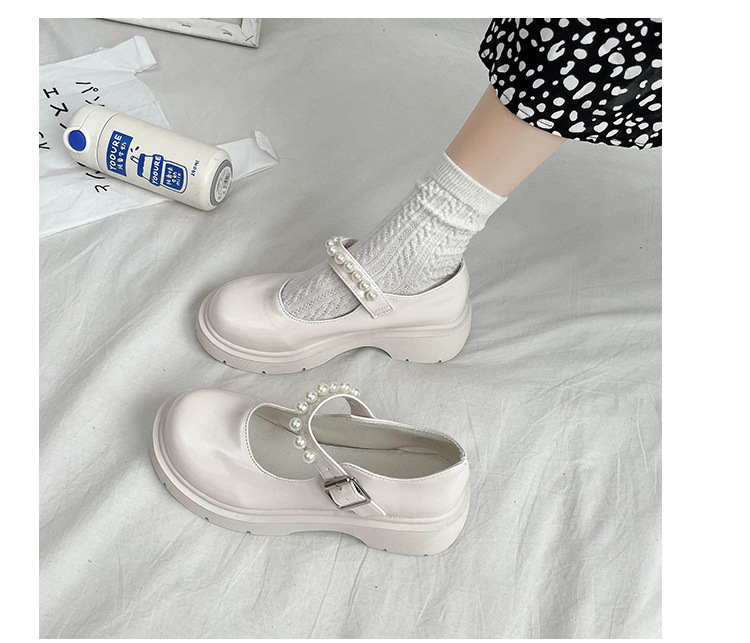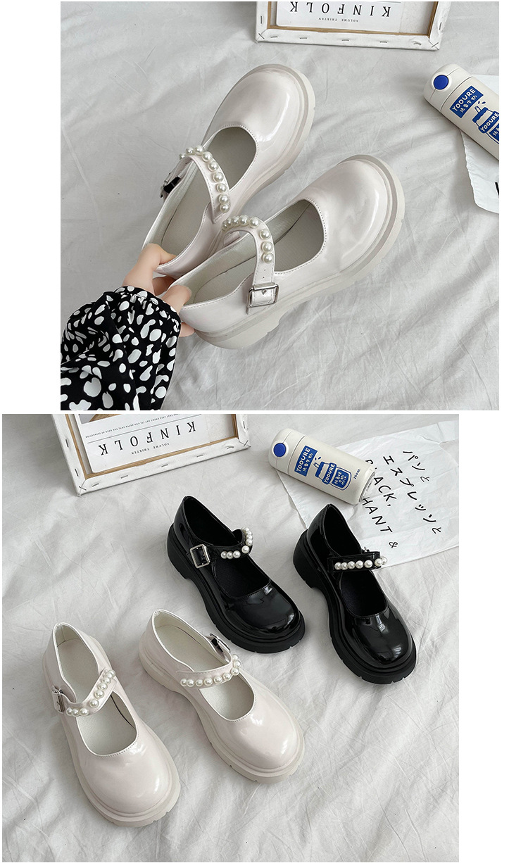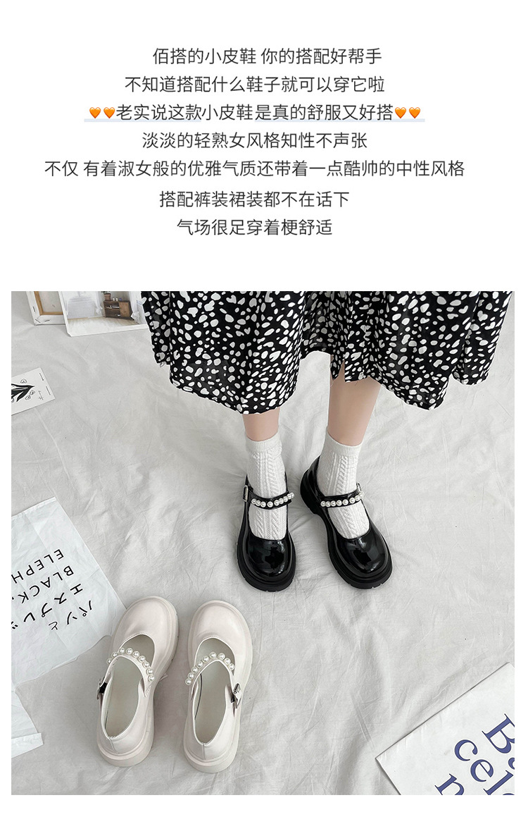 메리제인 슈즈 여성용 2025년 가을 신상 프렌치 스타일 라운드 토 얕은 굽 가죽 신발 진주 장식 굵은 굽 단화