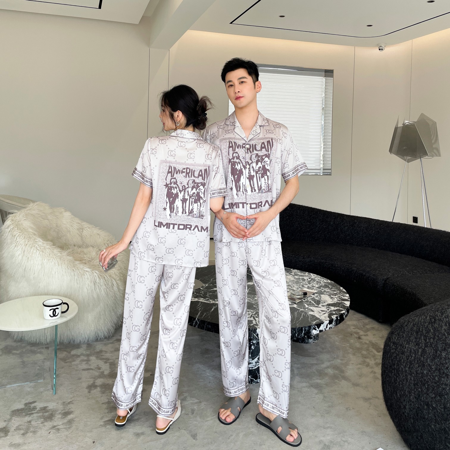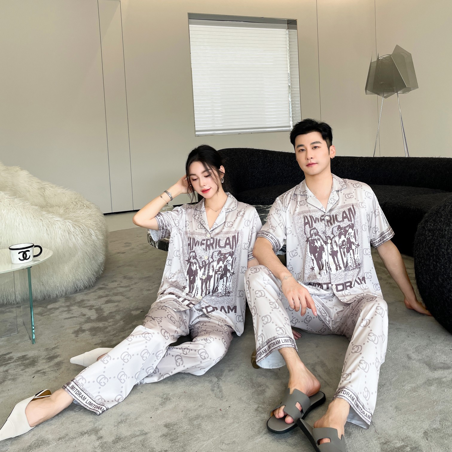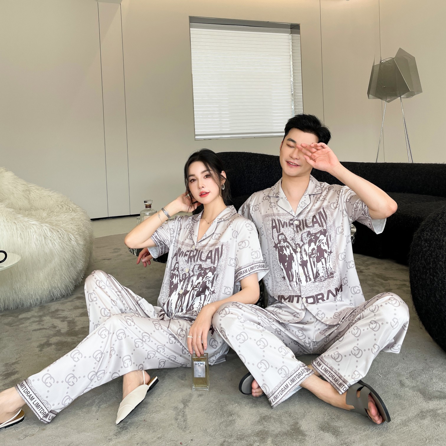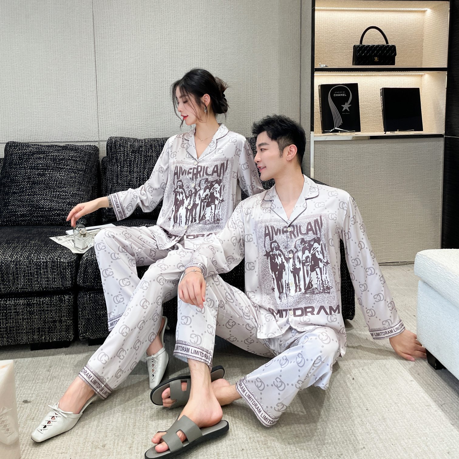 이른 봄 새 커플 잠옷 아이스 실크 긴 소매 홈 옷 남자 하이 엔드 포시즌 여자 아우터 세트 입고스토어 가기