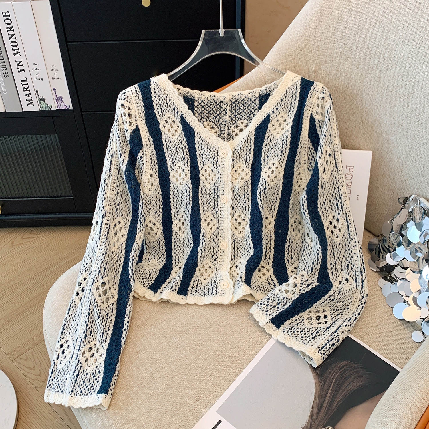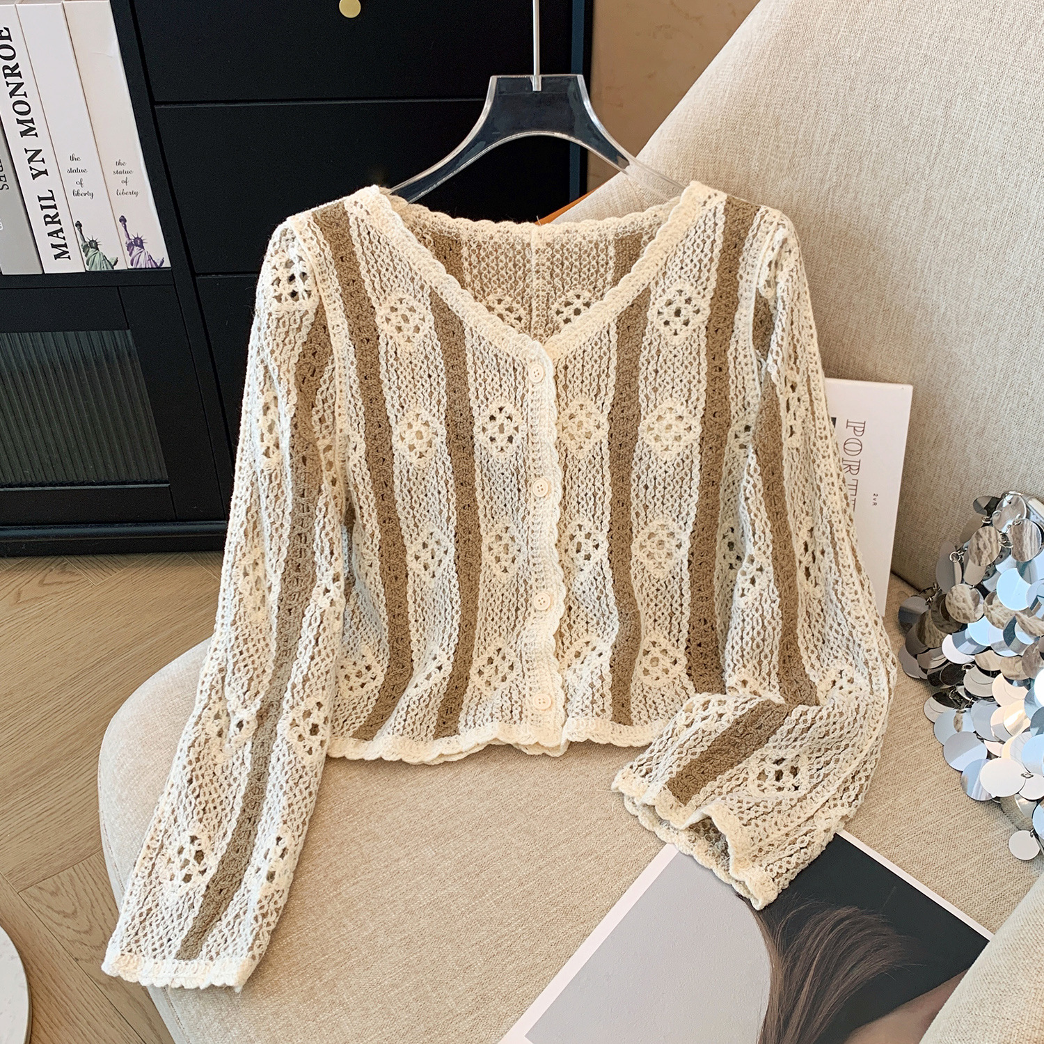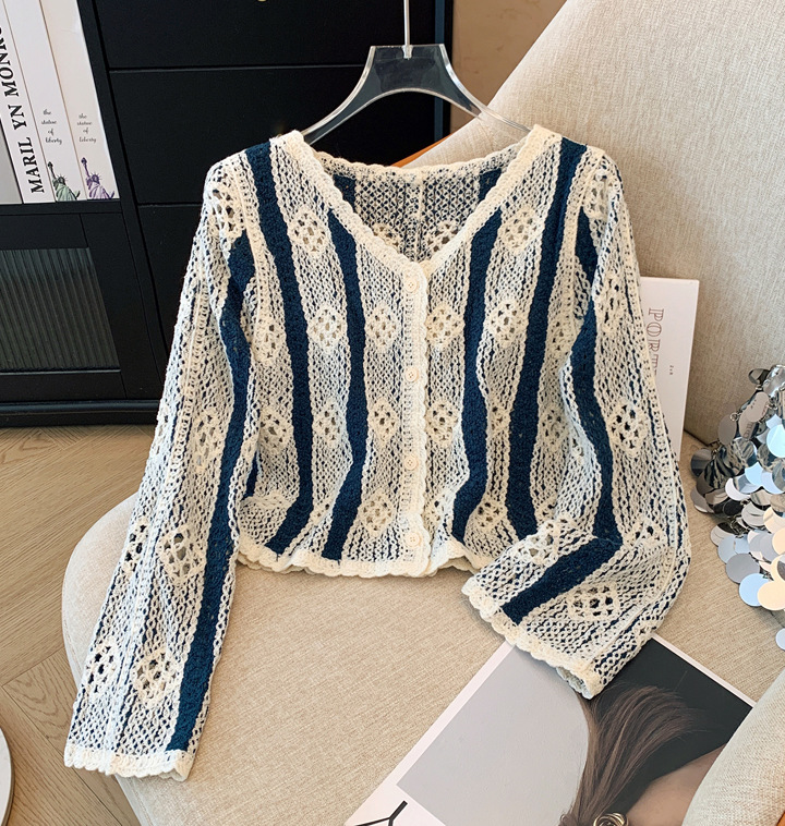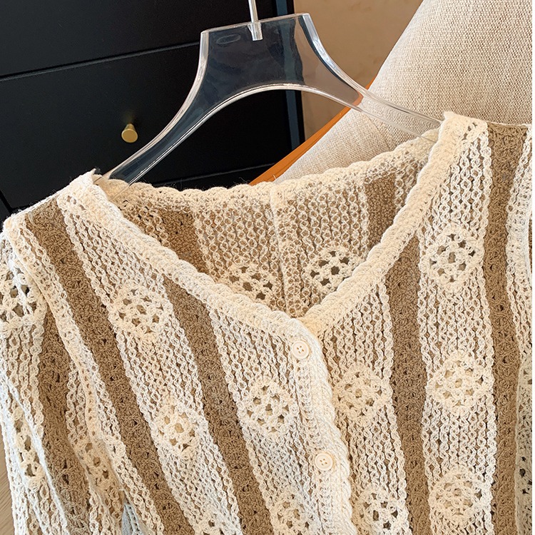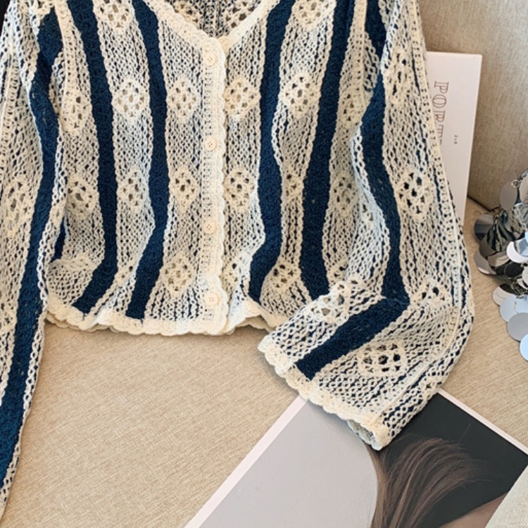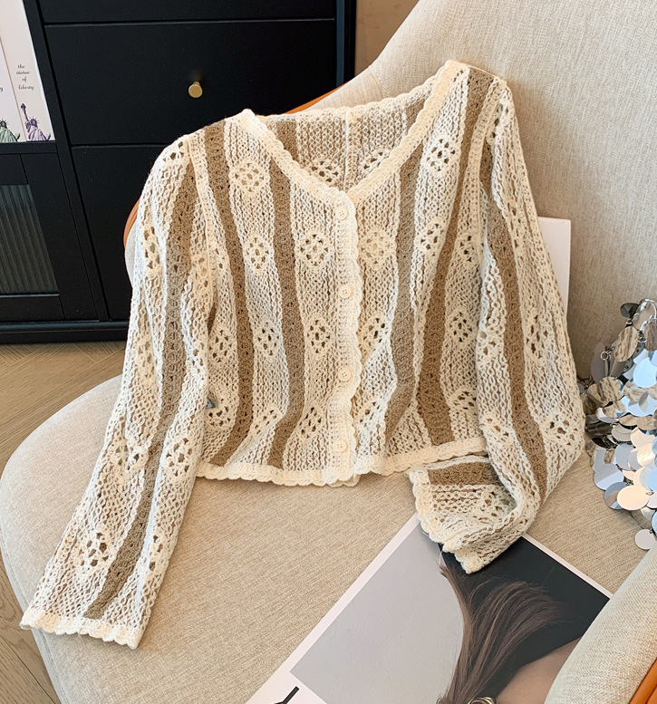 대외 무역 오리지널 주문 여성 의류 카운터, 초가을 레트로 콘트라스트 크로 셰 뜨개질 빈 니트 카디건 여성 디자인 탑 철수