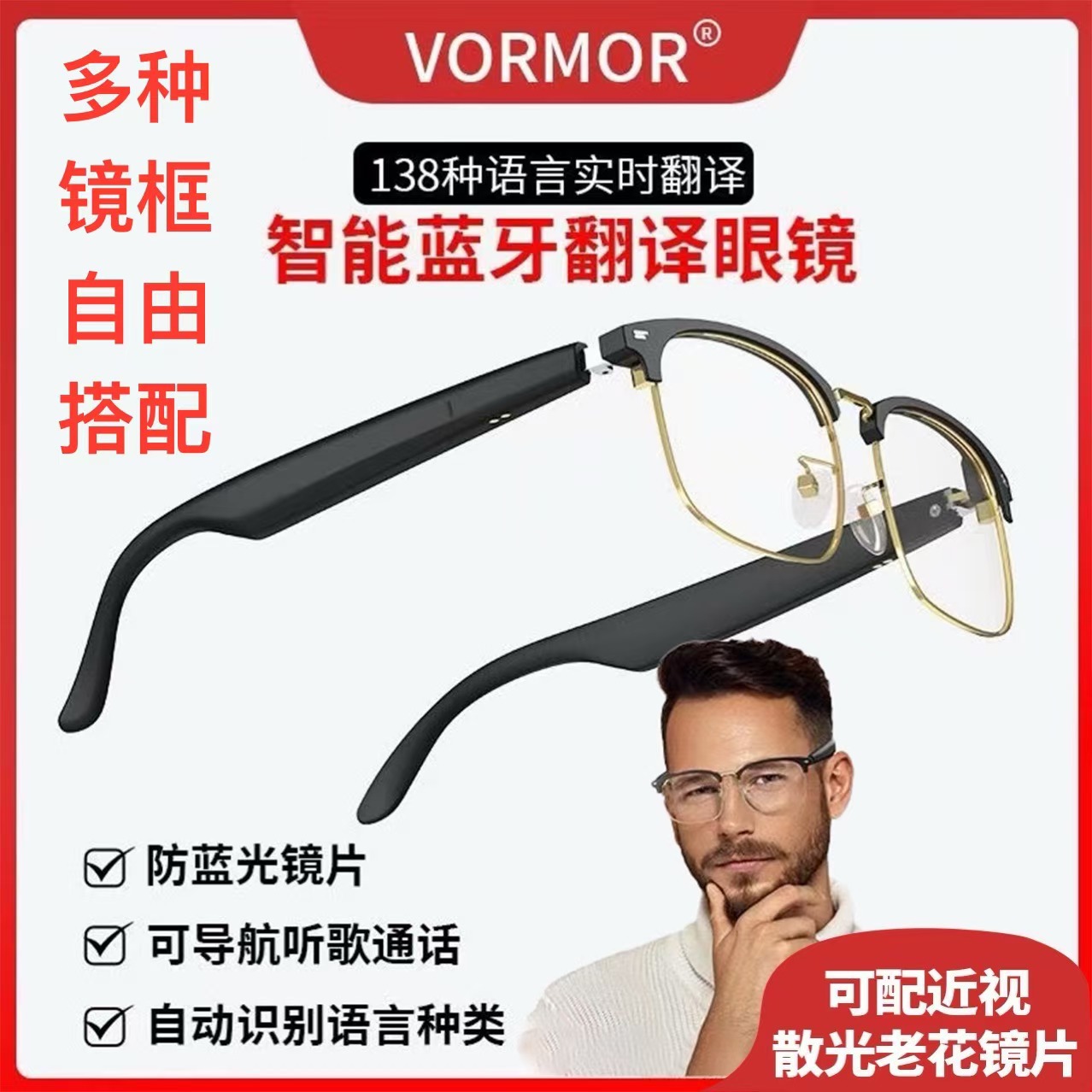 국경 간 블루투스 번역 안경 다기능 헤드셋 안경은 노래를들을 수 있고, 전화, 카메라, 블루 라이트 무선 스마트스토어 가기