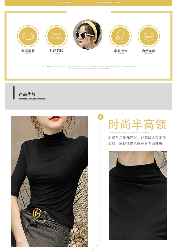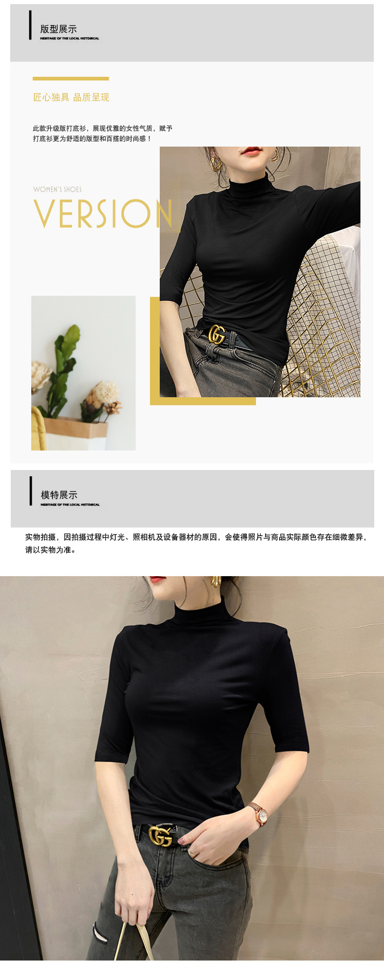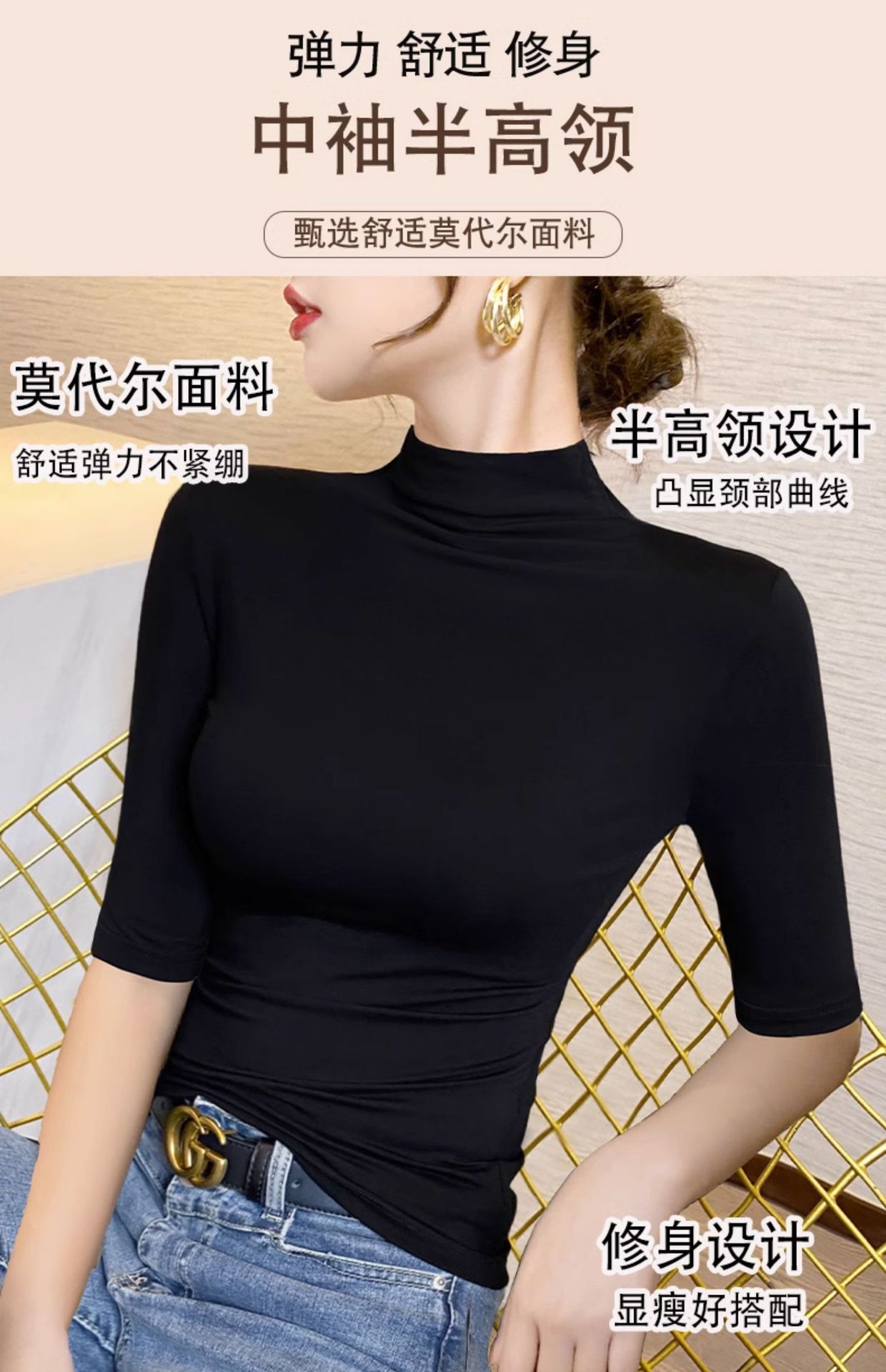 블랙 모달 하프 하이 칼라베이스 셔츠 미드 슬리브 티셔츠 여성용 여름 및 가을 반소매 얇은 세븐 슬리브 이너 탑