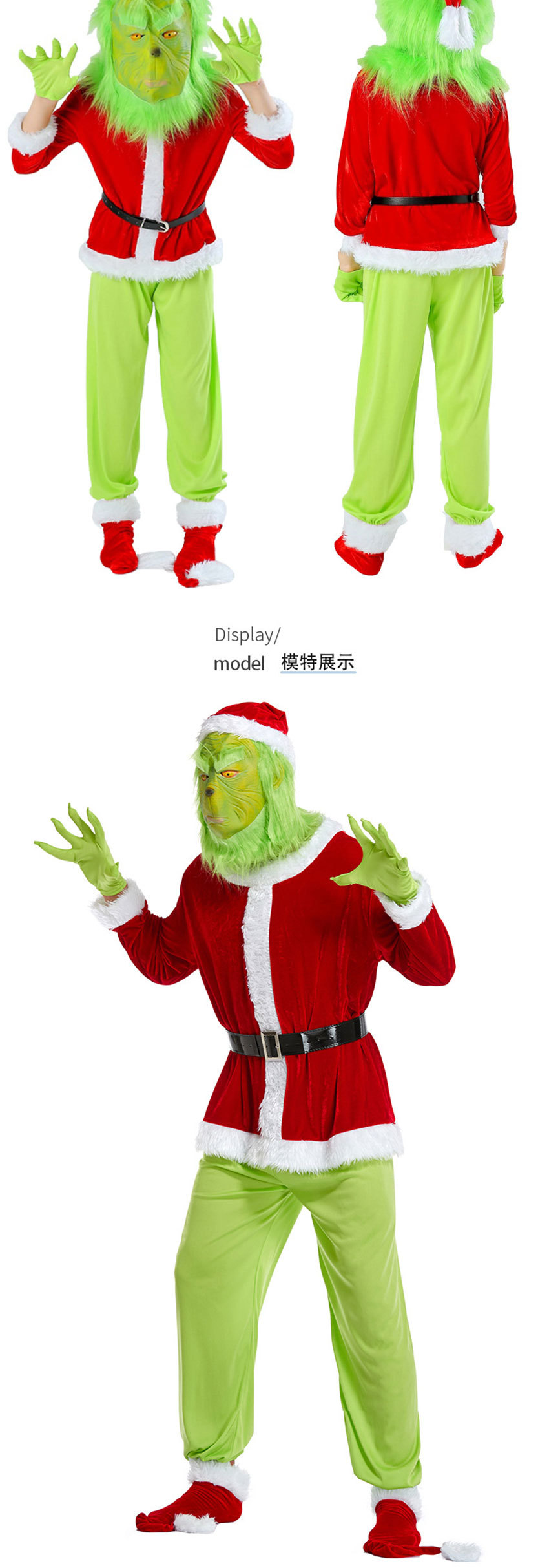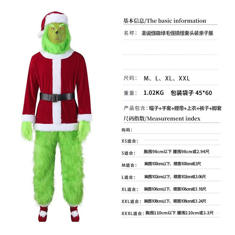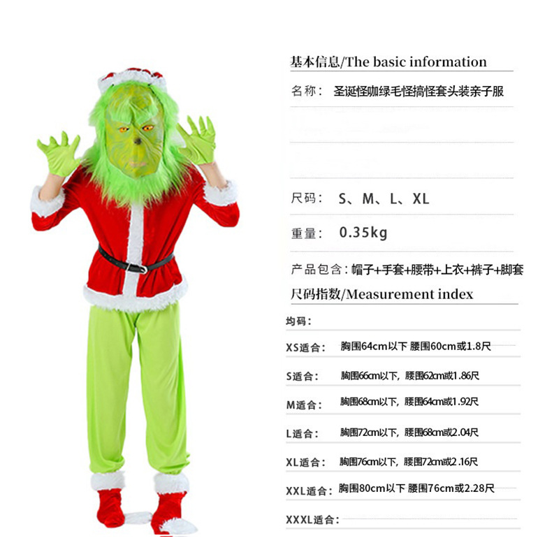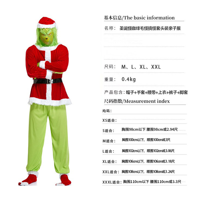 노인 코스프레 의상, 남녀 커플용, 녹색 머리가 있는 괴물 그린 공연 의상, 크리스마스 드레스, 코스프레 의상