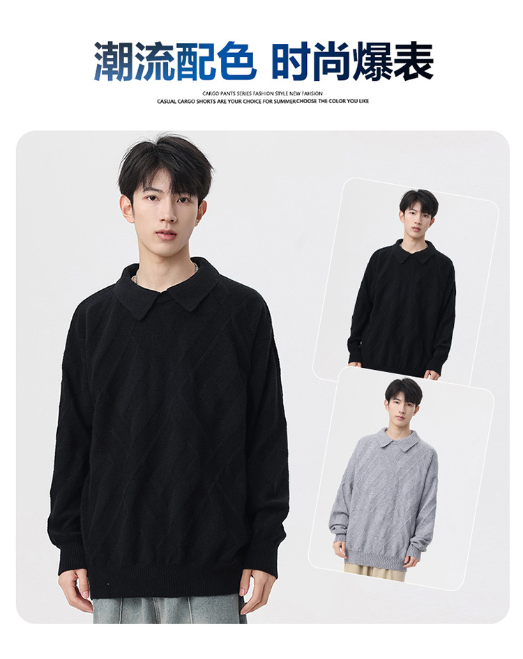 스웨터 남자 봄과 가을 긴팔 일본 스타일 신선한 Ins 트렌디 한 브랜드 느슨한 올 매치 폴로 셔츠 솔리드 컬러베이스 스웨터
