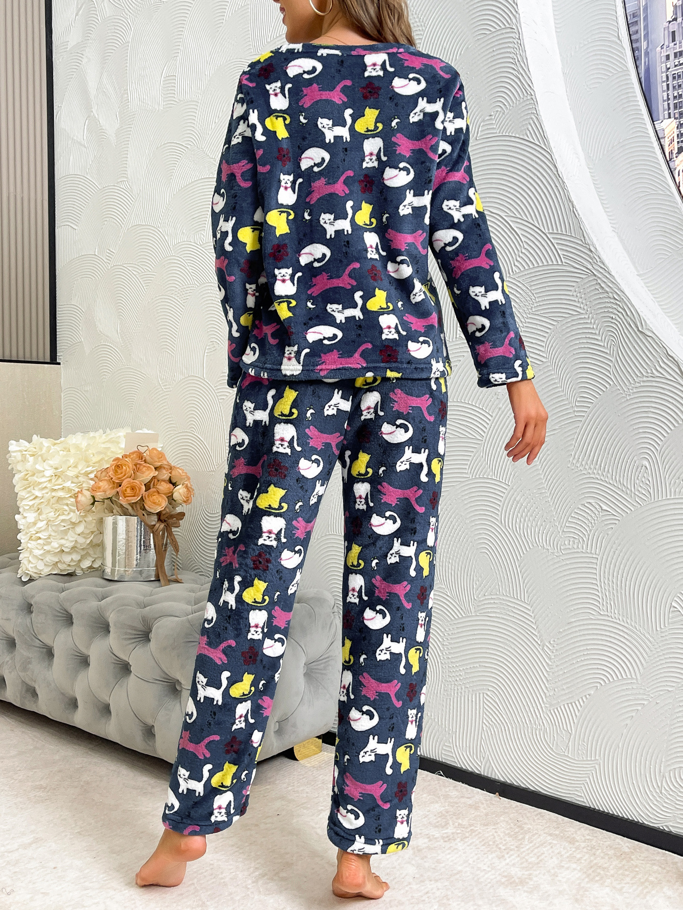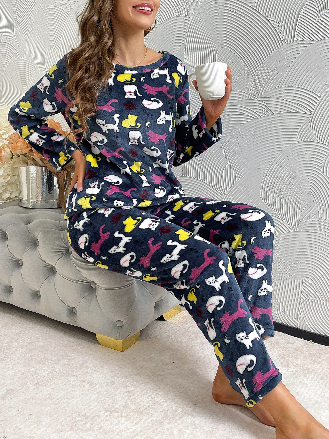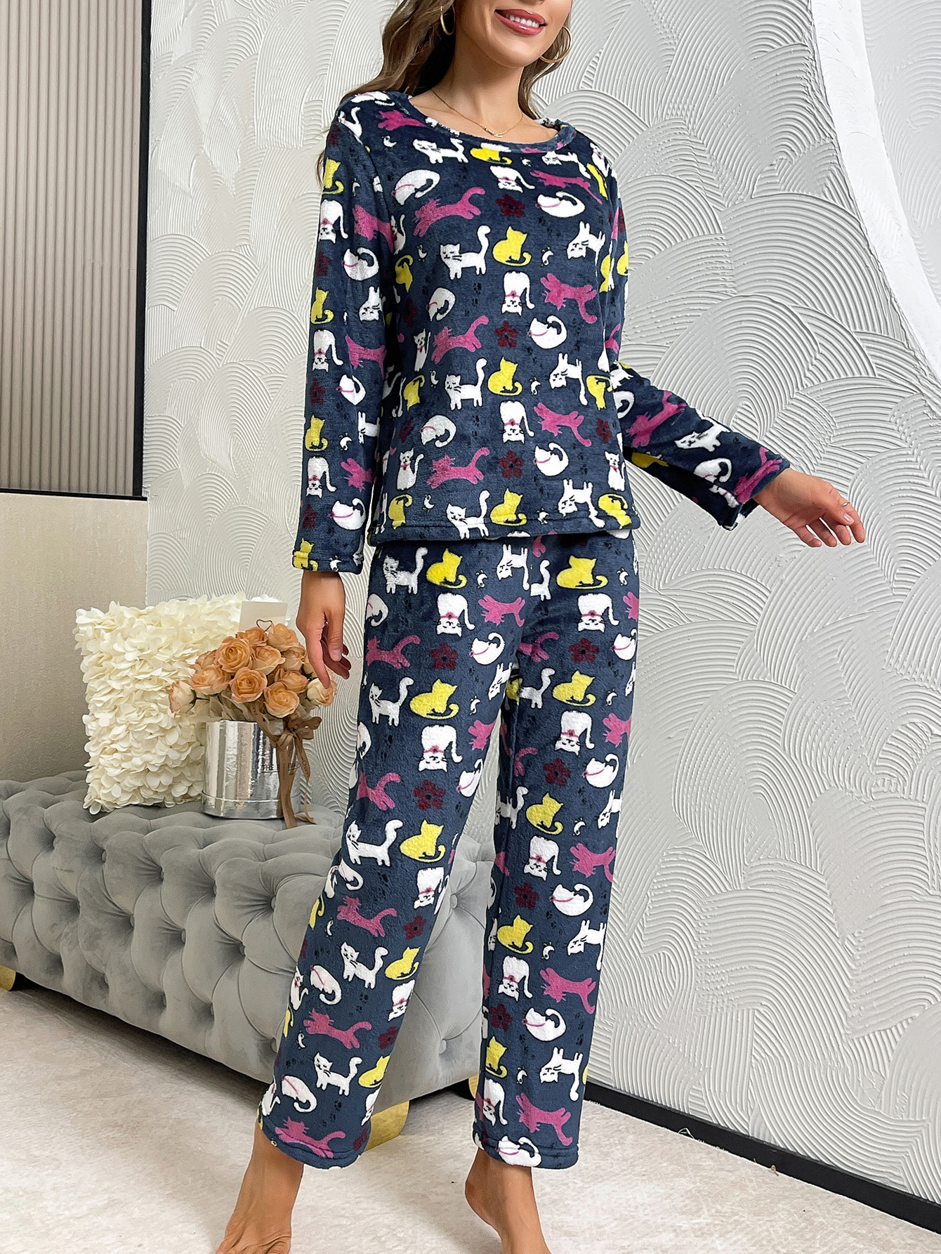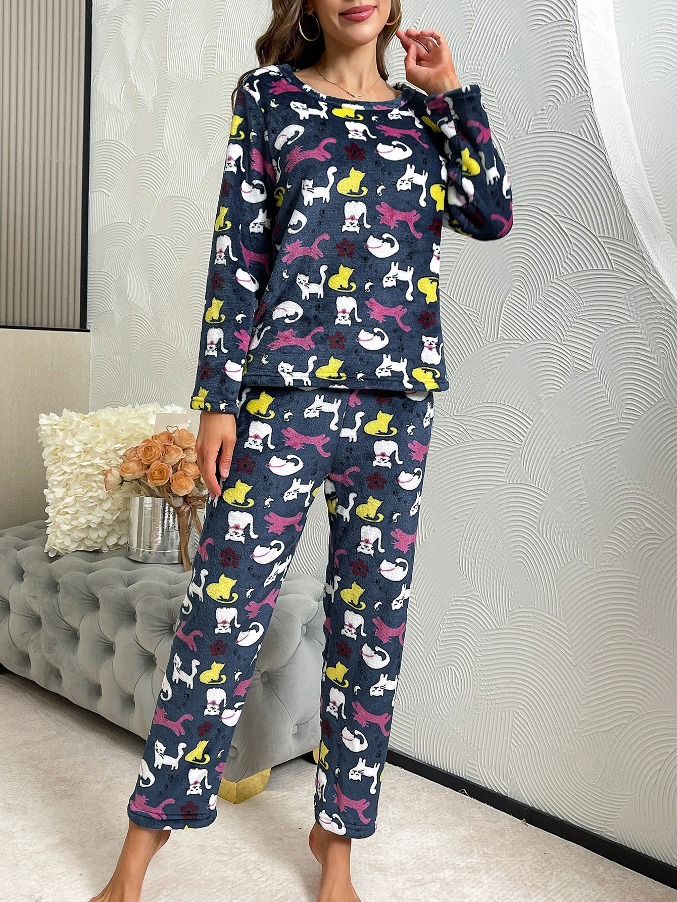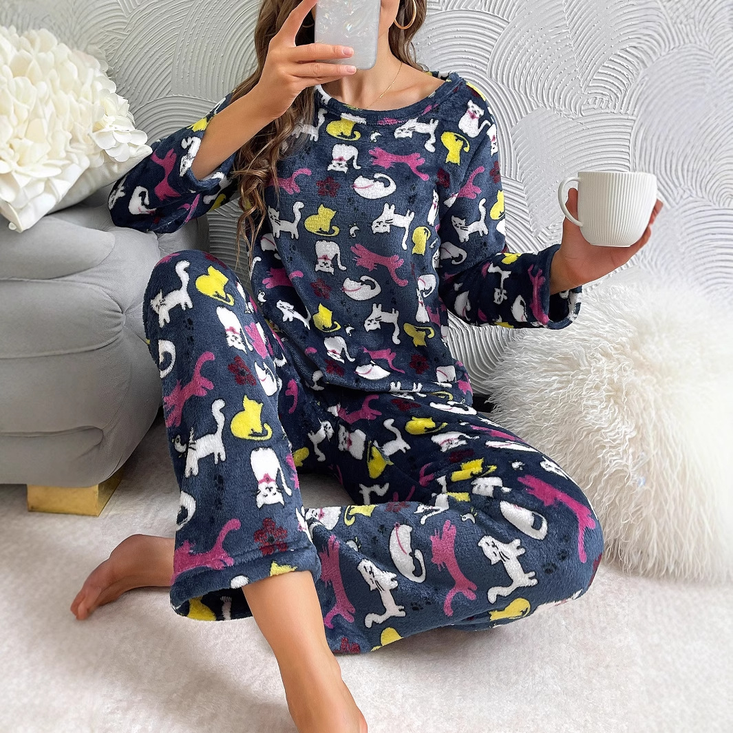 국경 간 가을과 겨울 두꺼운 따뜻한 편안한 부드러운 긴 소매 바지 인쇄 홈 의류 세트 여성스토어 가기