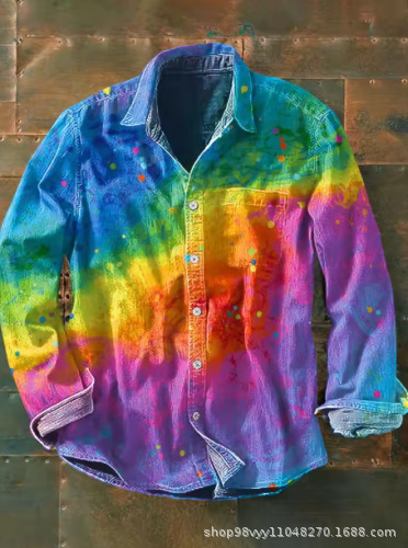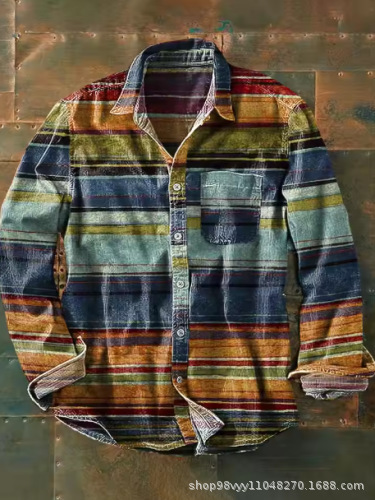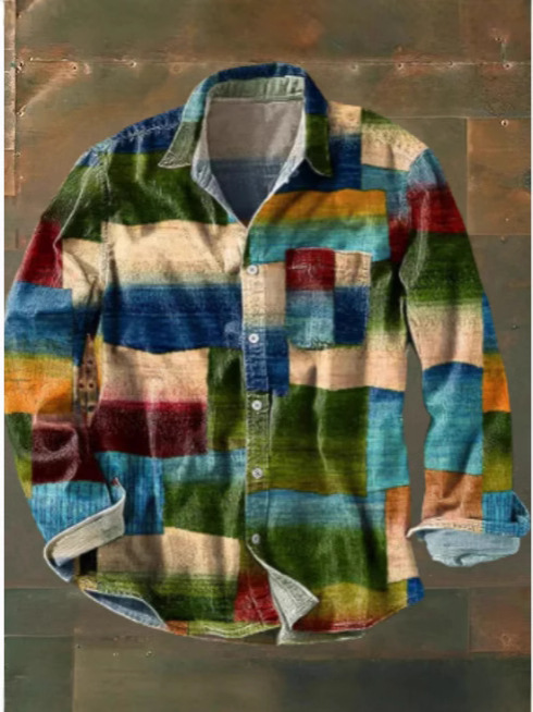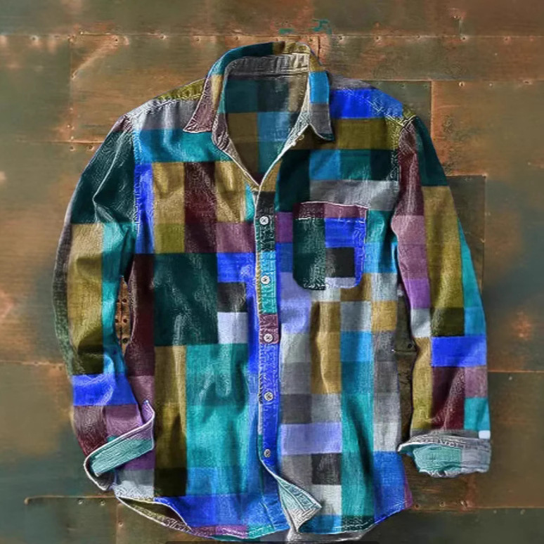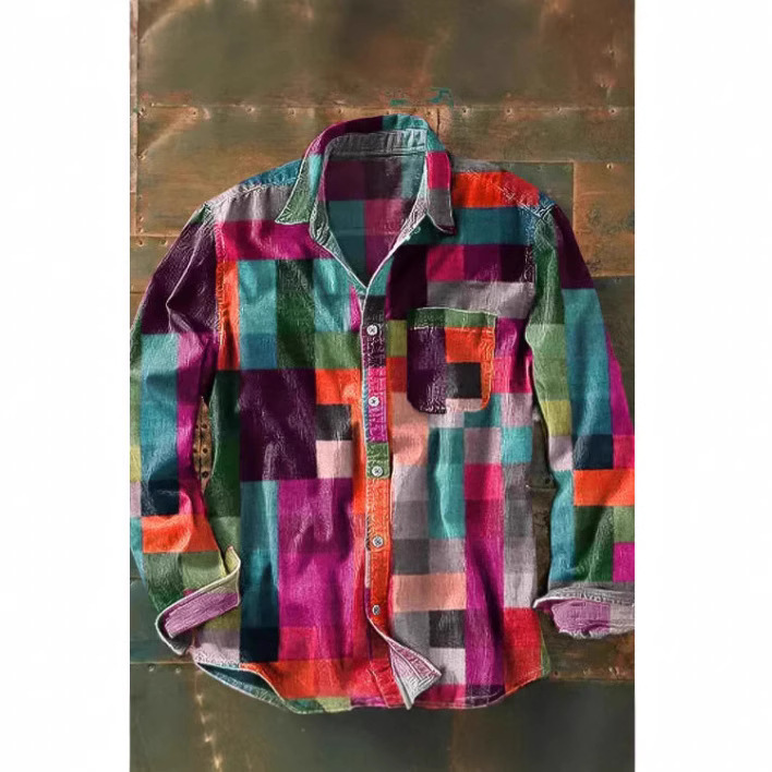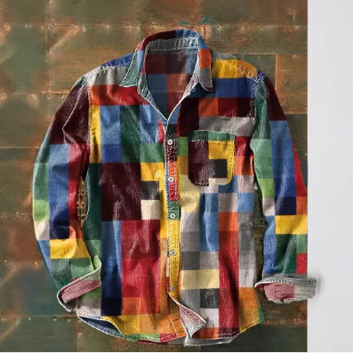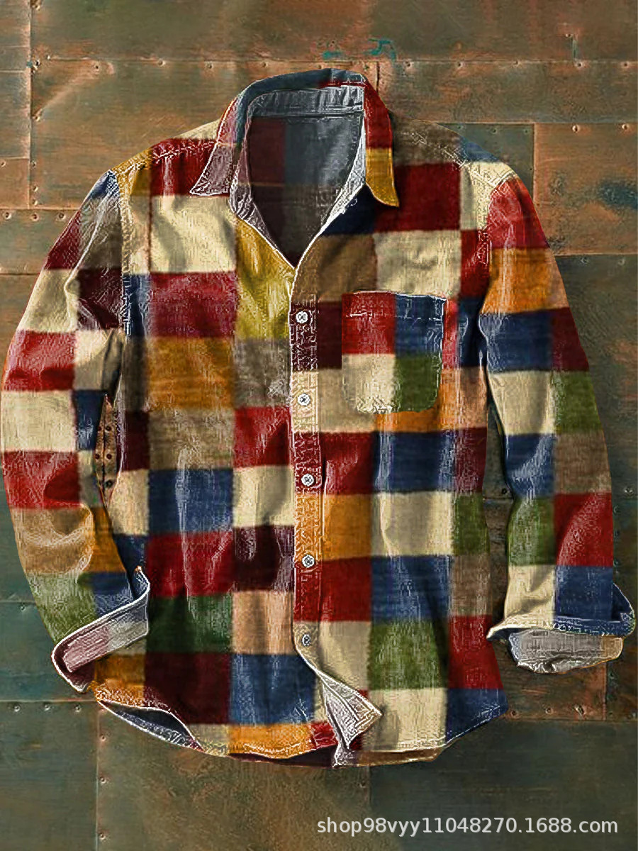 2025년 신상 아마존 레트로 스타일 인기 배색 체크무늬 3D 프린팅 트렌디 긴팔 버튼업 셔츠 (남성용)