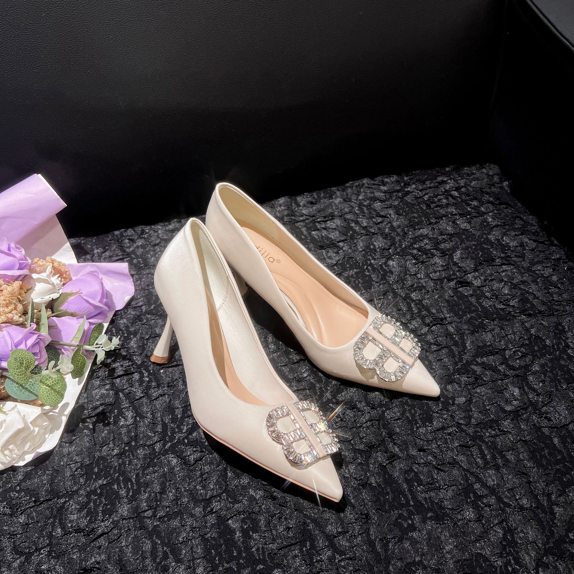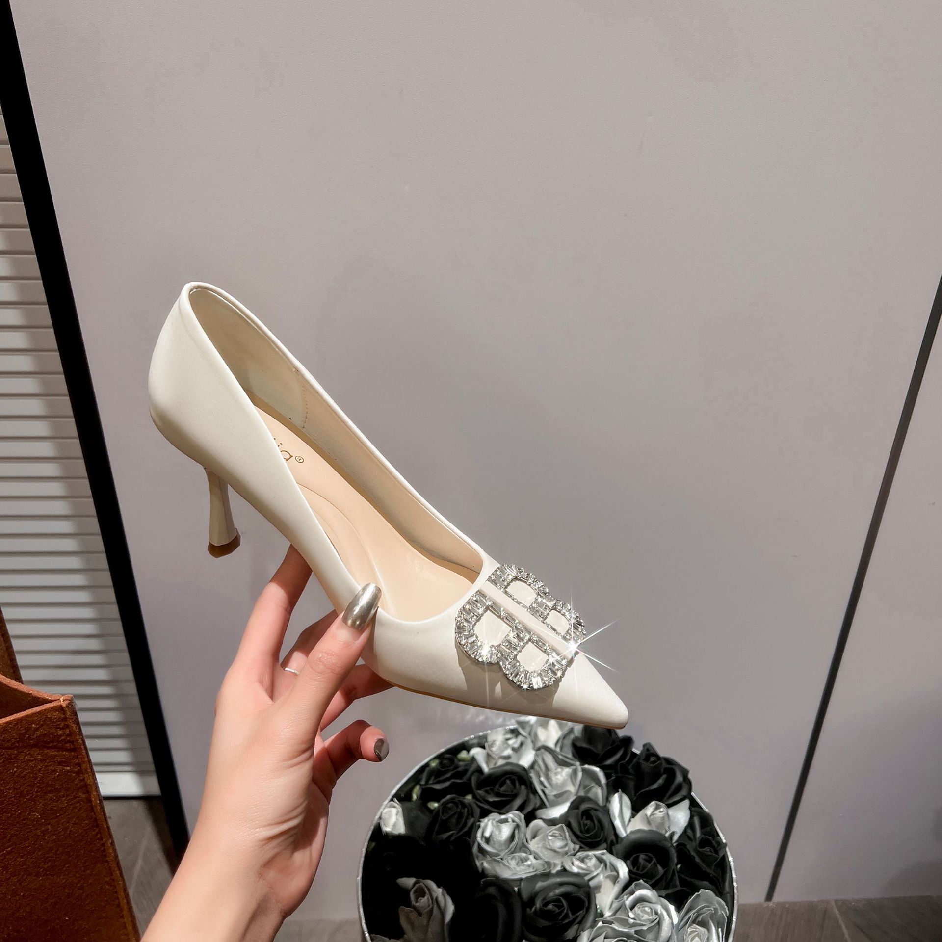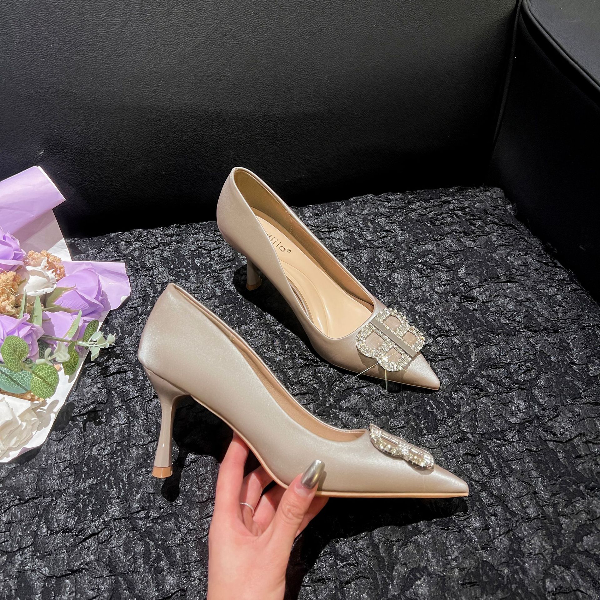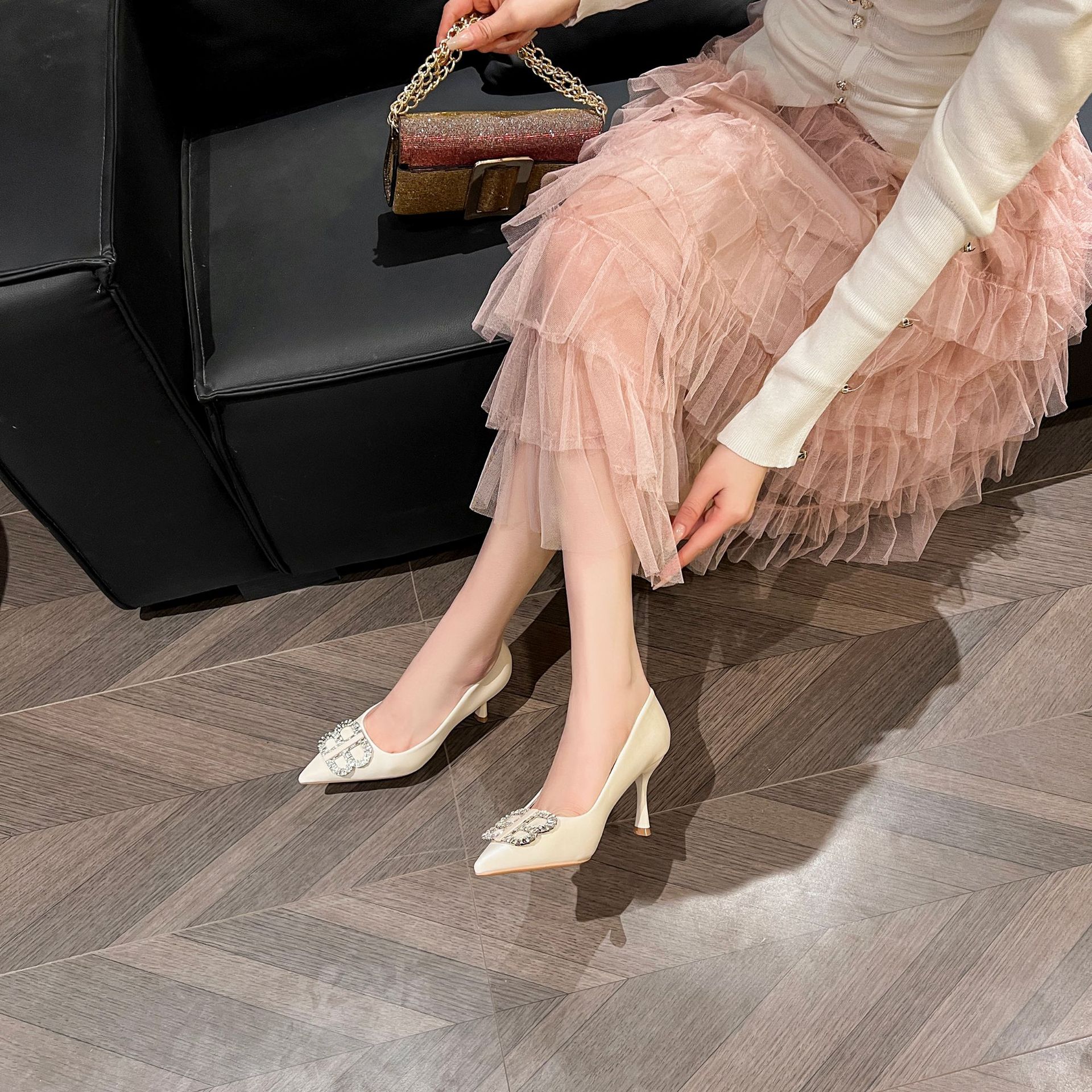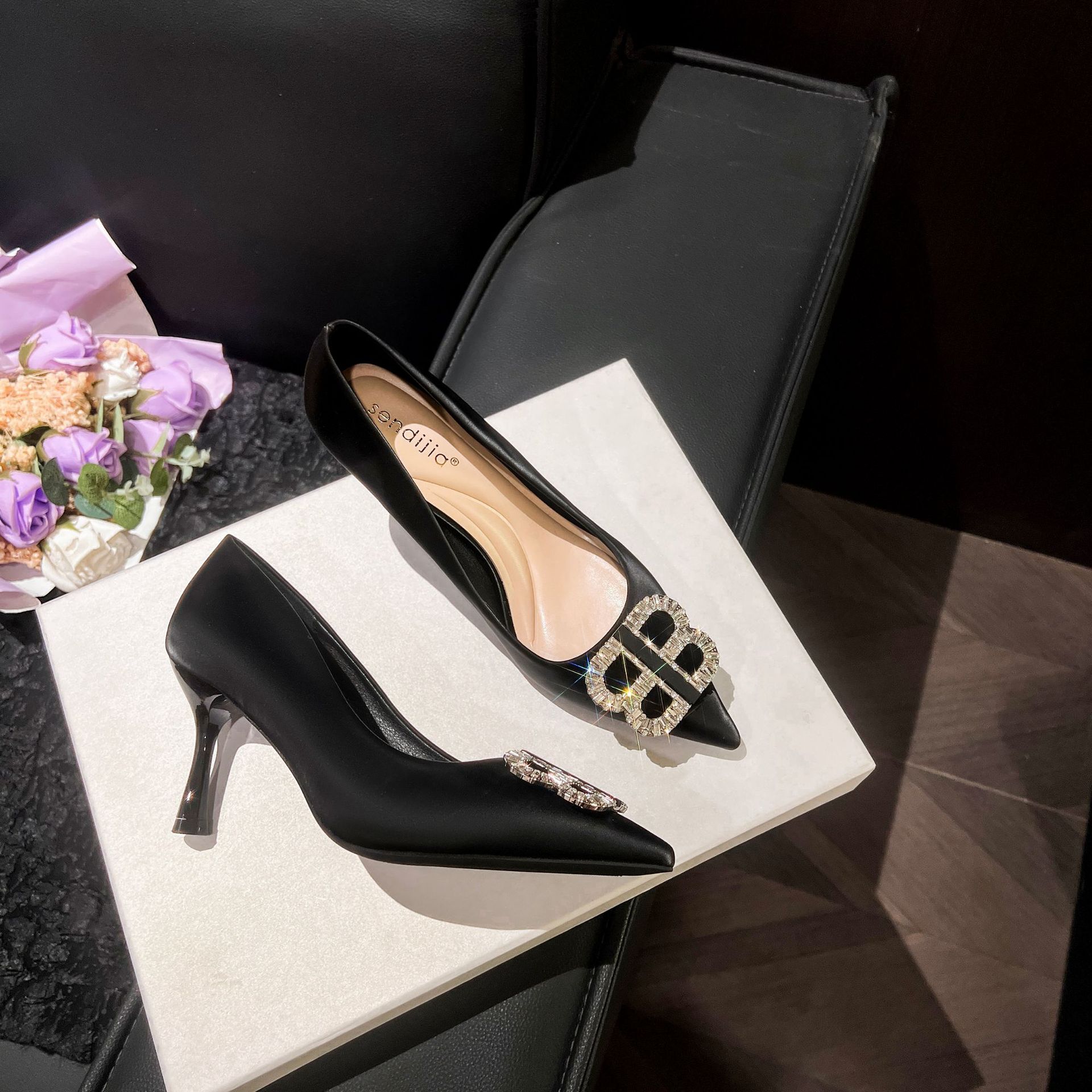 A555-22 하이힐 슈즈 여성용 2024 새로운 통근 스타일 빛나는 다이아몬드 버튼 스몰 힐 올매치 우아한 포인팅 슈즈스토어 가기