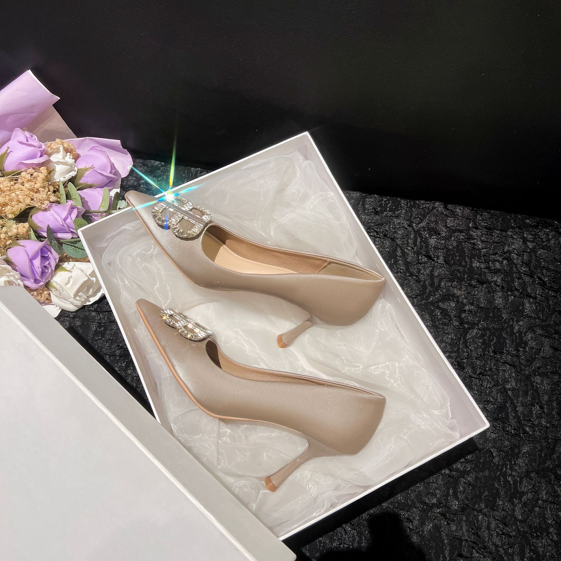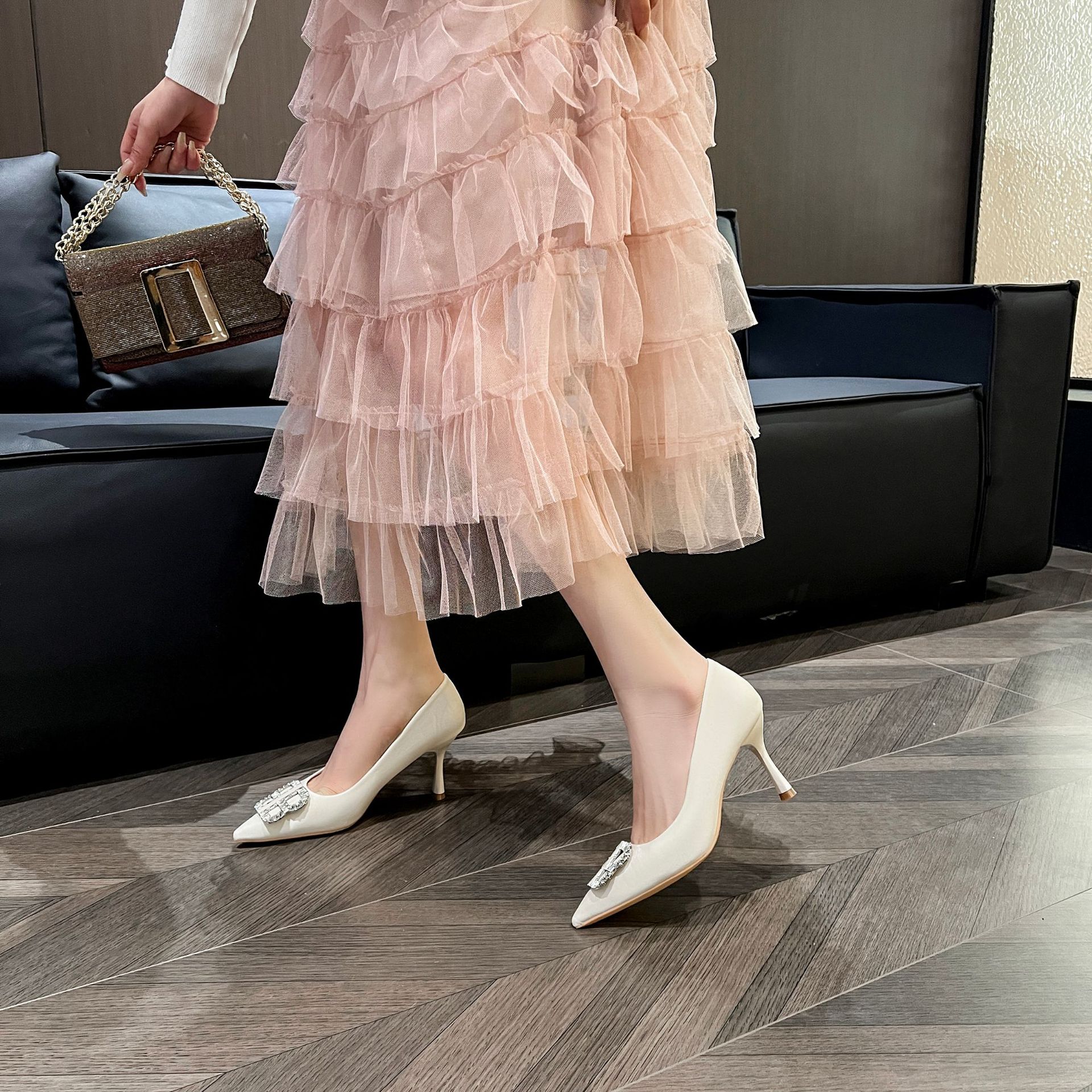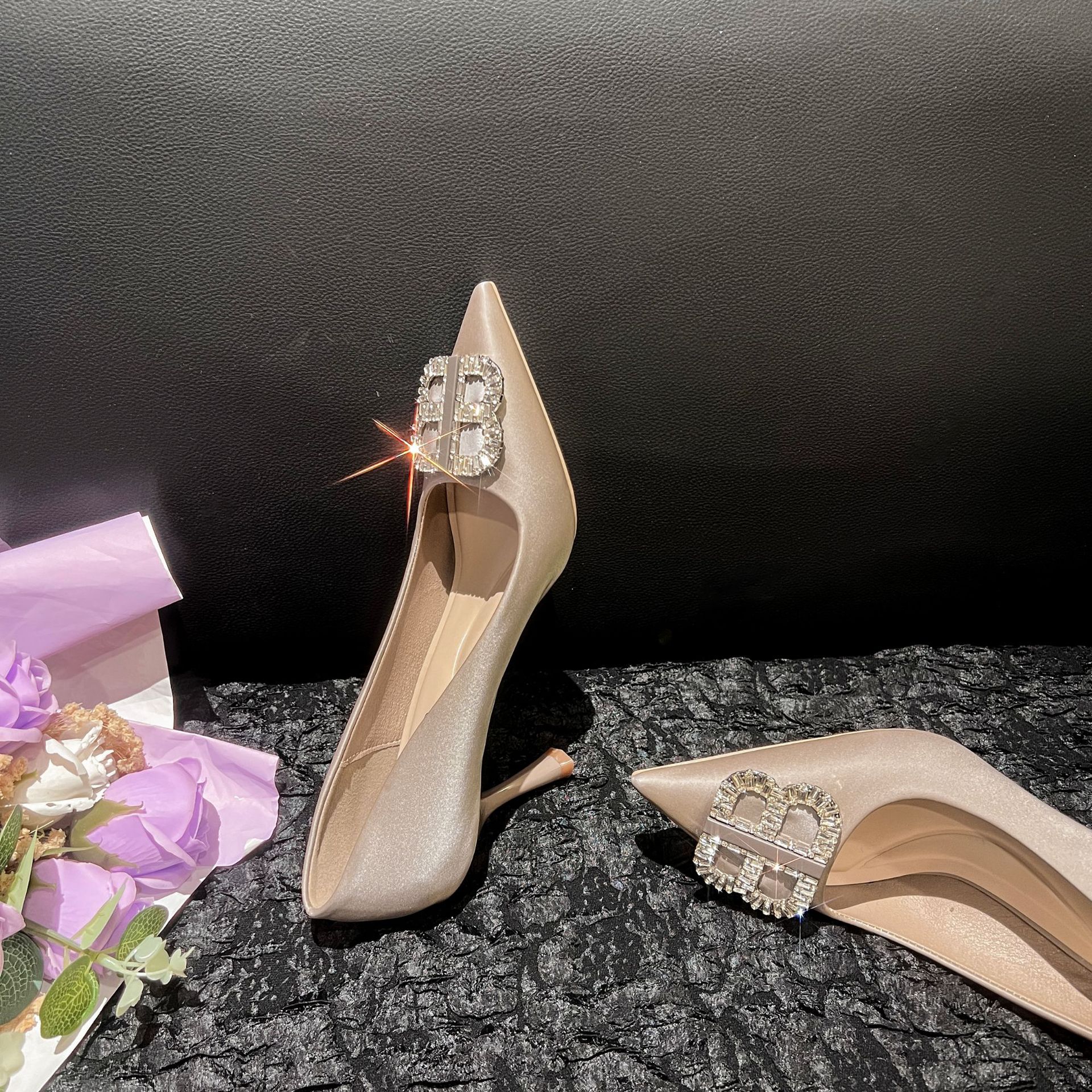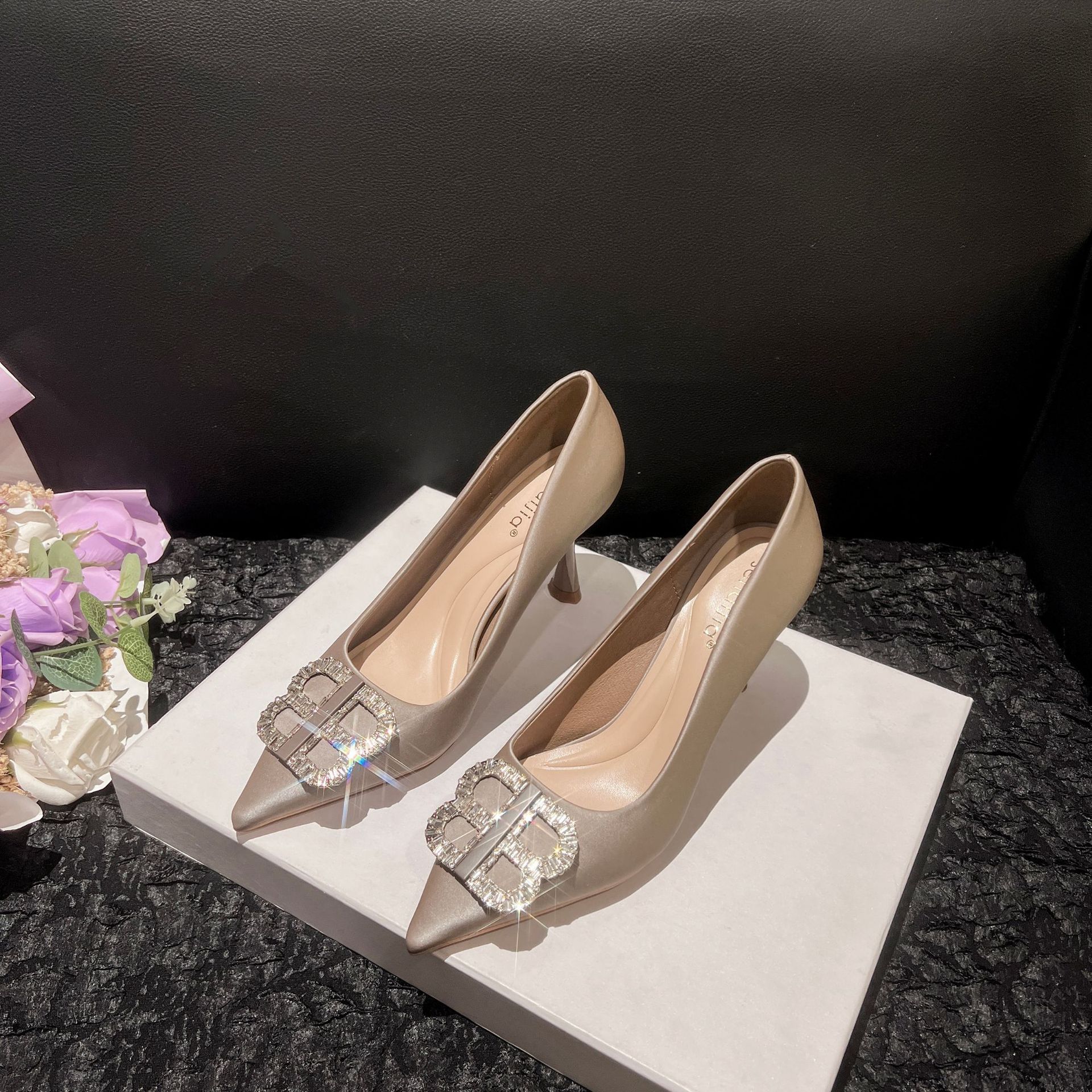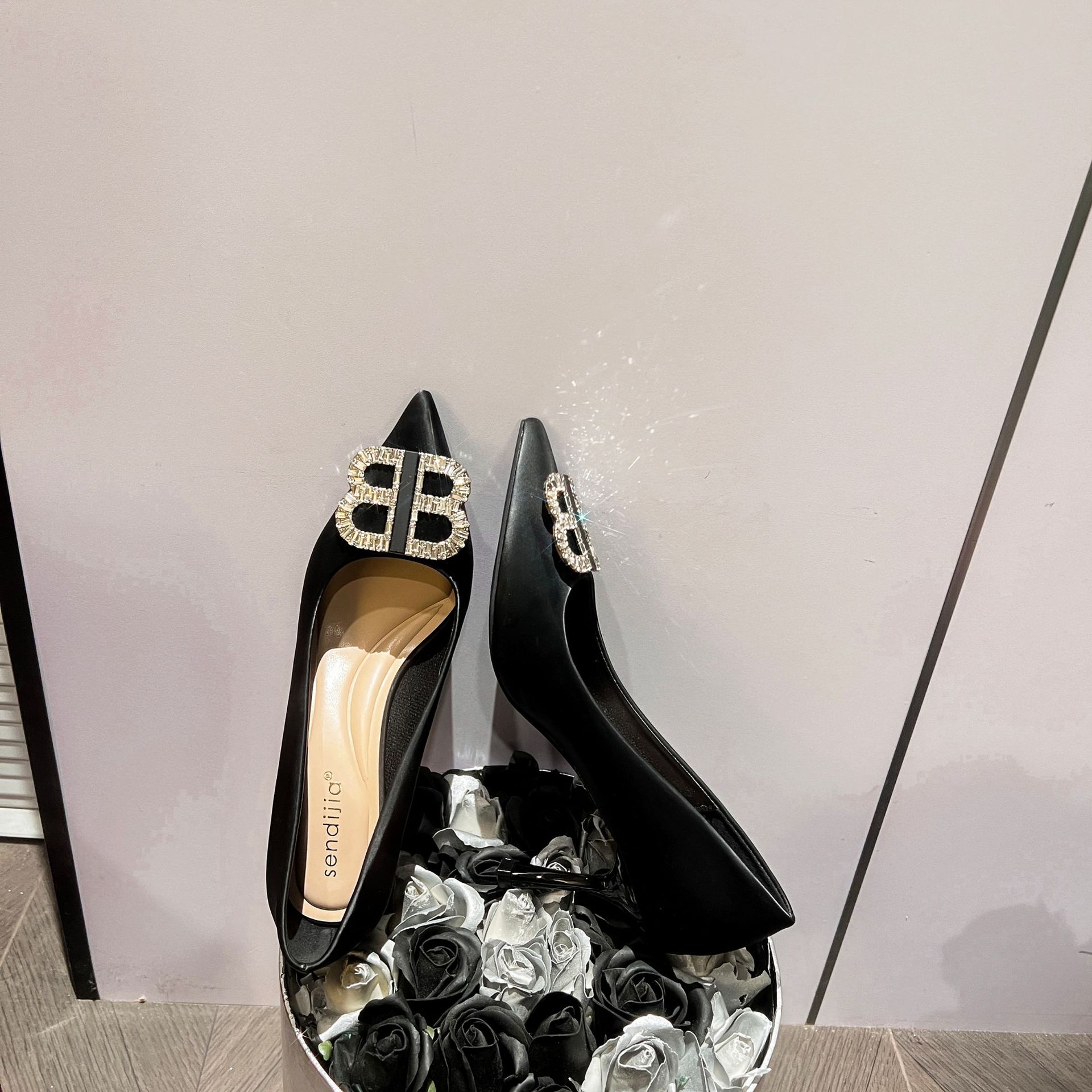 A555-22 하이힐 슈즈 여성용 2024 새로운 통근 스타일 빛나는 다이아몬드 버튼 스몰 힐 올매치 우아한 포인팅 슈즈스토어 가기
