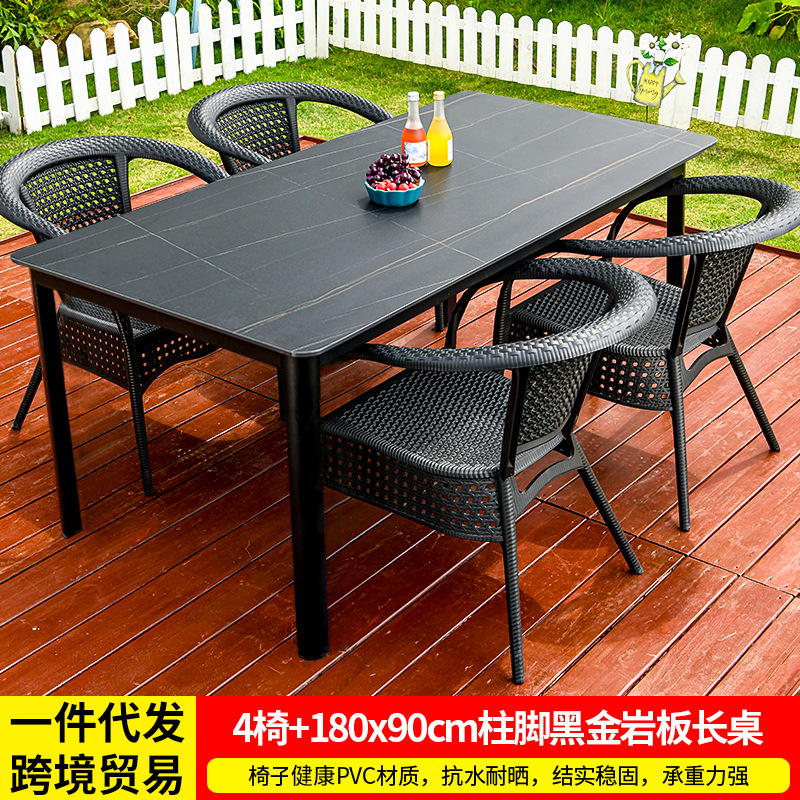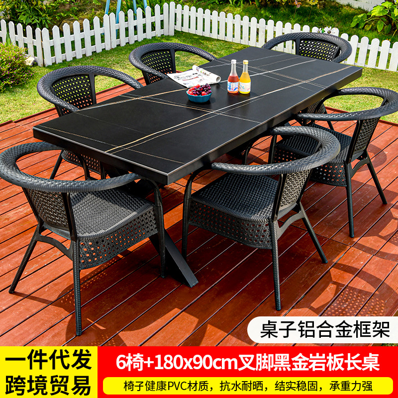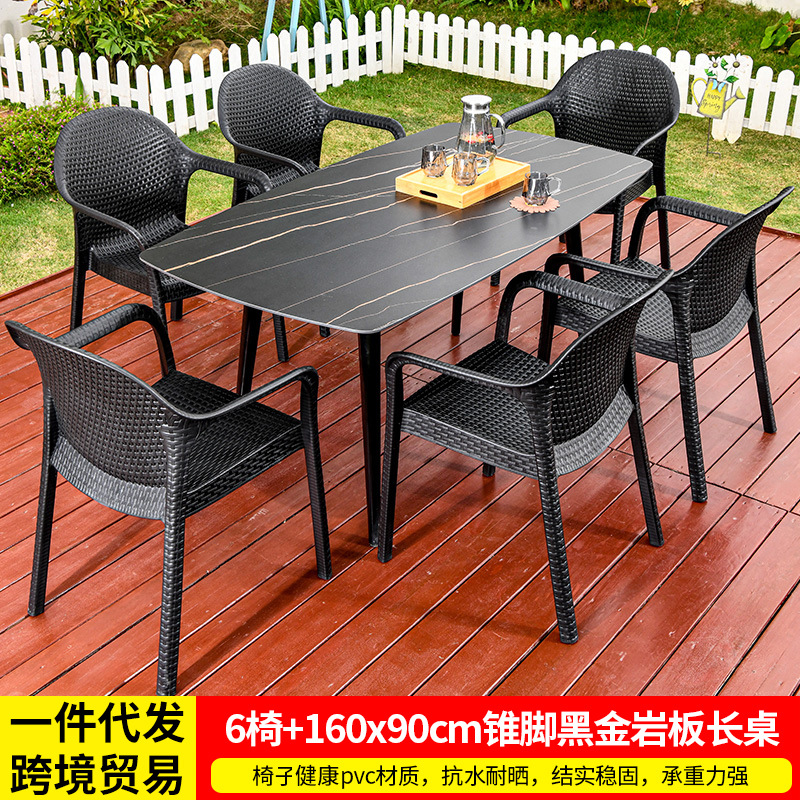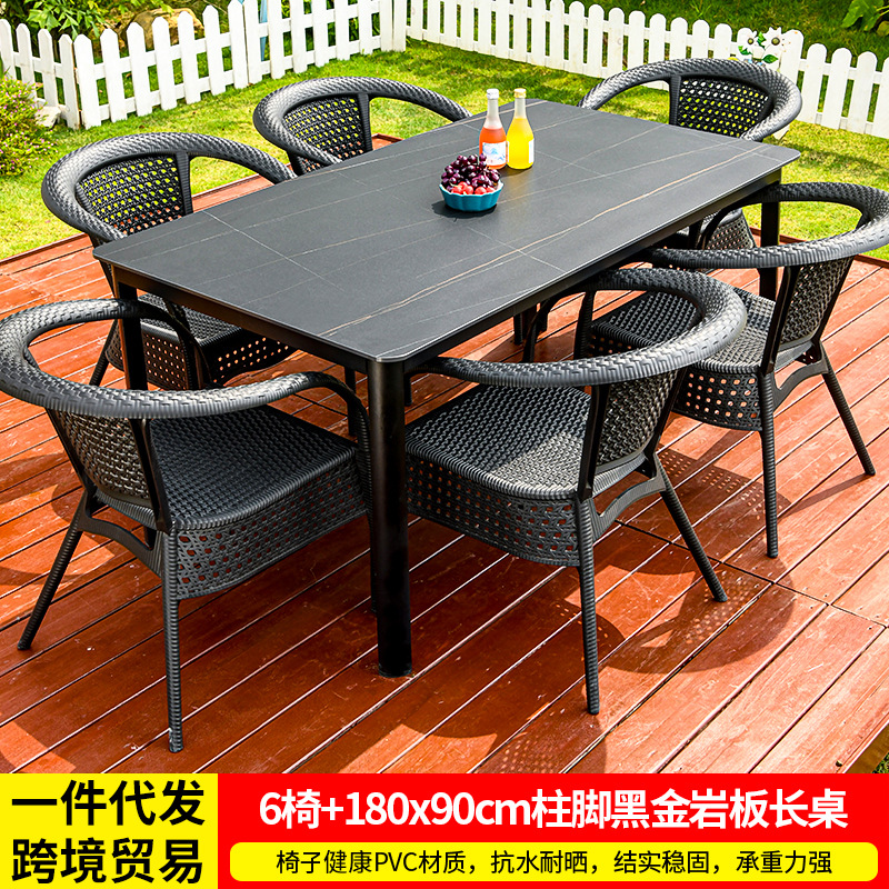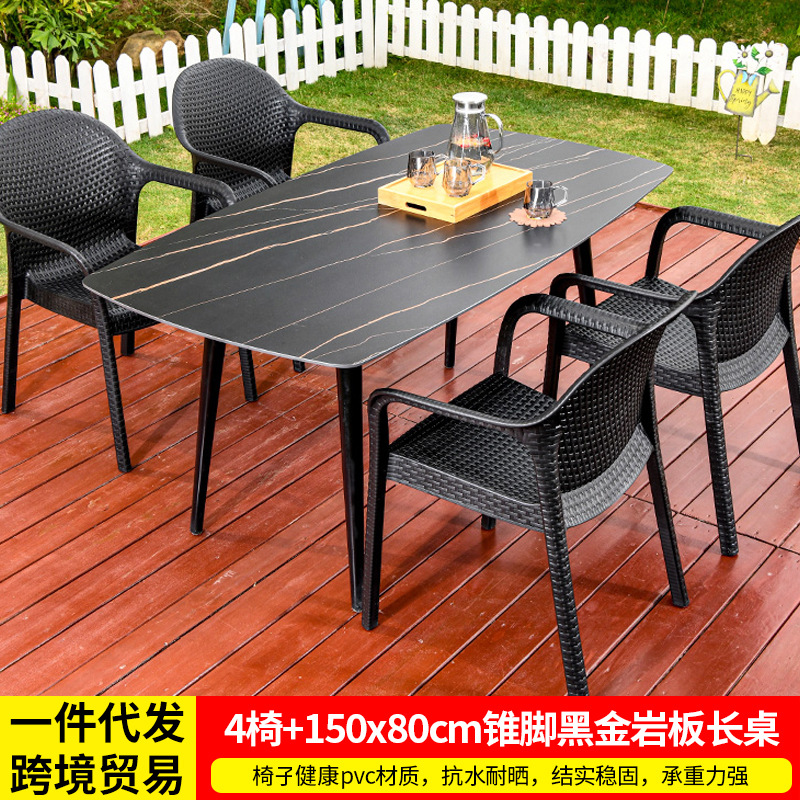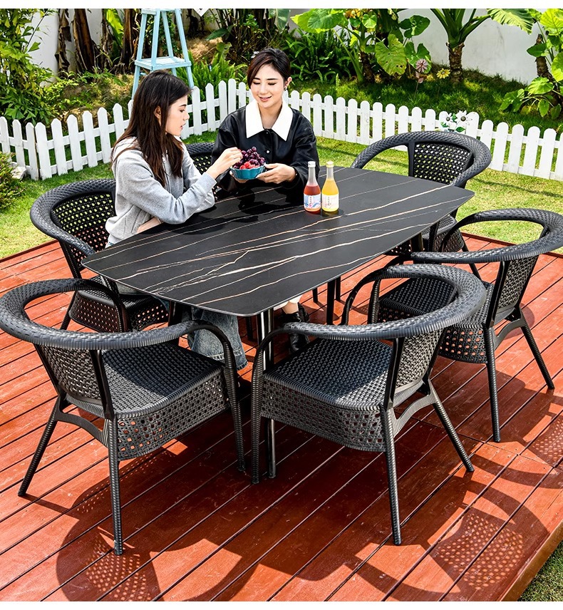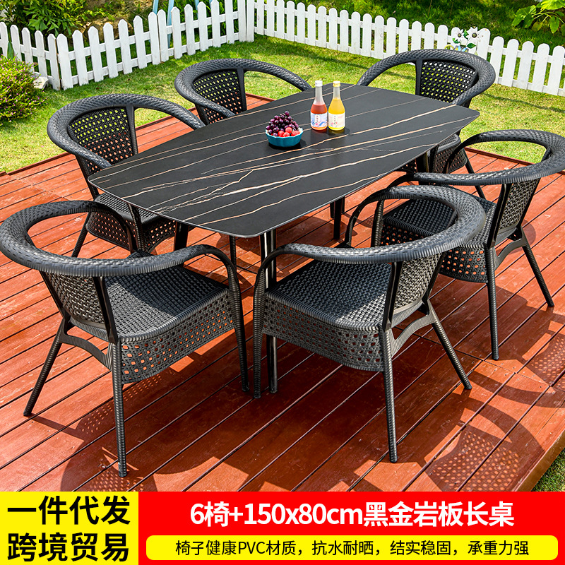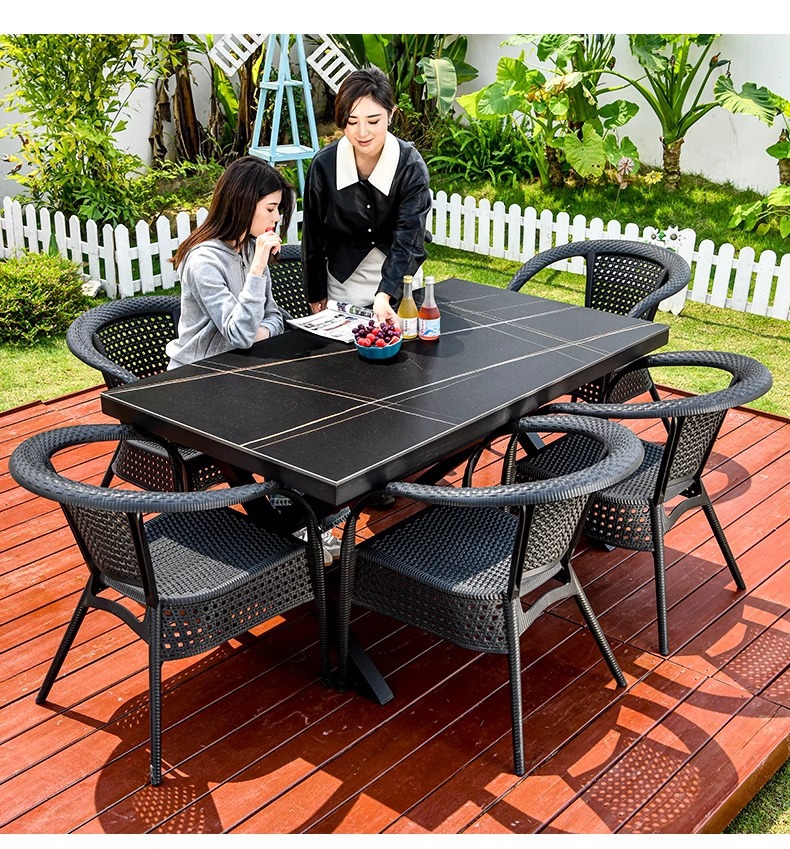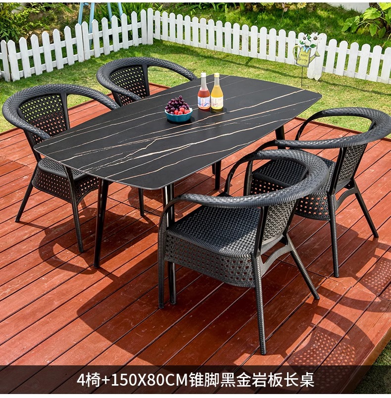 야외 테이블 및 의자 안뜰 바위 접시 식탁 제조 업체 야외 레저 긴 테이블 모조 등나무 의자 테라스 안뜰 테이블 및 의자 조합