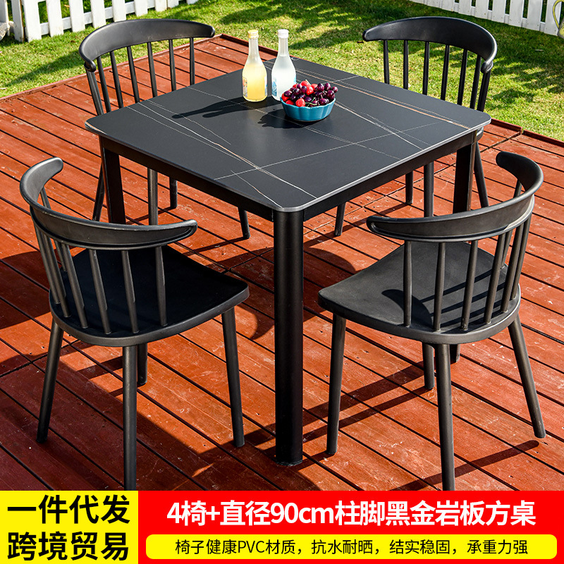 • 로마 의자 4개 + 80cm 기둥 다리 블랙 골드 슬레이트 사각 테이블