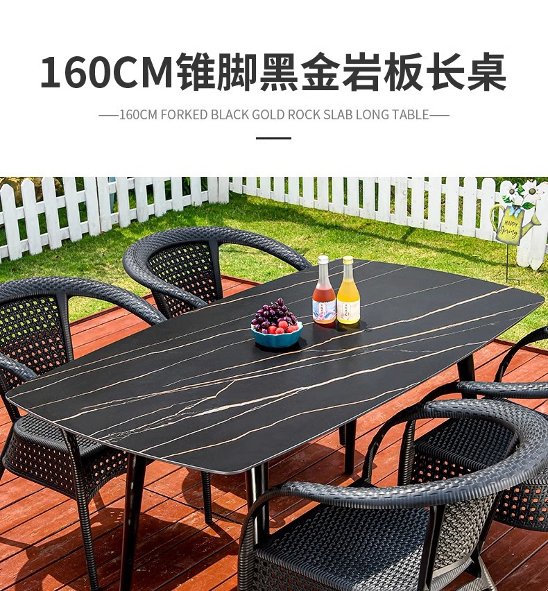 • 로마 의자 6개 + 180x90cm 포크 다리 블랙 골드 슬레이트 롱 테이블