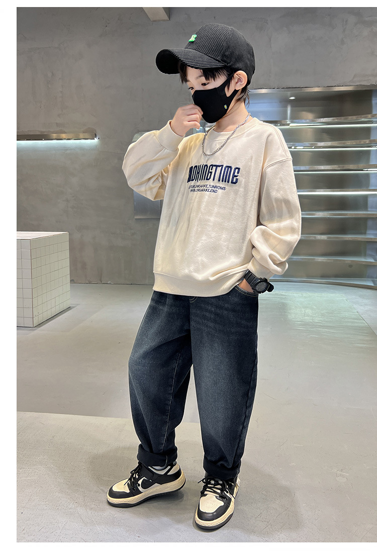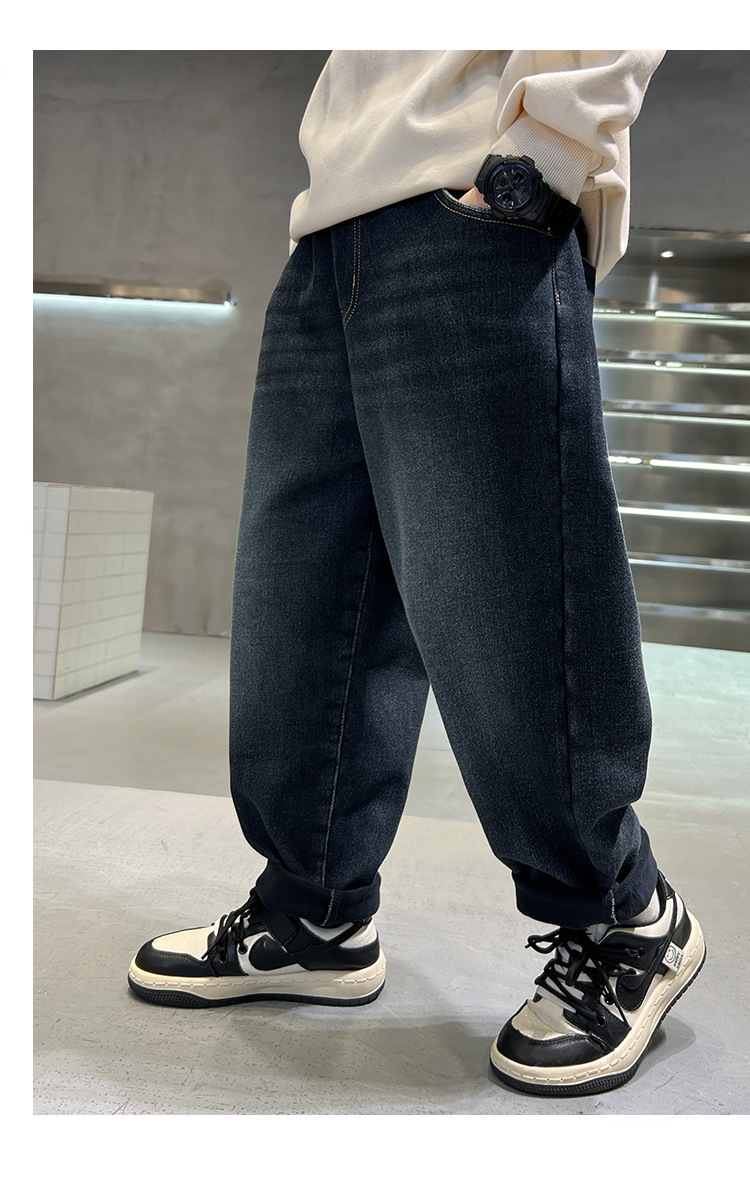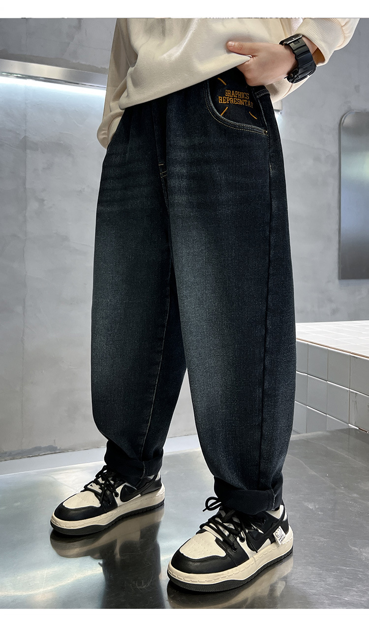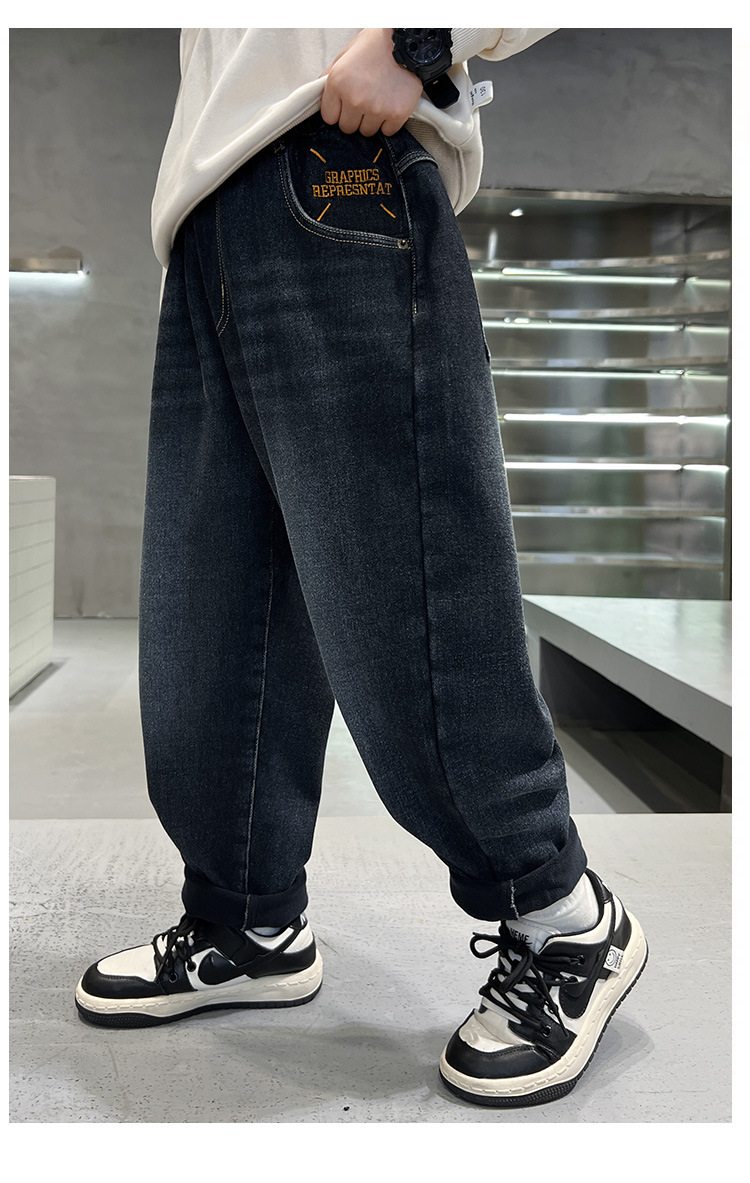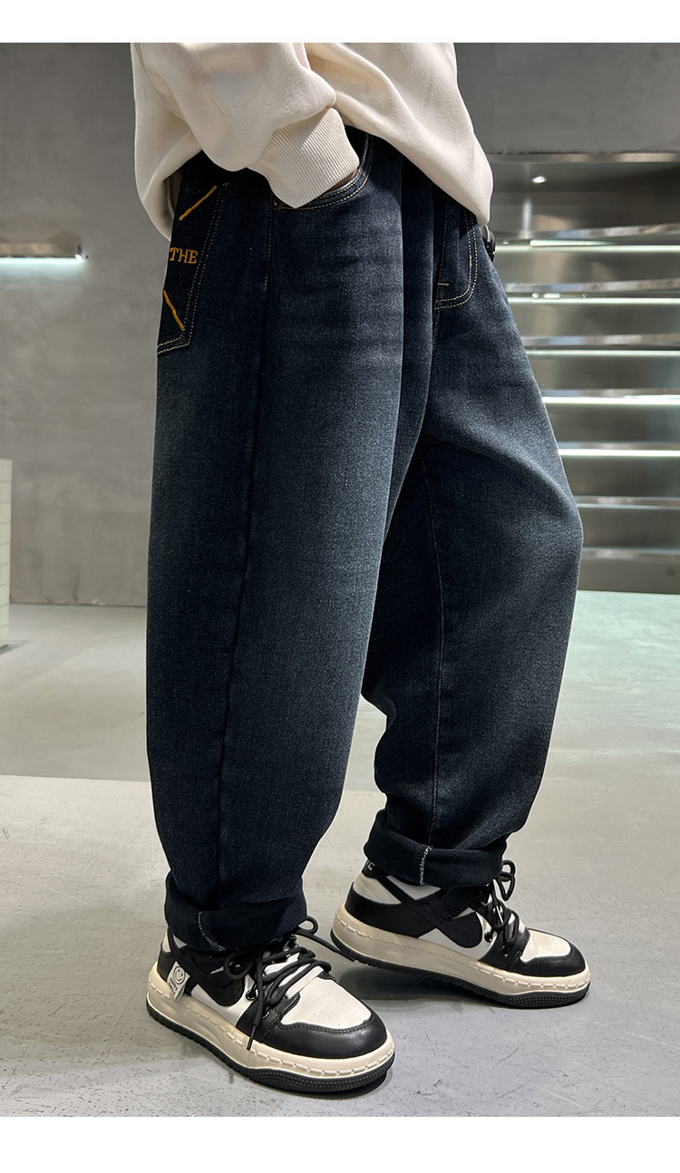 어린이 바지 기모 가을 겨울 새 도착 소년 한국식 포켓 자수 기모 청바지 큰 어린이 바지