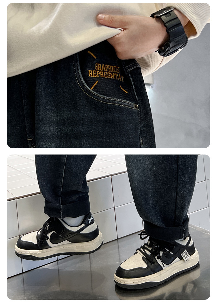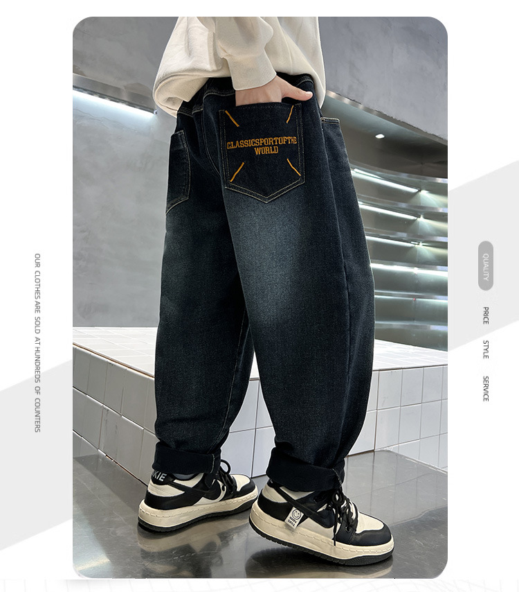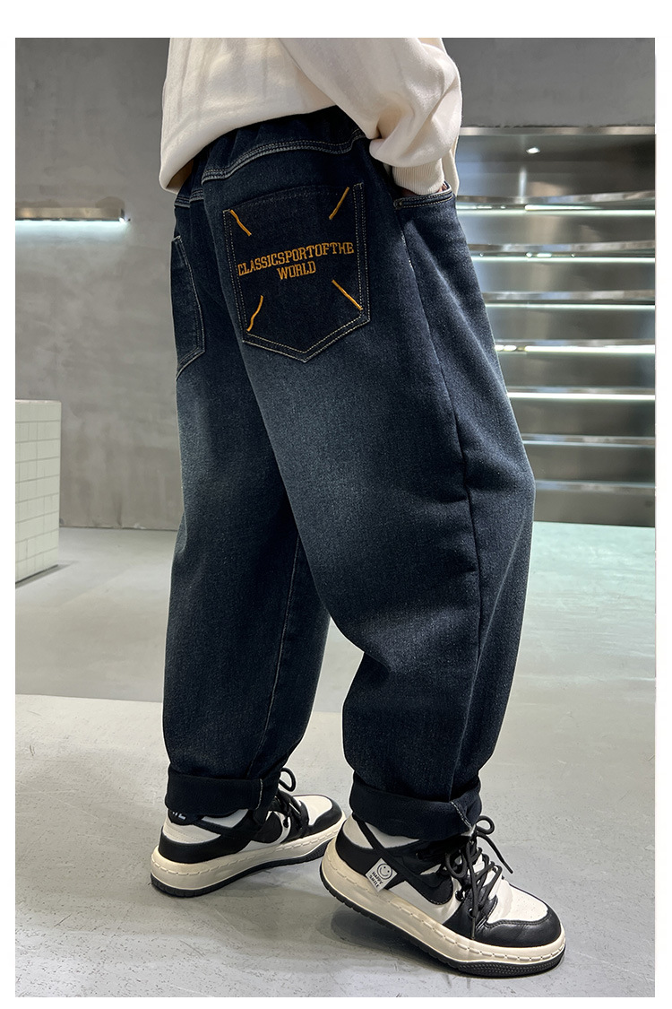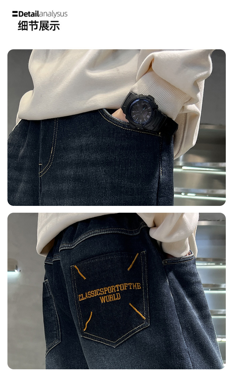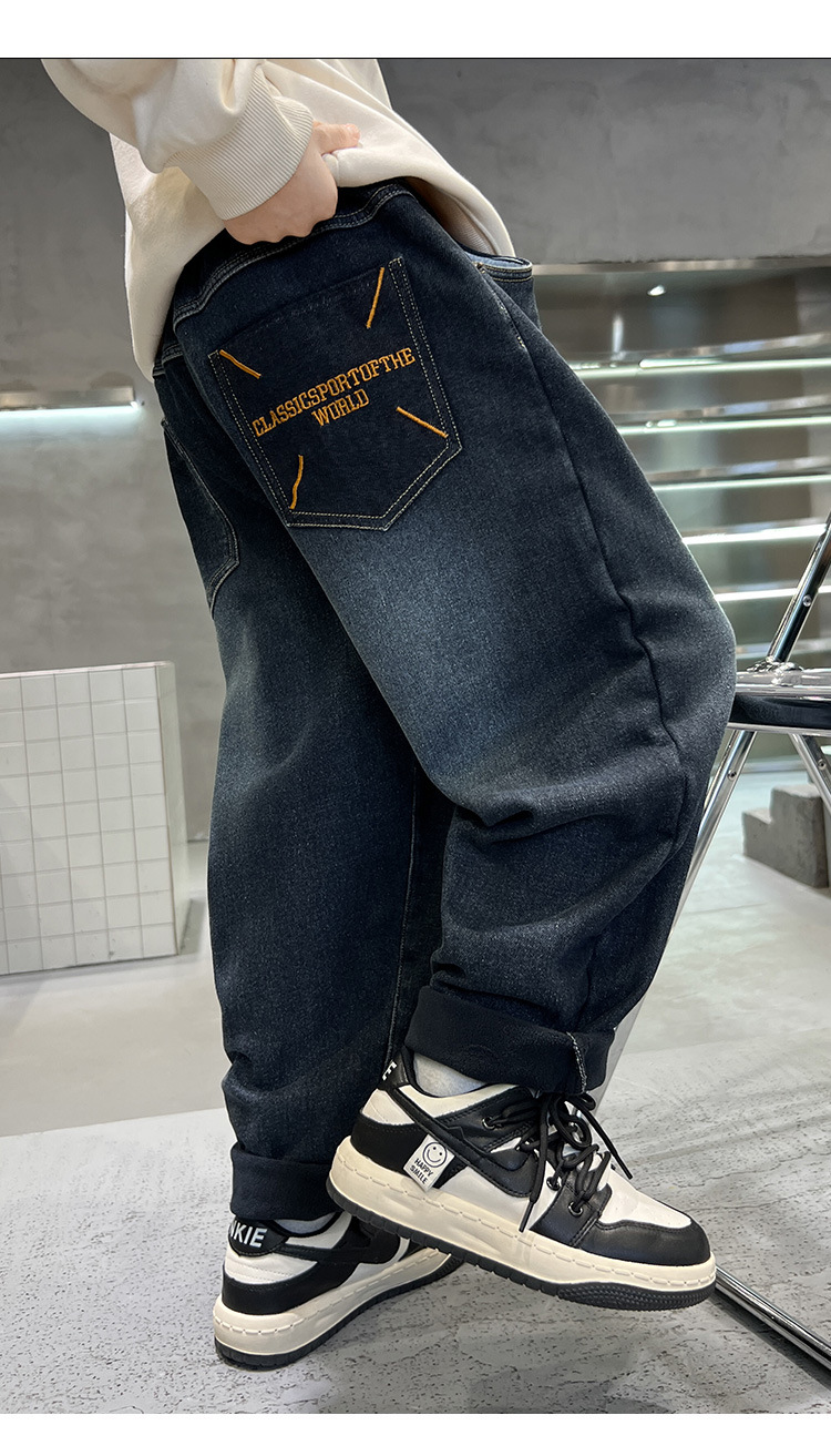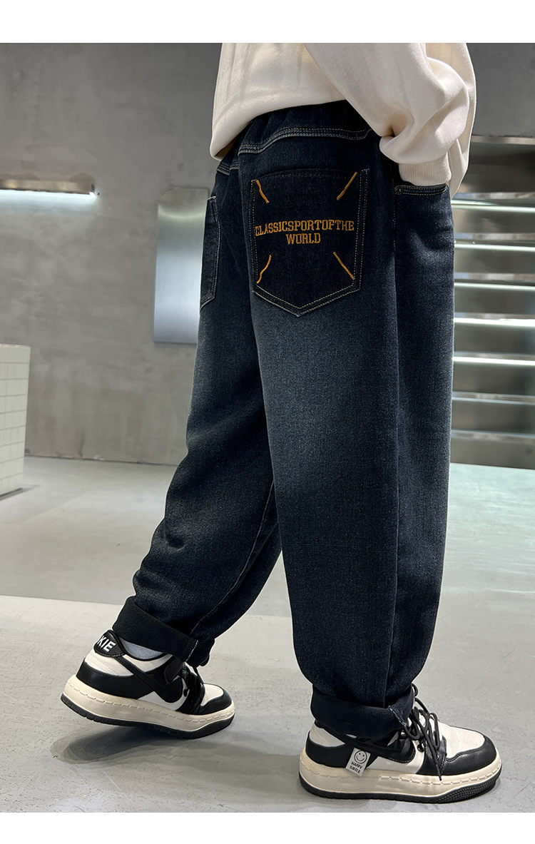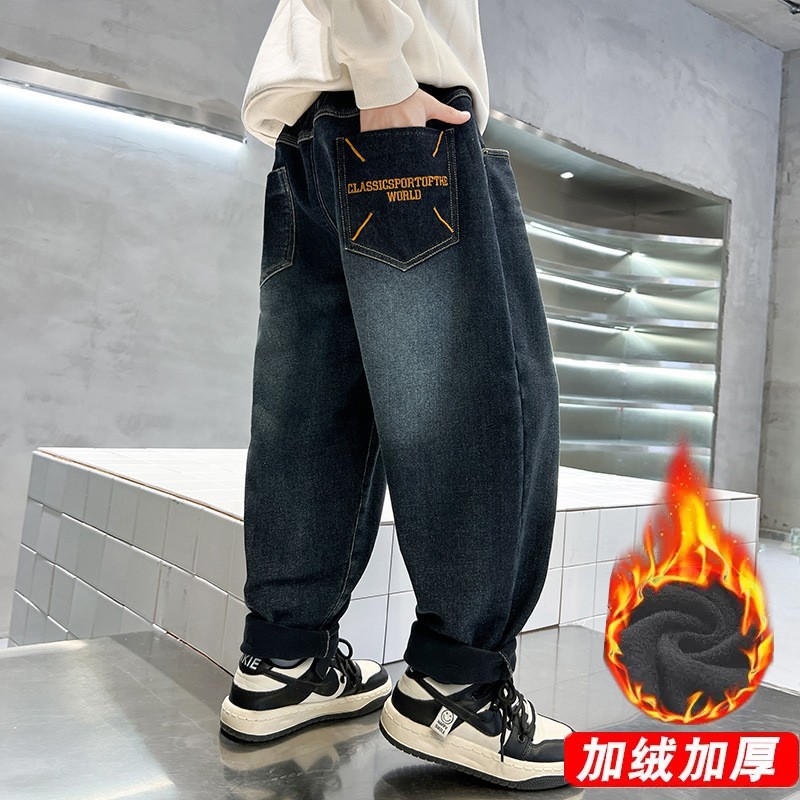 어린이 바지 기모 가을 겨울 새 도착 소년 한국식 포켓 자수 기모 청바지 큰 어린이 바지스토어 가기
