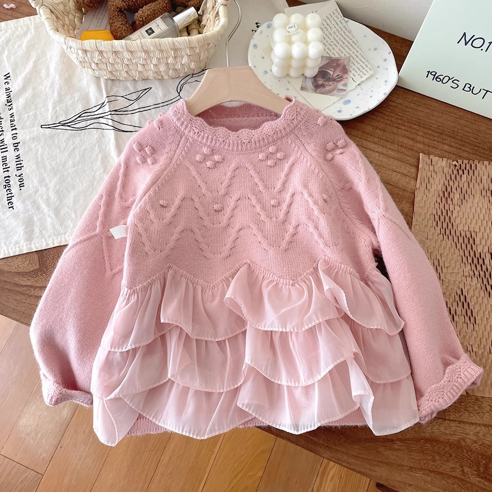 아기 소녀 레이스 스웨터베이스 셔츠 2024 새로운 여성의 가을과 겨울 어린이 스웨터 서양식 두꺼운 스웨터 트렌디