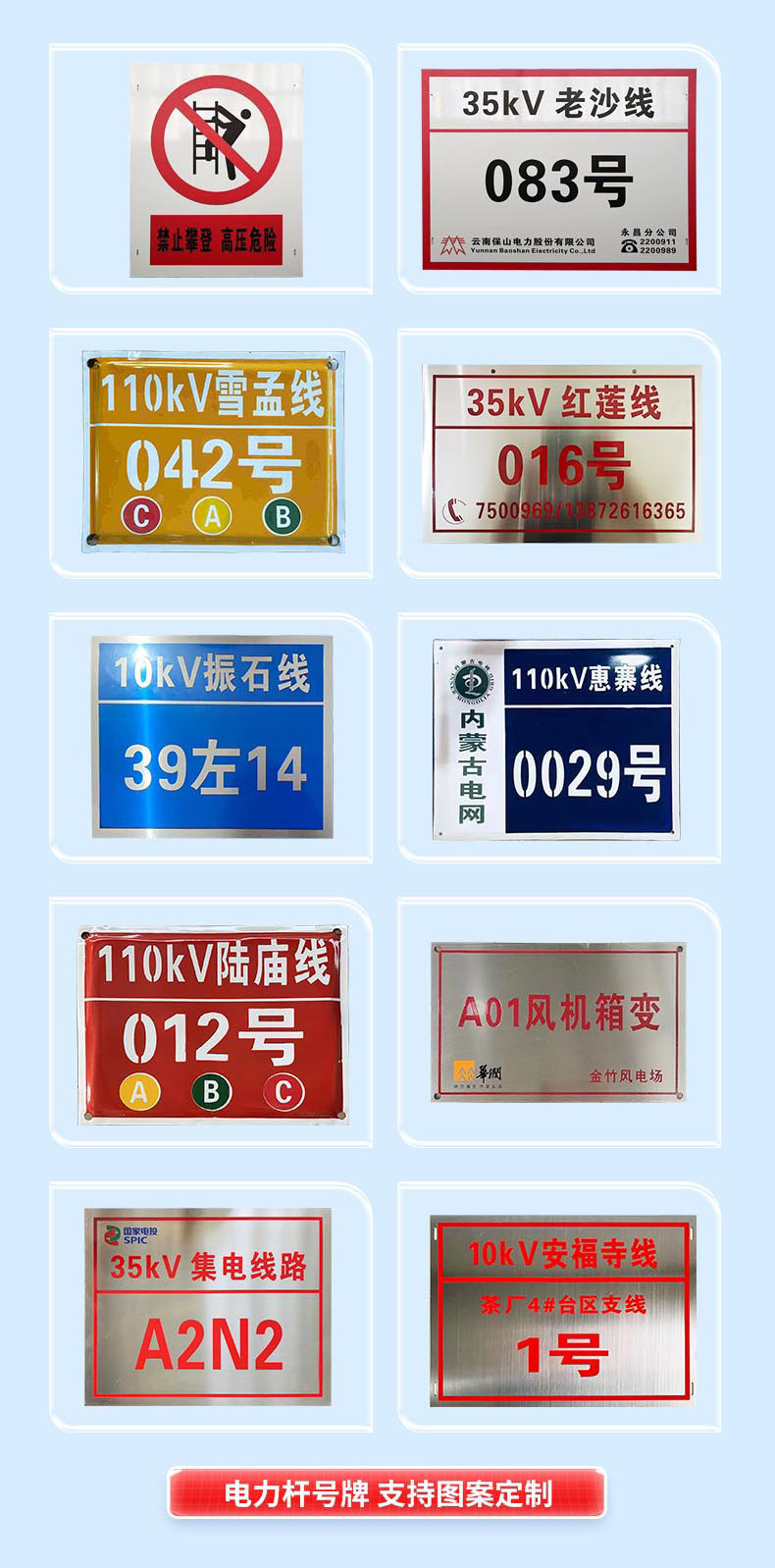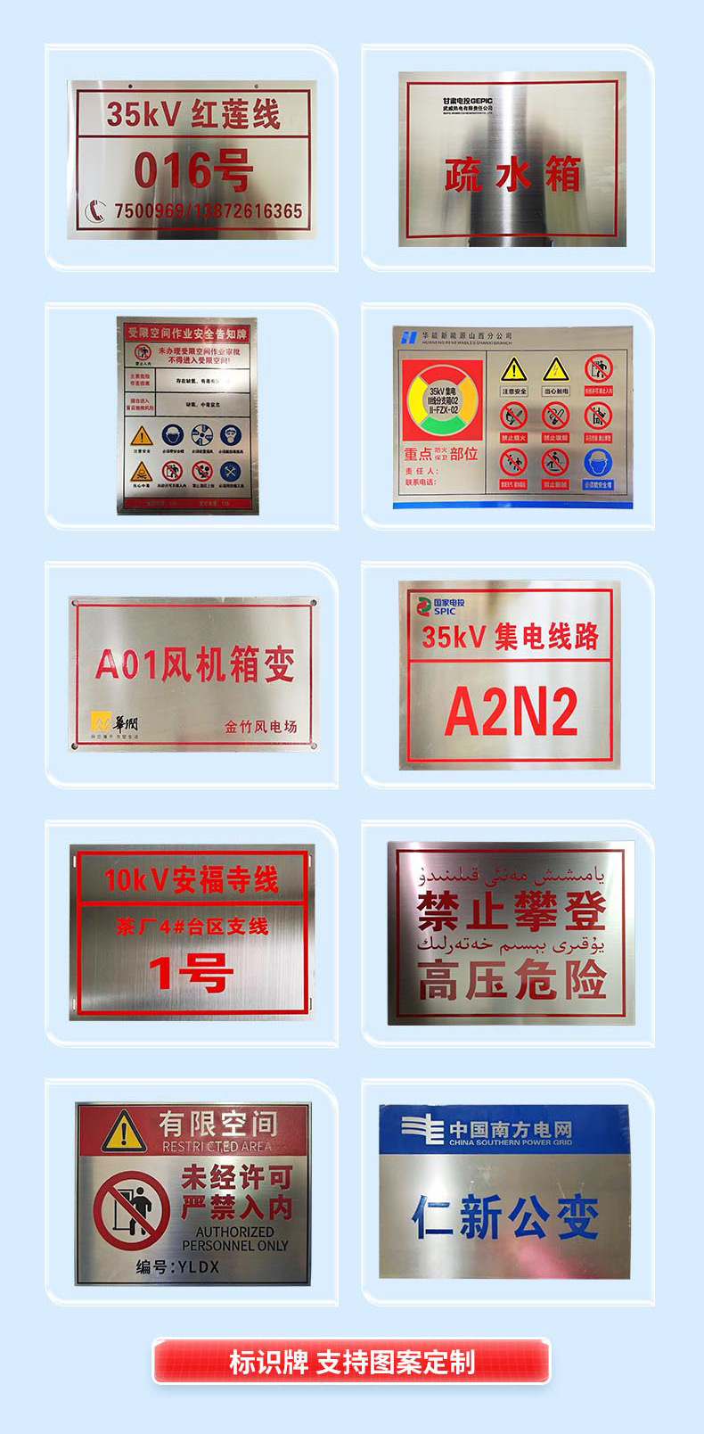 전원 표시, 경고 표시, 알루미늄 표시, 스테인레스 스틸 부식 표시, 타워 번호판, 극 번호판, 경고 표시