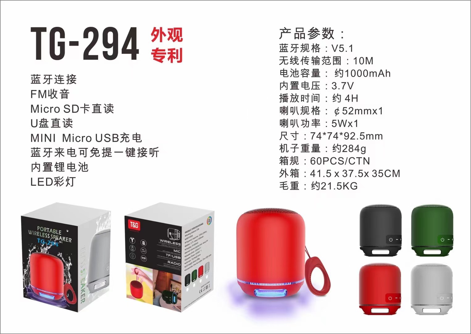 새로운 TG294 블루투스 스피커 선물 카드 오디오 LED 빛 야외 휴대용 끈 휴대용 미니 서브 우퍼