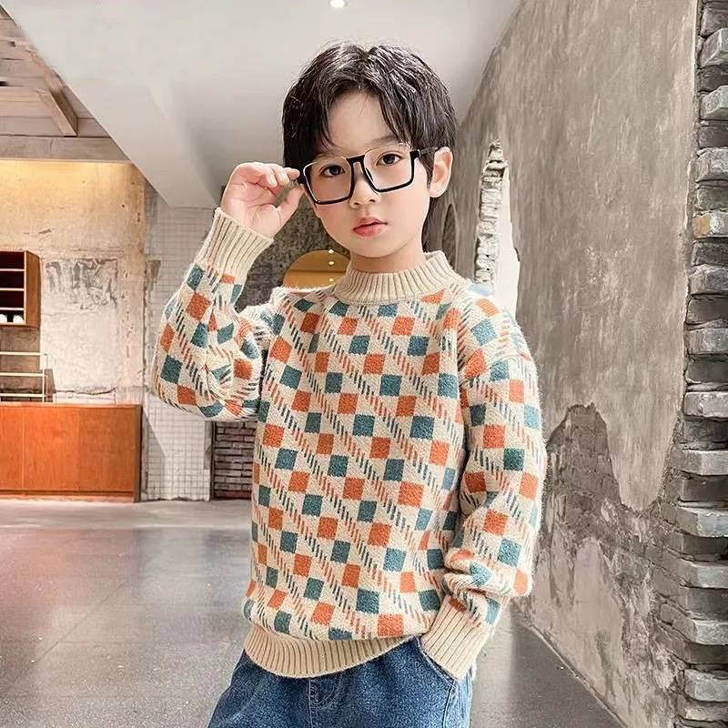 소년 격자 무늬 스웨터 2024 새로운 어린이 서양식 어린이 가을과 겨울 잘 생긴 스웨터 아기의 봄과 가을 탑스토어 가기