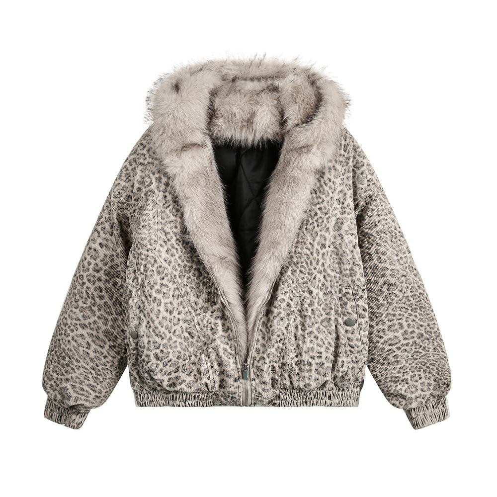 레오파드 무늬 후드 코튼 패딩 재킷 두꺼운 겨울 트렌디 브랜드 남성 유럽과 미국의 모조 모피 잔디 칼라 느슨한 짧은 코튼 패딩 재킷스토어 가기