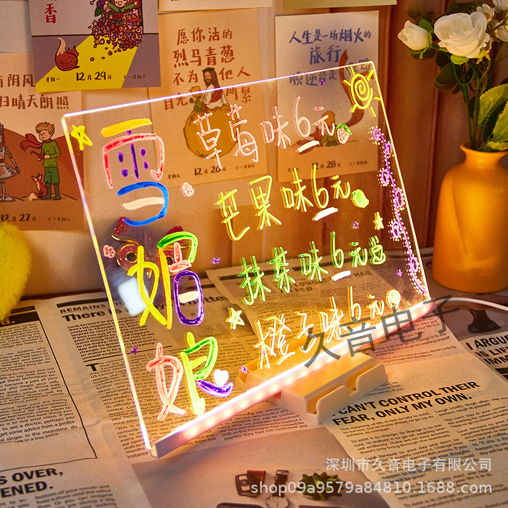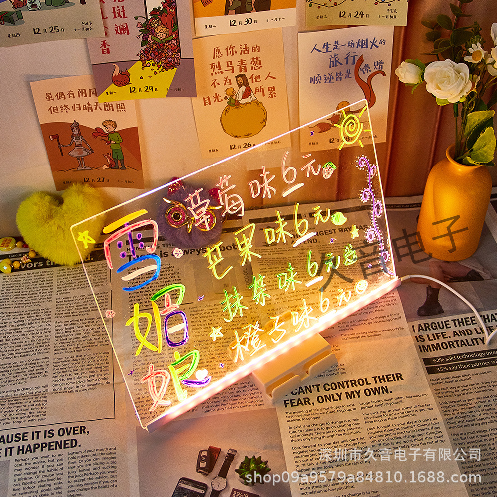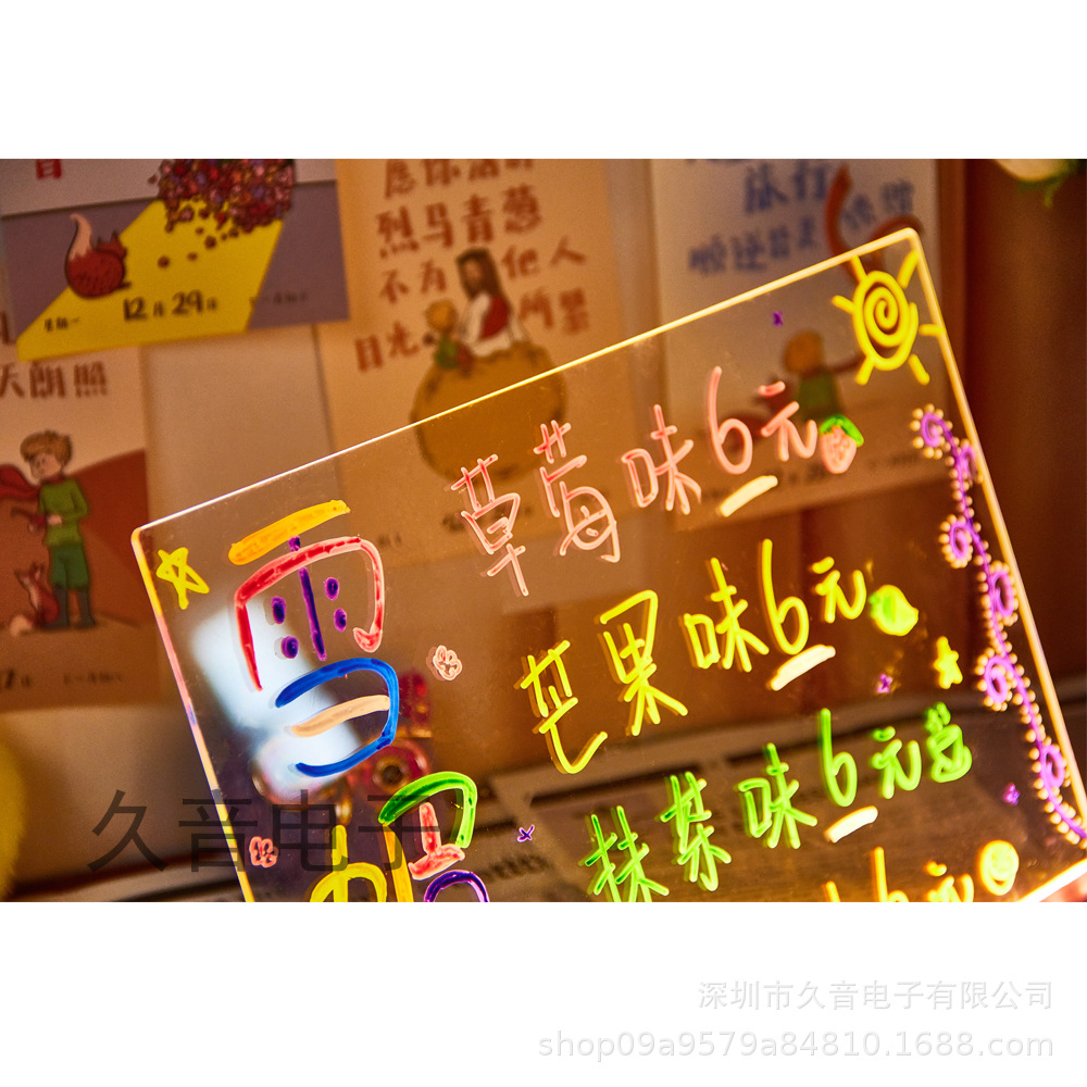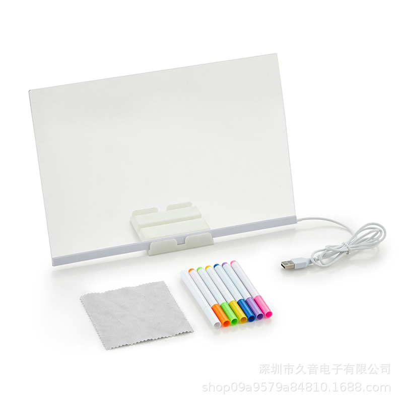 配件:彩盒包装+亚克力发光板+支架+7彩荧光笔+擦拭布
