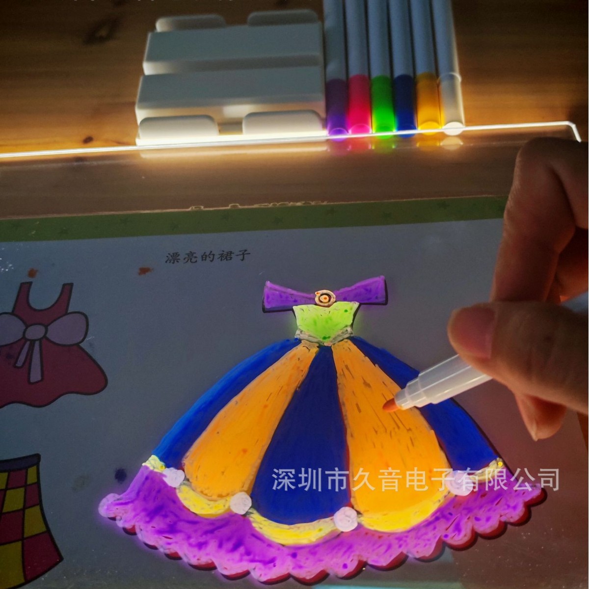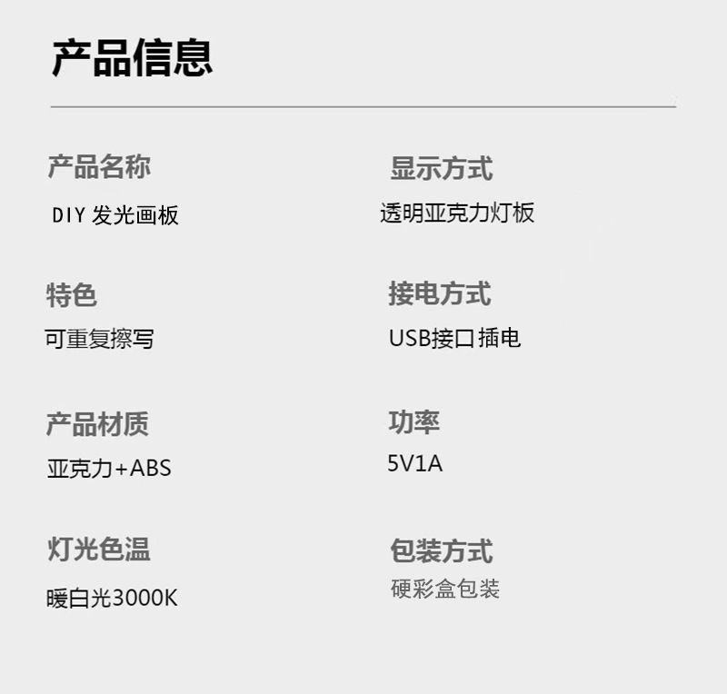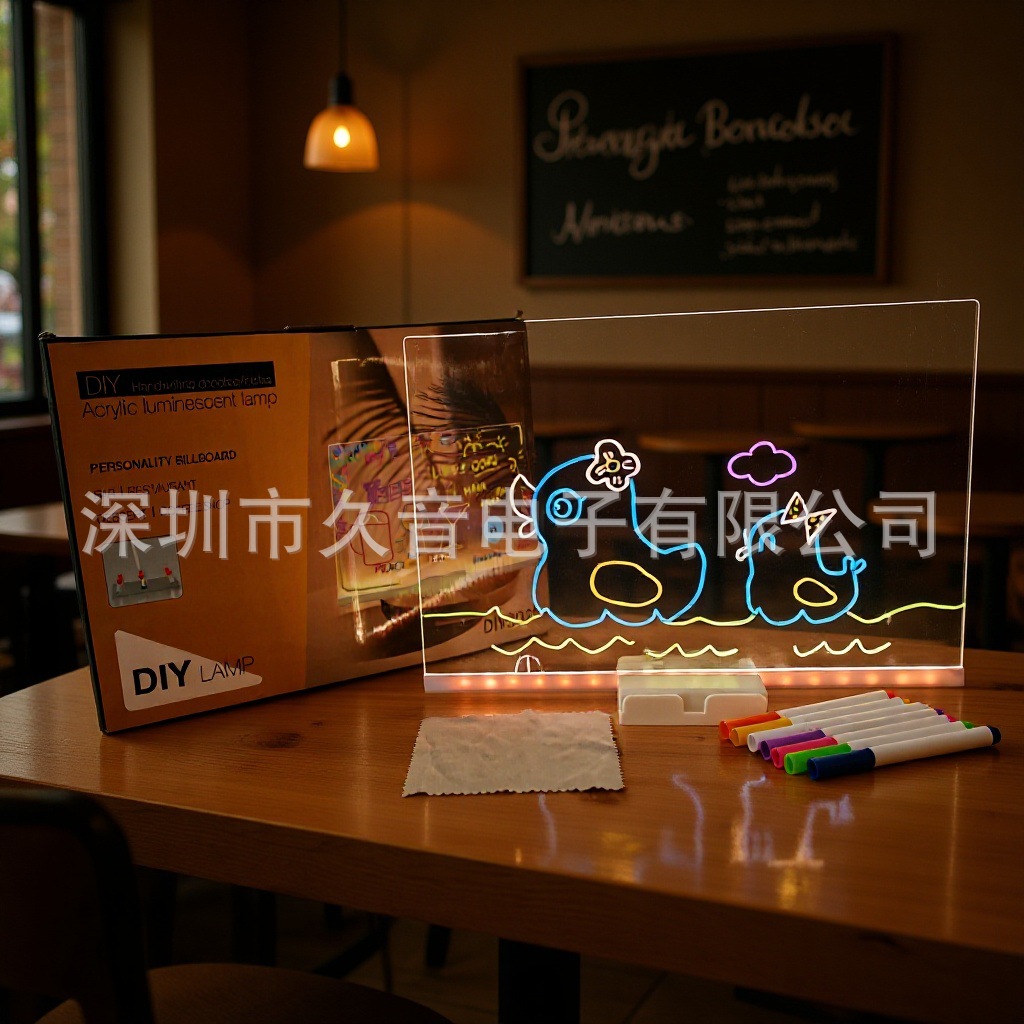 配件:彩盒包装+亚克力发光板+支架+7彩荧光笔+擦拭布