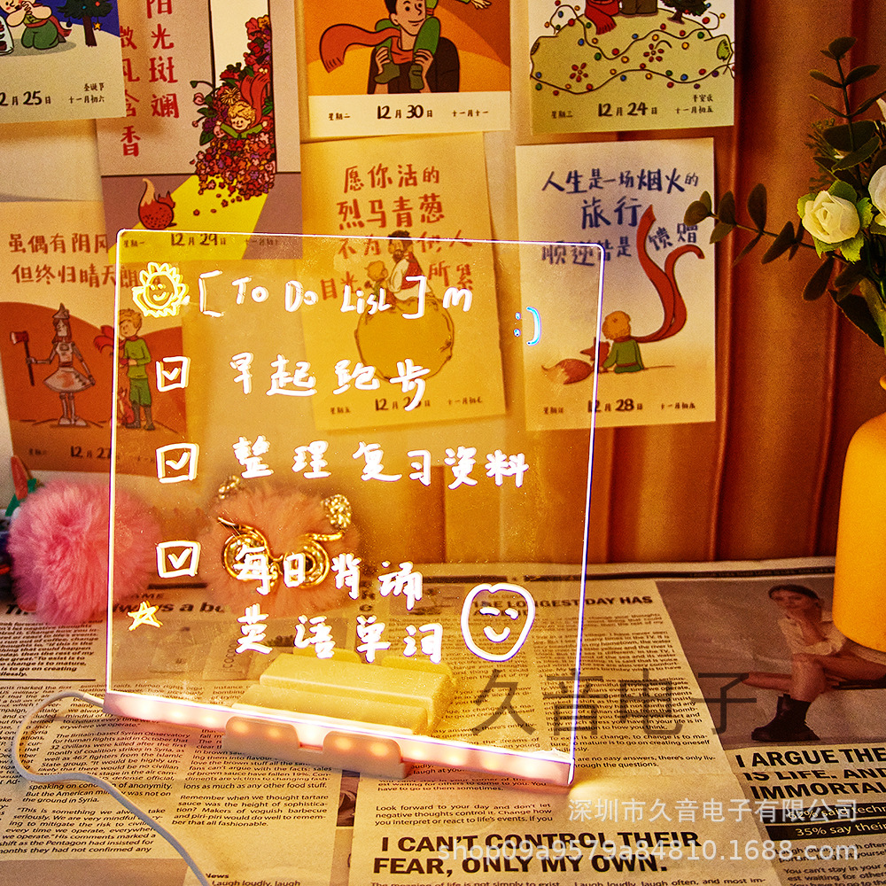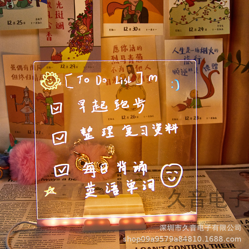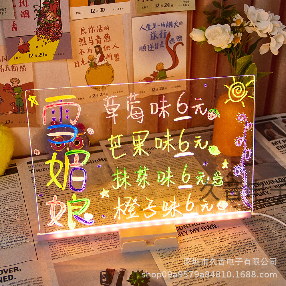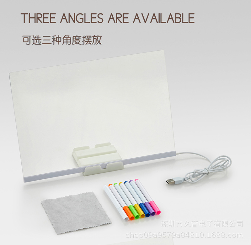 备注:使用前请撕掉发光板双面保护膜,如果写的内容摆放时间过长字迹干了,请先用湿布擦,然后再用干布或纸巾擦拭干(擦拭布可洗)