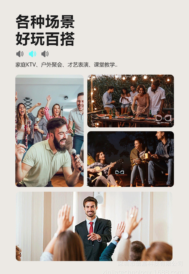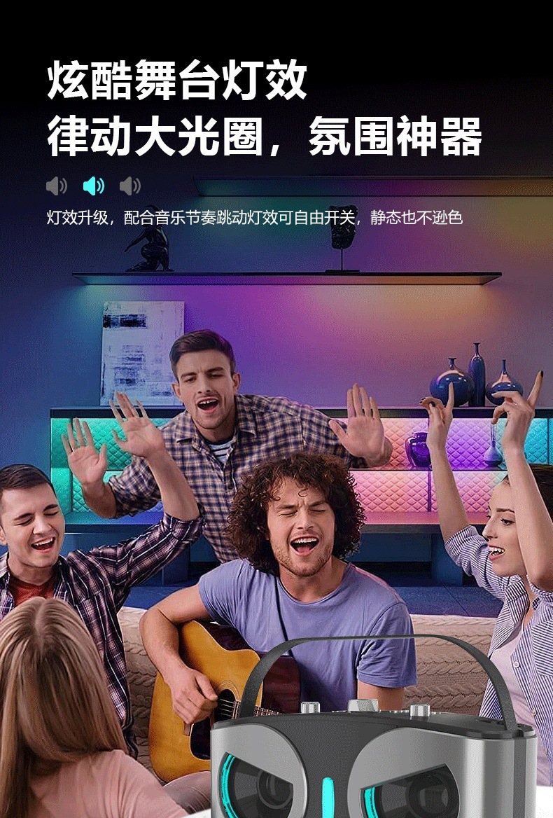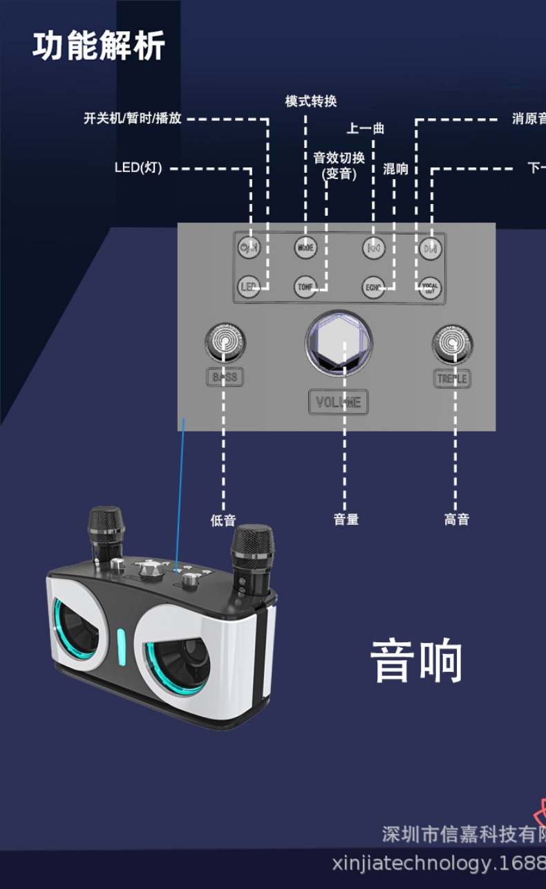 产品功能:蓝牙、TF卡、 USB 、AUX 、 K歌、 LED灯、 变音魔音、消原音