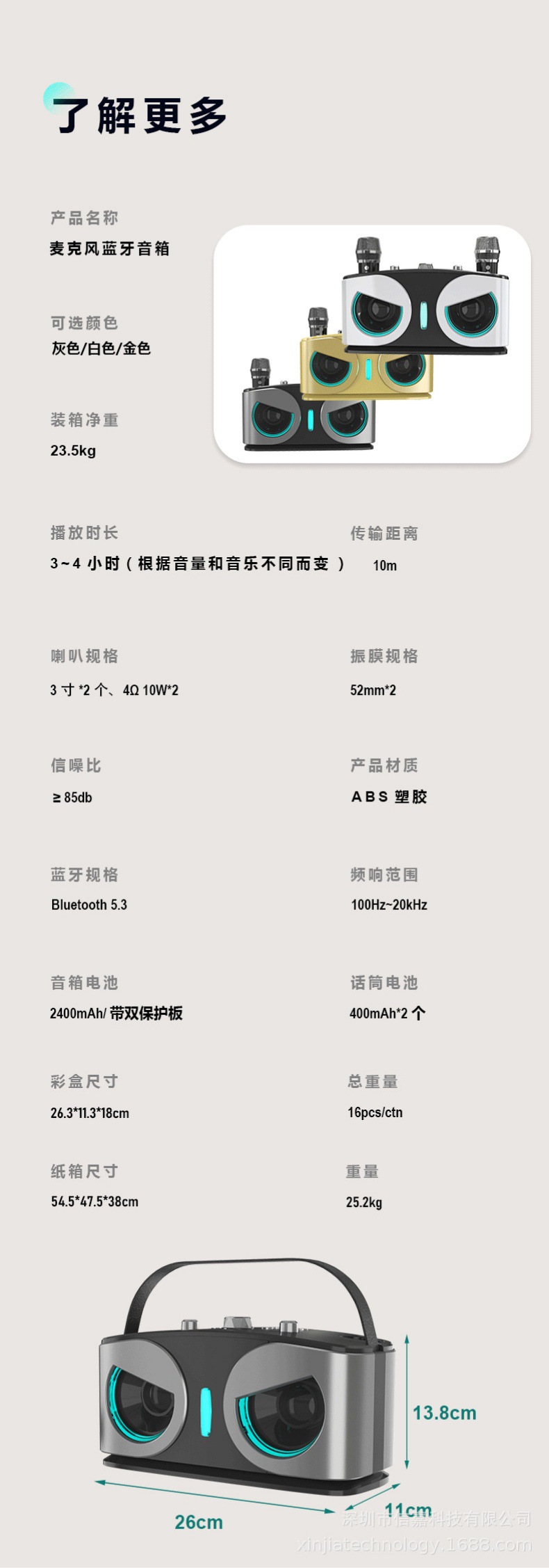 喇叭规格:3寸*2个、4Ω 10瓦