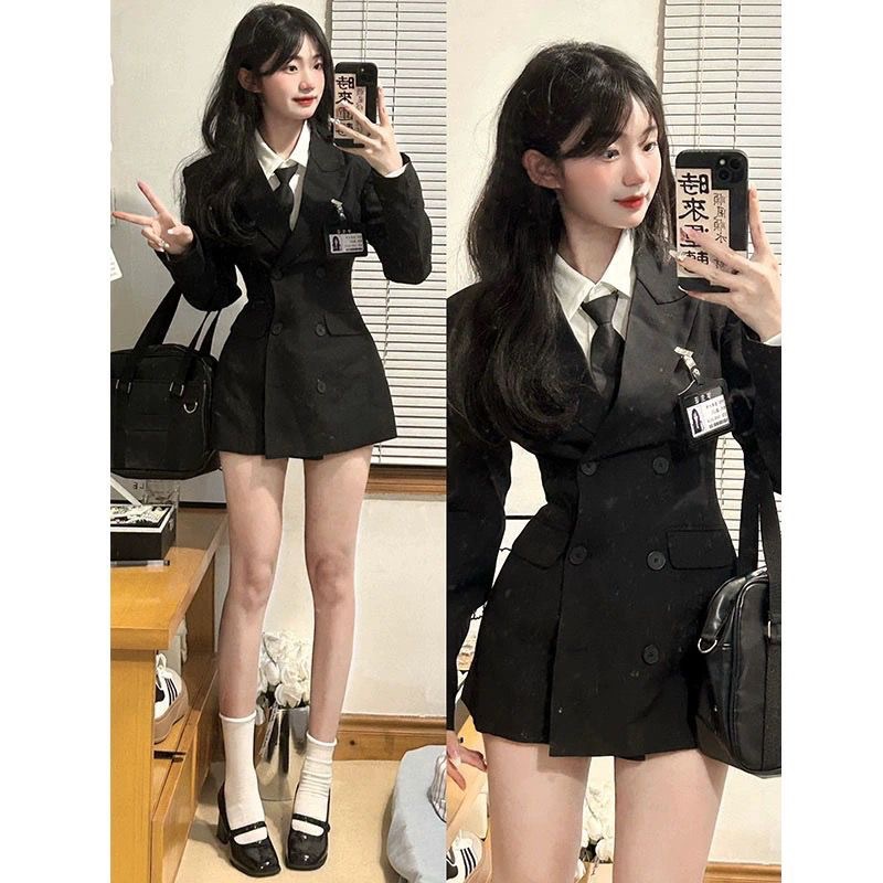 한국 드라마 아카데미 스타일 세트 세트 원피스 여자 가을 겨울 jk 유니폼 허리 세트 코트 셔츠 엉덩이 스커트 3 피스 세트