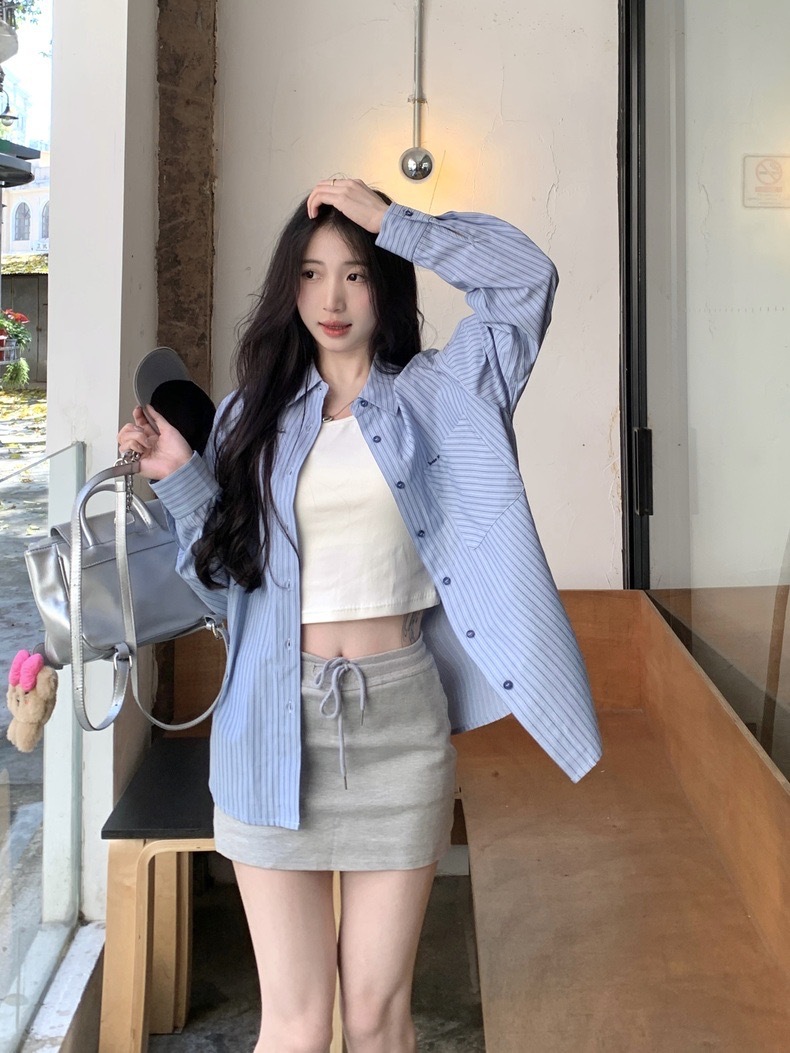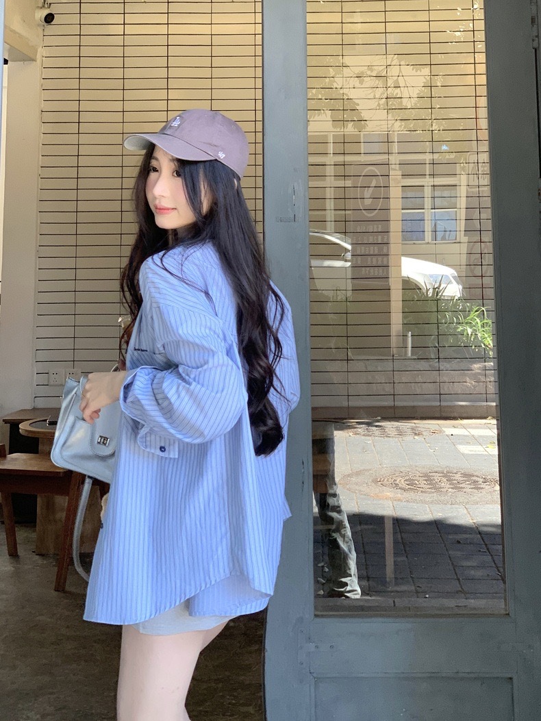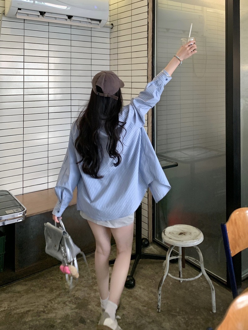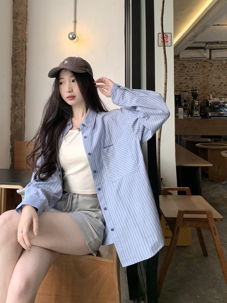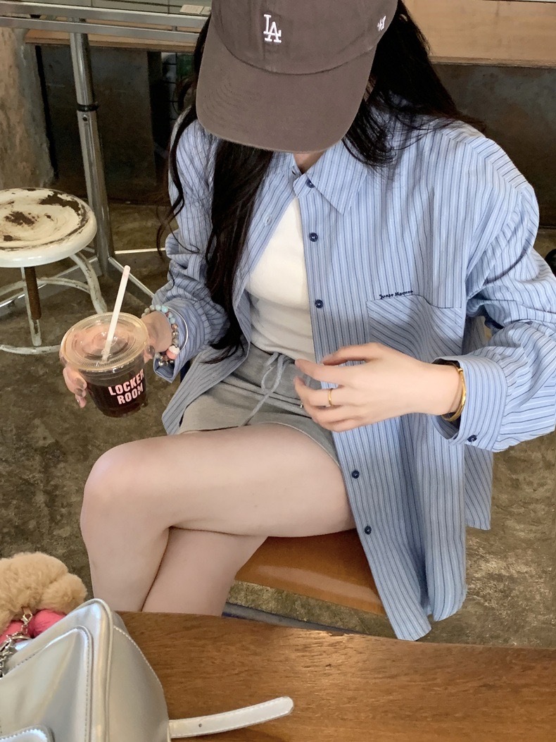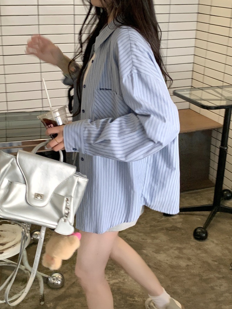 블루 스트라이프 셔츠 여성의 봄과 가을 새로운 디자인 센스 틈새 자수 캐주얼 긴팔 셔츠 느슨한 슬리밍 탑스토어 가기