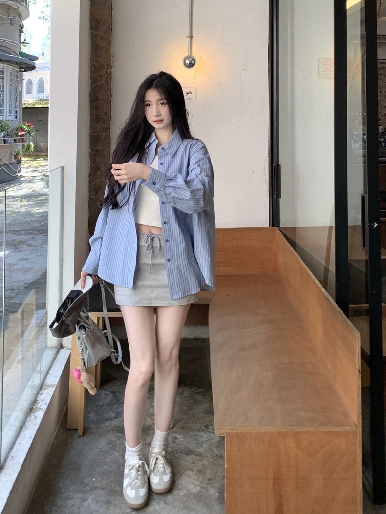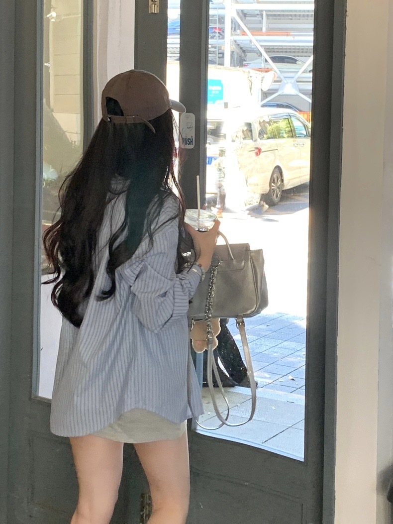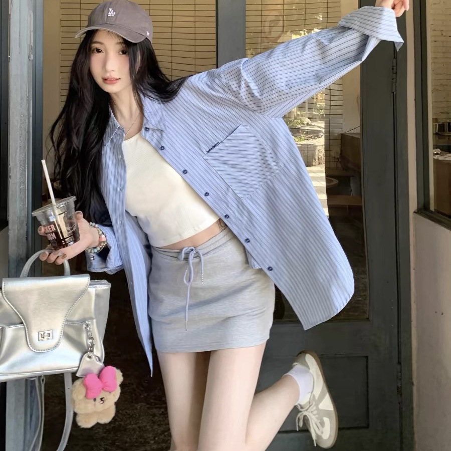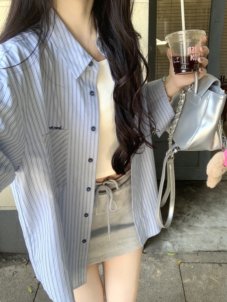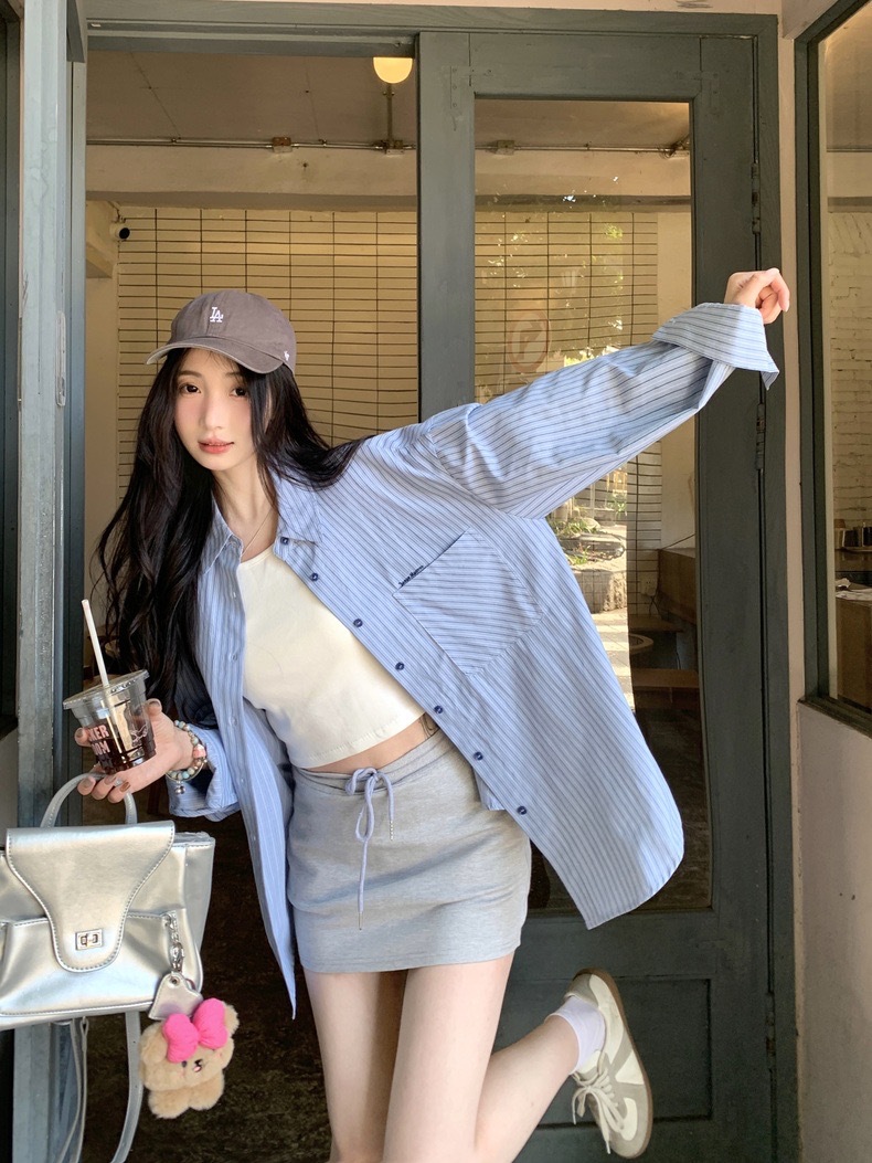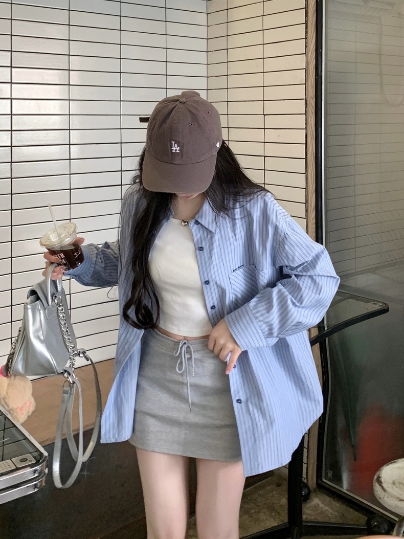 블루 스트라이프 셔츠 여성의 봄과 가을 새로운 디자인 센스 틈새 자수 캐주얼 긴팔 셔츠 느슨한 슬리밍 탑스토어 가기