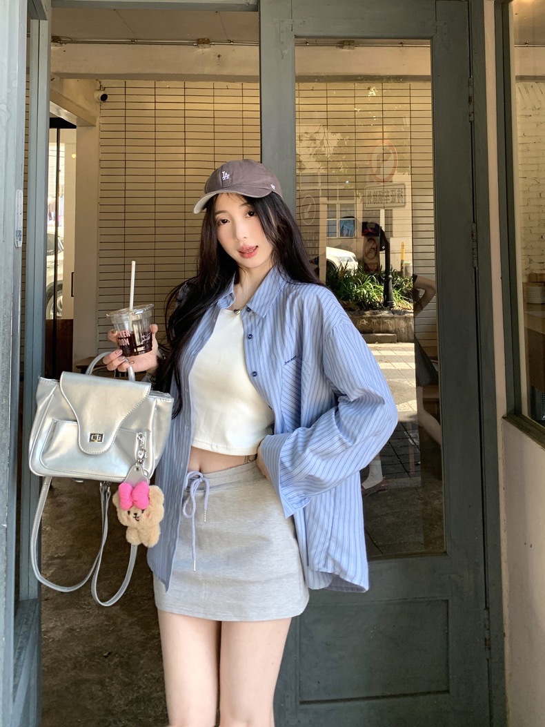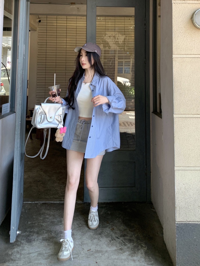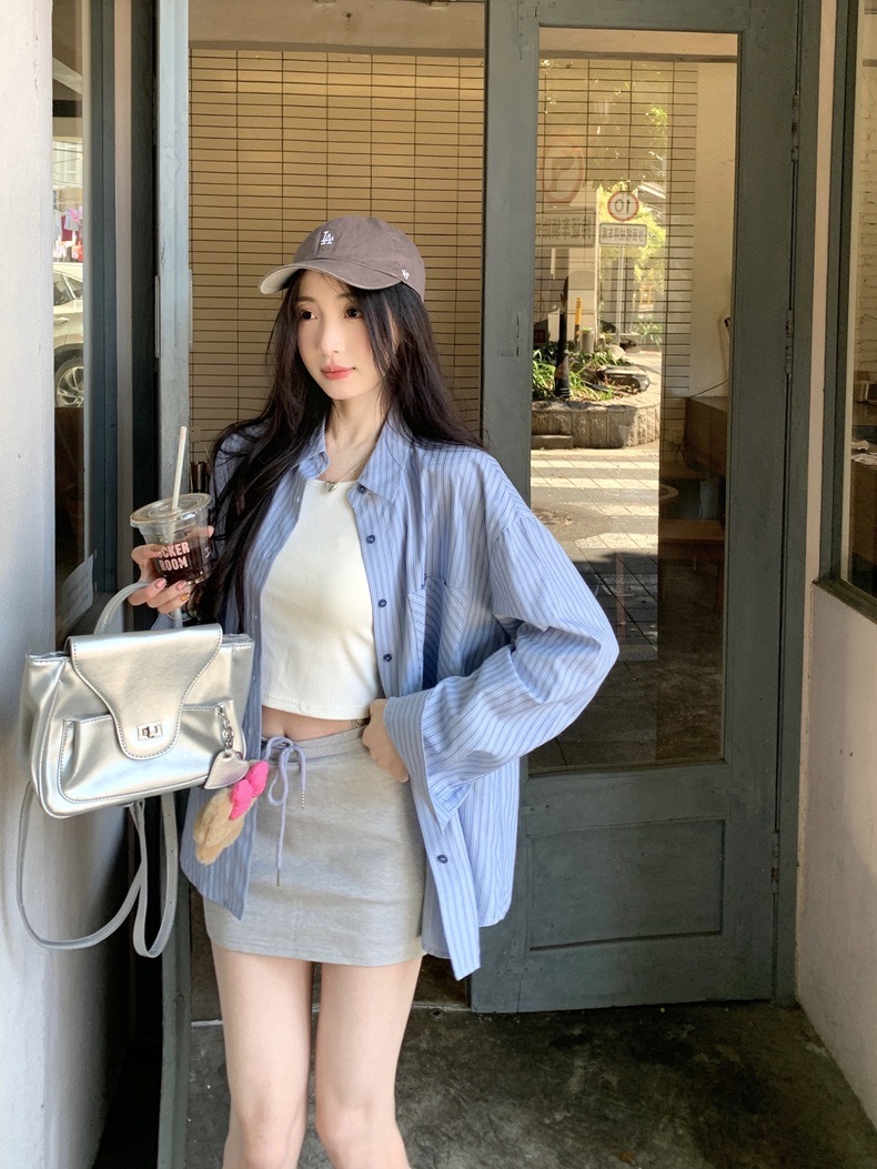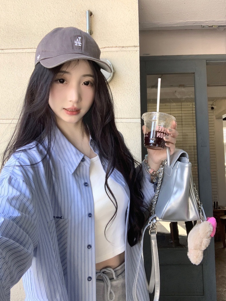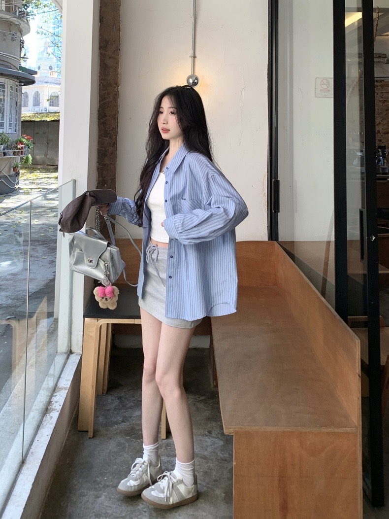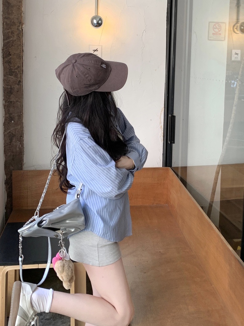 블루 스트라이프 셔츠 여성의 봄과 가을 새로운 디자인 센스 틈새 자수 캐주얼 긴팔 셔츠 느슨한 슬리밍 탑스토어 가기